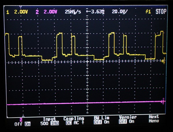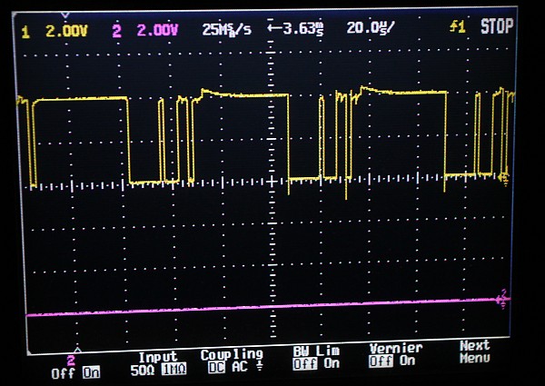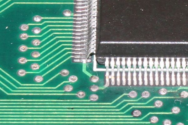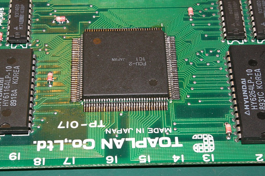 {Fehlerbeschreibung} Grafikfehler auf einer Fire Shark Platine: die Sprites sind nur zu 50% vorhanden, jede zweite Zeile fehlt. Besonders deutlich im Detail zu sehen: es sind nur die Sprites betroffen, Tiles (Text und Hintergrund) sind in Ordnung. {Analyse} An der Platine ist vom Vorbesitzer schon viel rumgebastelt worden, allerdings sehr professionell. Drei TTLs wurden getauscht, die Custom Chips sauber nachgelötet. Auf vielen Bausteinen finden sich Lotreste, da hat wohl wer schon Messtrippen angelötet... Ein erster Verdacht auf eine Lötbrücke erwies sich als unbegründet: hier ist tatsächlich eine Leiterbahn zwischen den Kontakten. {Analyse Teil 2} Also bleibt nur noch das Oszi, um Probleme bei den Signalen festzustellen. In der folgenden Übersicht habe ich mal die für die Spriteerzeugung wichtigen Bereiche markiert. Hellblau sind die Sprite-ROMs, hier sind die Grafikdaten abgelegt. Die Sprites werden alternierend Zeile für Zeile in zwei schnelle RAMs geschrieben. Rosa ist für die ungeraden Zeilen zuständig, hellviolett für die geraden Zeilen. Der rosa Bereich funktioniert nicht richtig, daher fehlt jede zweite Zeile. Gelb markiert sind die Reparaturen vom Vorbesitzer. Der rote Kasten bei den GFX-ROMs ist ein voreinstellbarer Zähler, der die Spritedaten auszählt, eine der Adressleitungen (A7) ist unsauber und könnte auch schon Probleme machen (siehe Bilder). Der zweite rote Kasten in der Sprite-Daten-Pipeline markiert einen 8fach FlipFlop, der die Sprite-Daten Byteweise zwischenspeichert... da sind die Datenpegel korrupt. Schön, dss man hier zwei identische Systeme zum Vergleich hat. Das erleichtert die Fehlersuche, auch wenn es keinen Schaltplan gibt. {Analyse Teil 3} Nun ist es soweit: der Fehler will nicht von mir gefunden werden! Nachdem ich probeweise die Sprite-EPROMs entfernt habe, waren die Sprites auf dem Bildschirm nicht wie erwartet solide Farbblöcke sondern ebenfalls gestreifte Farbblöcke. Also liegt der Fehler nicht im Auslesen der Sprite-Daten, sondern in der Weiterverarbeitung. Ein Austausch des defekten 74ALS163 (4 Bit Zähler zur Sprite-Datenadressierung, kleiner roter Kasten) hat zwar das Signal verbessert, aber sonst keinen Effekt gezeigt. Ein Austausch des Vierfach-Latches 74LS173 (kleiner oranger Kasten) zeigte ebenfalls keine Wirkung. Am Sprite Generator Custom (FCU-2, großer roter Kasten) war ein Datenpin nicht richtig verlötet, das hat man über das Oszi erkennen können. Die Reparatur machte die Farben schöner, aber die Streifen blieben. Ein Triggern auf den 15kHz Zeilenwechsel sollte eigentlich zeigen, welche Daten in jedem zweiten Zyklus fehlen, hat es aber nicht. Alle Daten wirken einwandfrei, bis sie im Tilegenerator-Custom BCU-3 (großer oranger Kasten) verschwinden. Nun weiß auch ich nicht mehr weiter. Nach geschätzten 6-7 Stunden Gesamtarbeitszeit erkläre ich den Patienten für nicht heilbar. :-( |