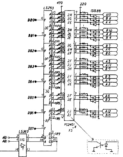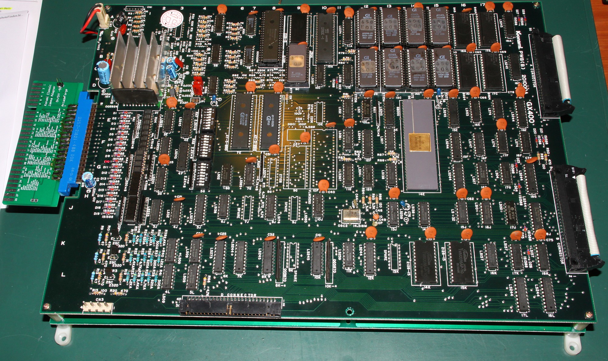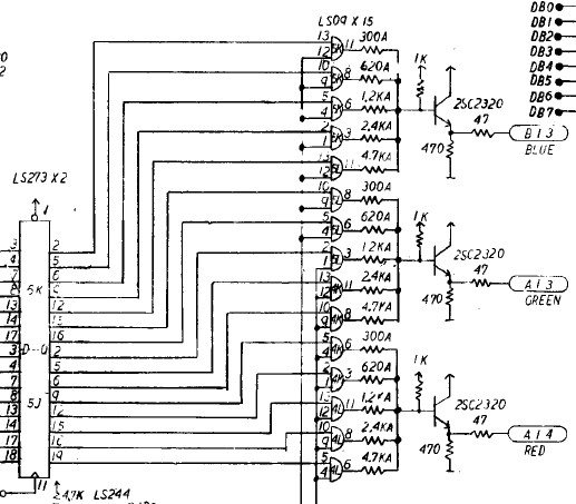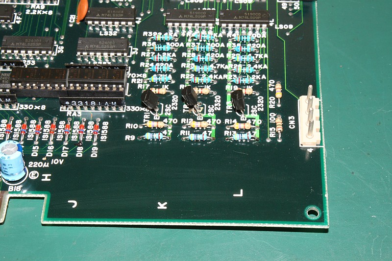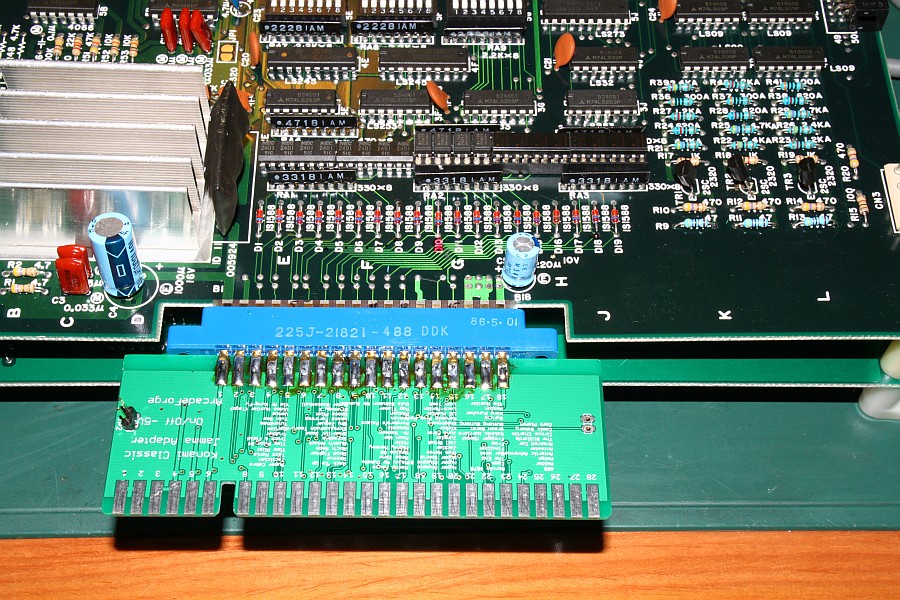 {Fehlerbeschreibung} Die Farben sind zu dunkel, im Schwarz leicht rötlich, wenn man hell aufdreht. Außerdem ist einer der Buttons daueraktiv (Item-Select, sehr lästig...), damit wird man ganz schnell ganz schnell, weil das Speedup Item das erste ist.... {Diagnose} Wer findet den ersten Fehler? {Reparatur 1} Klar: 330 statt der nötigen 47 Ohm, da hat wohl mein Vorgänger nicht die richtigen Werte in der Grabbelkiste gehabt! Die vielen verschiedenen Widerstände oben drüber sind die D/A-Wandler, danach die Videoverstärker für R, G und B mit Ausgangswiderstand 50 Ohm (47)... {Reparatur 2} Und schon sind die Farben wieder hell und klar, wie am ersten Tag. Und Nemesis ist eines der oldschool-Bonbon-bunten Games! Jetzt das Problem mit dem Select-Knopf. (ist es eigentlich normal, dass Nemesis Button 3 als Fire-Button benutzt?) Ein Blick auf den Konami-Adapter offenbart Grausames: hunderte von Platinen haben die Federkontakte ruiniert, bis hin zum Kurzschluss (15/O)... Aber daran lag es nicht: einer der Optokoppler hat einen Schuß, hätte man halt sofort alle austauschen sollen... {Ergebnis} PC817 ist ein Ersatz, die Original 2401 von NEC gibt es nicht mehr, noch nicht mal mehr ein Datenblatt... Schöne Farben, schöne Optokoppler - Patient lebt wieder. |