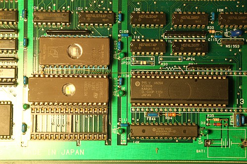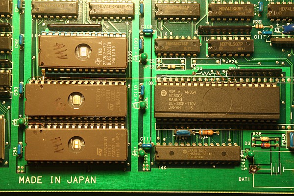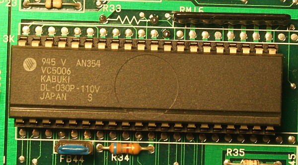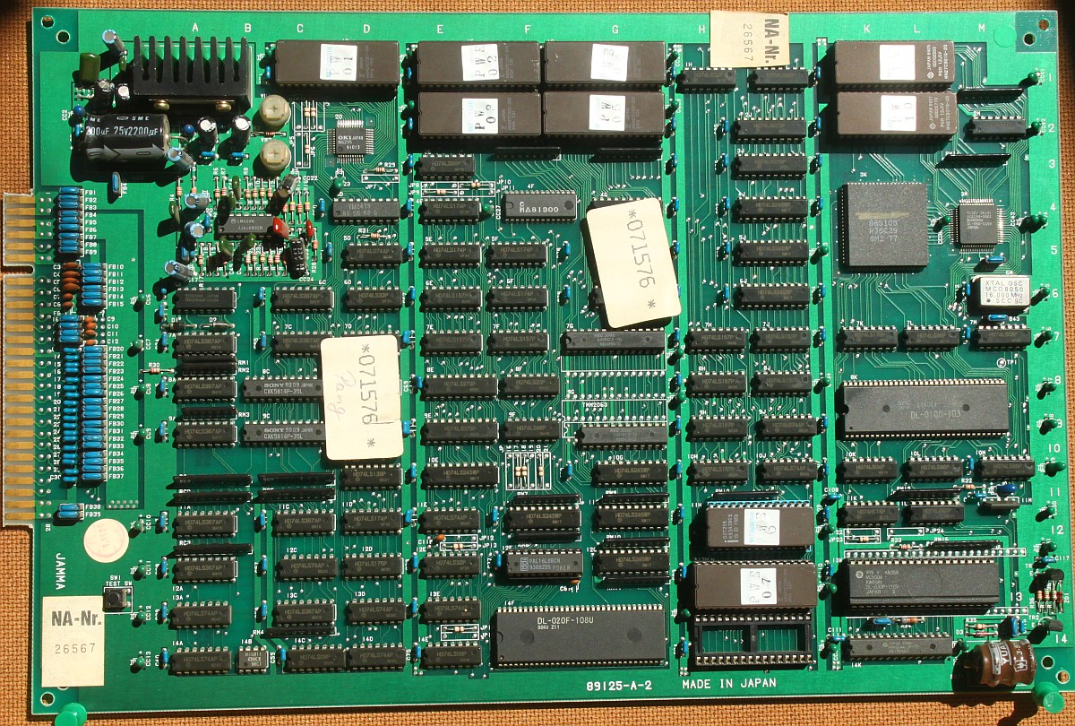 {Pang Resurrection} ...wie versprochen, für die Nachwelt die Bravo-Fotostory... Hier ist die Platine im Urzustand: angeblich Super Pang... Eine weitere der Spieleplatinen, die als Kopierschutz einen modifizierten Prozessor (KABUKI/Z80) mit verschlüsselten ROMs aufweisen. In einem statischen RAM ist eine Tabelle hinterlegt, die den verschlüsselten Code decodiert. Dieses RAM wird über einen Akku am Leben erhalten, wenn die Versorgungsspannung nicht anliegt. Ist der Akku leer, dann ist die Entschlüsselungstabelle weg und die Platine tot. Aber es gibt ja entschlüsselte ROMs... ;-) Die lassen sich übrigens vorzüglich auch ganz unten auf dieser Seite herunterladen, zusammen mit ein paar technischen Infos dazu.