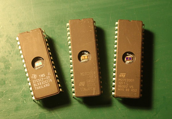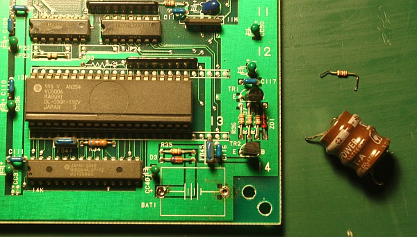 {Operation Wiederbelebung} Vorab: wichtige Hinweise und hilfreiche Downloads findet man unter dieser Webseite. Lötkolben, Draht, Werkzeuge und EPROMs zum Programmieren sollten bereit liegen und ein wenig Löterfahrung sollte man schon mitbringen! Der Akku ist immer mit Vorsicht zu genießen, sein Inhalt kann sich bei Beschädigung ätzend auf alles ergießen, was sich in der Nähe befindet. Die EPROMs werden mit den entschlüsselten Images von oben genannter Quelle gebrannt. Das EPROM 27C301 (1Mbit) wird ersetzt durch ein 27C020 (2Mbit) und 27256 (256kbit) wird durch ein 27C512 ersetzt. Die nun zusätzlichen Adressleitungen (die Eproms sind jetzt doppelt so groß und haben daher eine zusätzliche Adressleitung) werden mit dem KABUKI (Z80) Ausgang M1# verbunden: 27C020 Pin 30 (A17) und 27C512 Pin 1 (A15) an Z80 Pin 27 (M1#).