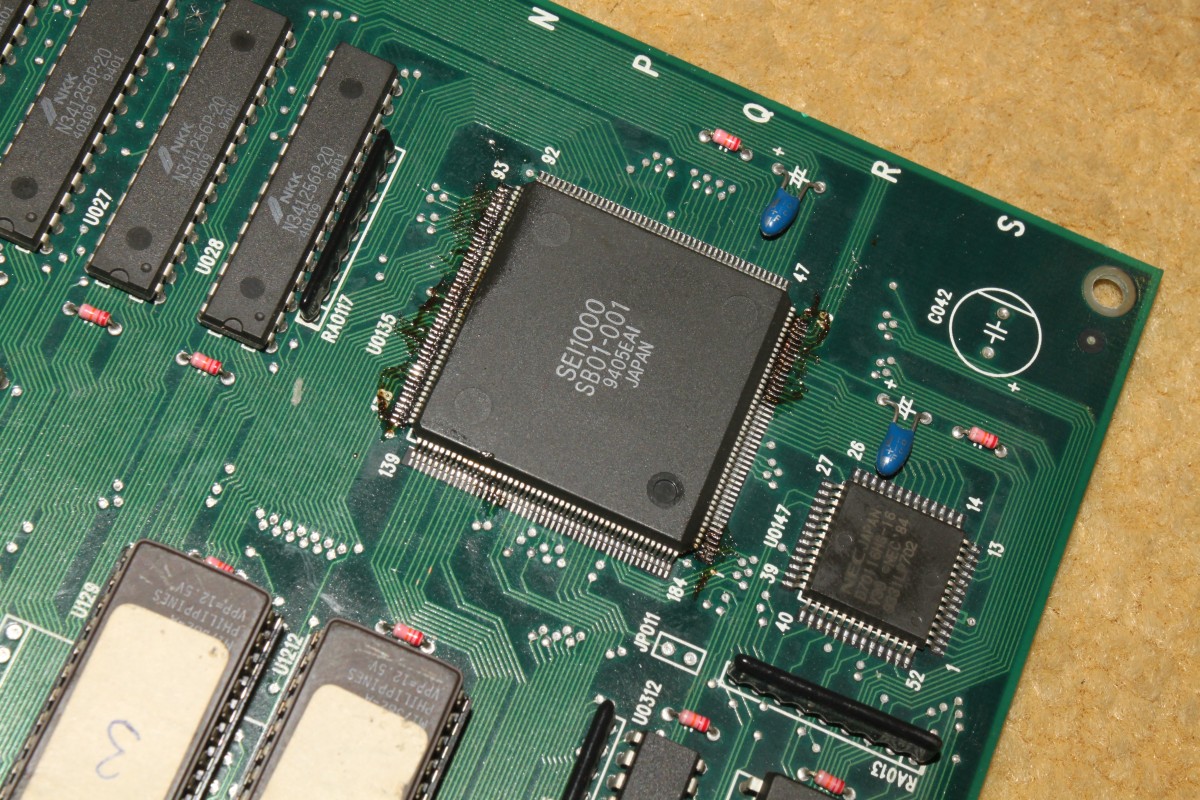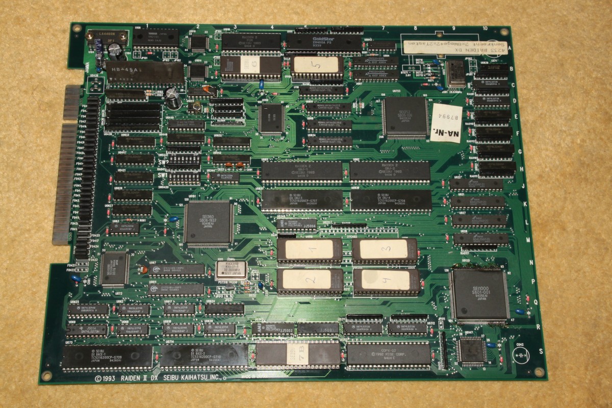 {Diagnose} Raiden II DX startet nicht oder nur manchmal, hängt sich mitten im Spiel auf... Die Platine ist sehr klopfempfindlich, einmal zu stark am Joystick gerissen, schon steht das Spiel. Meistens startet es garnicht. Der erste Verdacht führt micht zum Programmeprom, dem ich gleich anstatt der Billigfassung einen gedrehten Sockel spendiere. Leider ohne nachhaltigen Erfolg.