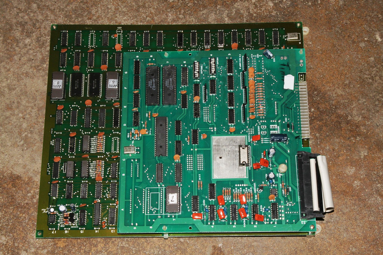 {Diagnose} Manchmal gibt es positive Überraschungen: auspacken, einschalten, geht! Time Pilot funktioniert (mit professionellem Konami-Jamma-Adapter einwandfrei. Ein schnelles, bonbonbuntes Ballerspiel mit erstaunlich dynamischer Grafik für die damalige Zeit. Nur den fehlenden Kühlkörper auf dem Audio-Verstärker werde ich mal irgendwan präventiv ersetzen.