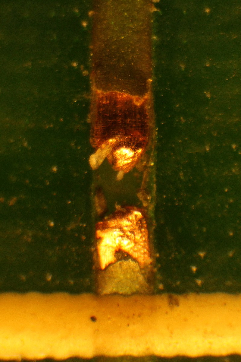 Das sieht man natürlich nur, wenn das IC ausgelötet ist... Da hat wohl ein sterbendes IC ganz schön Strom Richtung Masse geschickt. So sieht es unter dem Mikroskop aus: