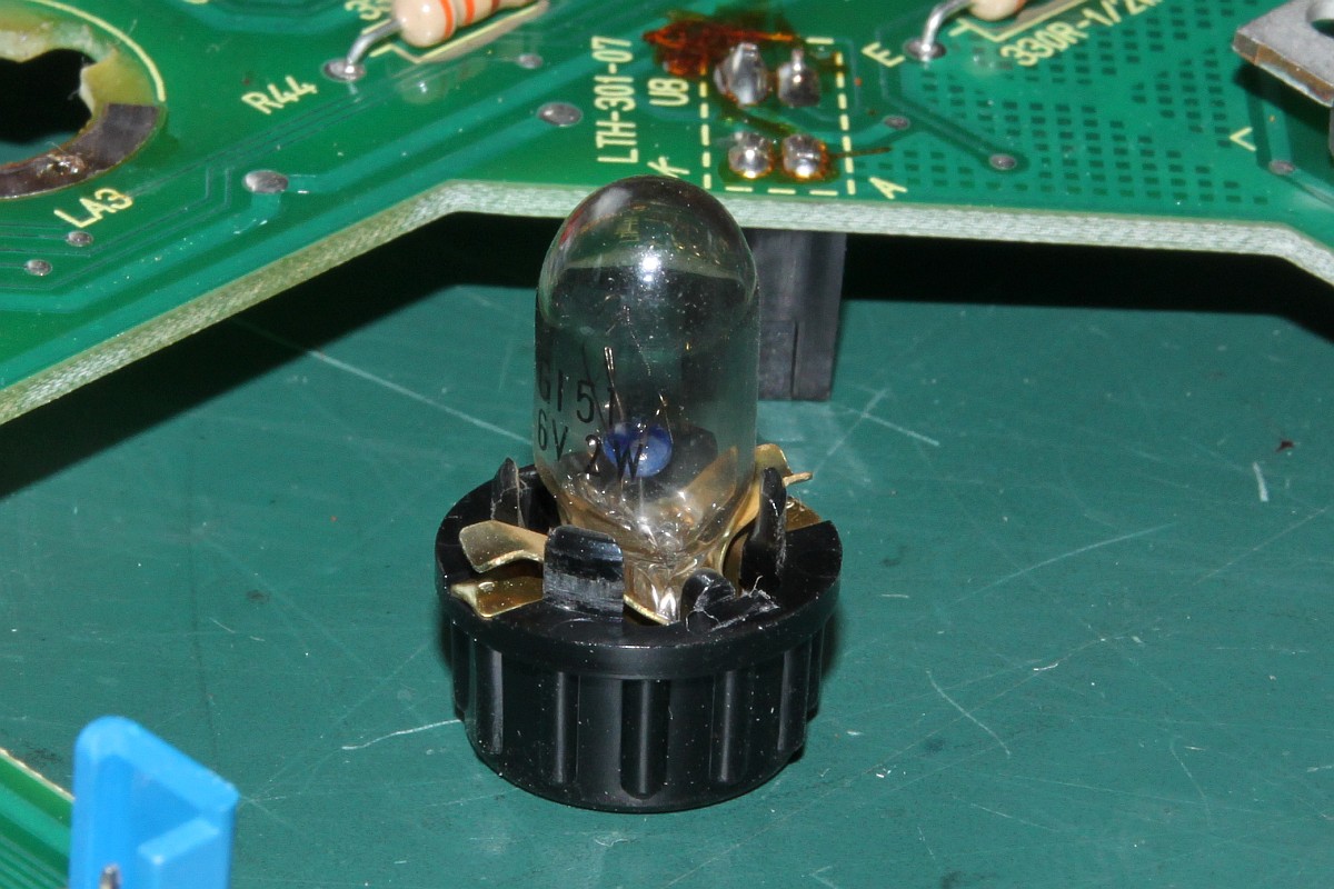 {Rückbau} Der Austausch der kleinen SMD-LEDs ist mühselig, die richtigen Typen sind nach Helligkeit und Farbklasse kaum zu identifizieren und daher nicht leicht zu bekommen. Es bleibt noch der einfache und zuverlässige Rückbau auf die ursprüngliche Glühlampenbeleuchtung... Dazu müssen die LED-Platinen sauber ausgelötet werden, die Mechanik und elektrische Kontaktierung für die Bajonettsockel ist ja auf der Grundplatine immer noch vorhanden!