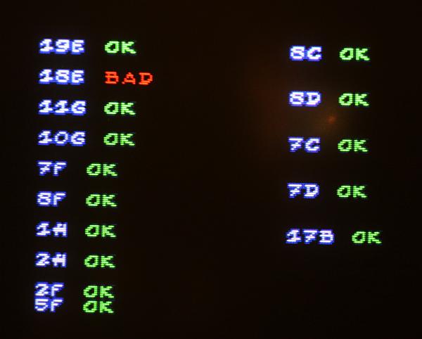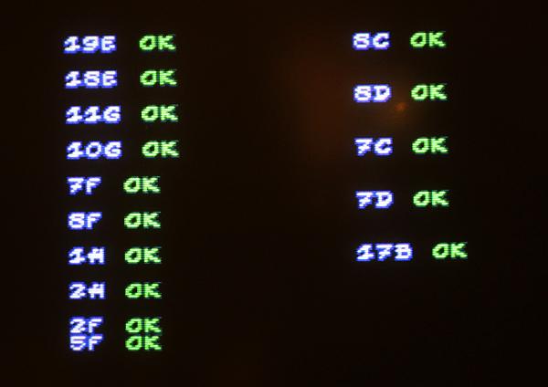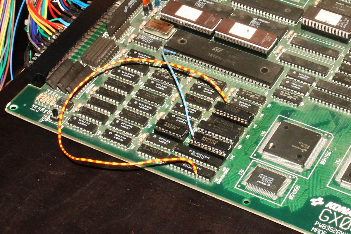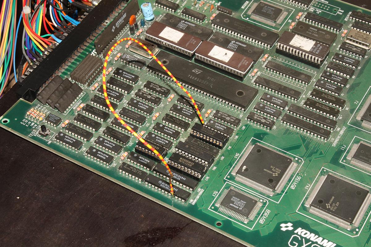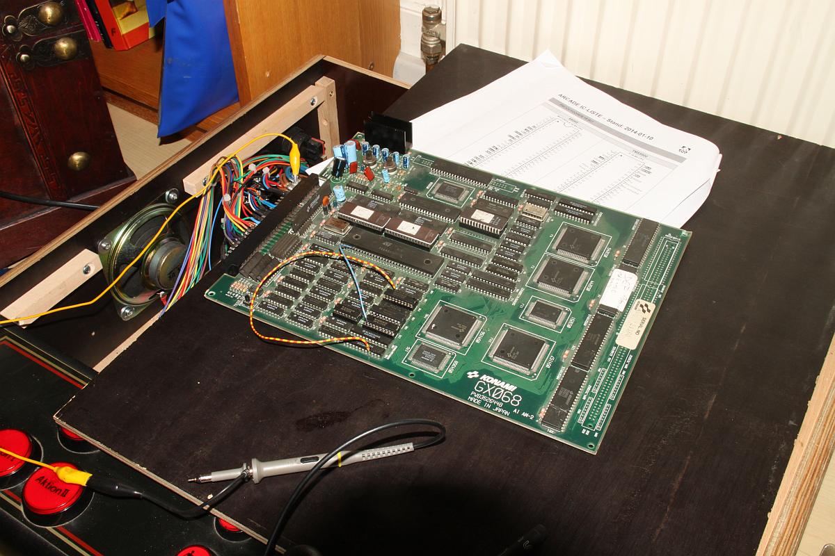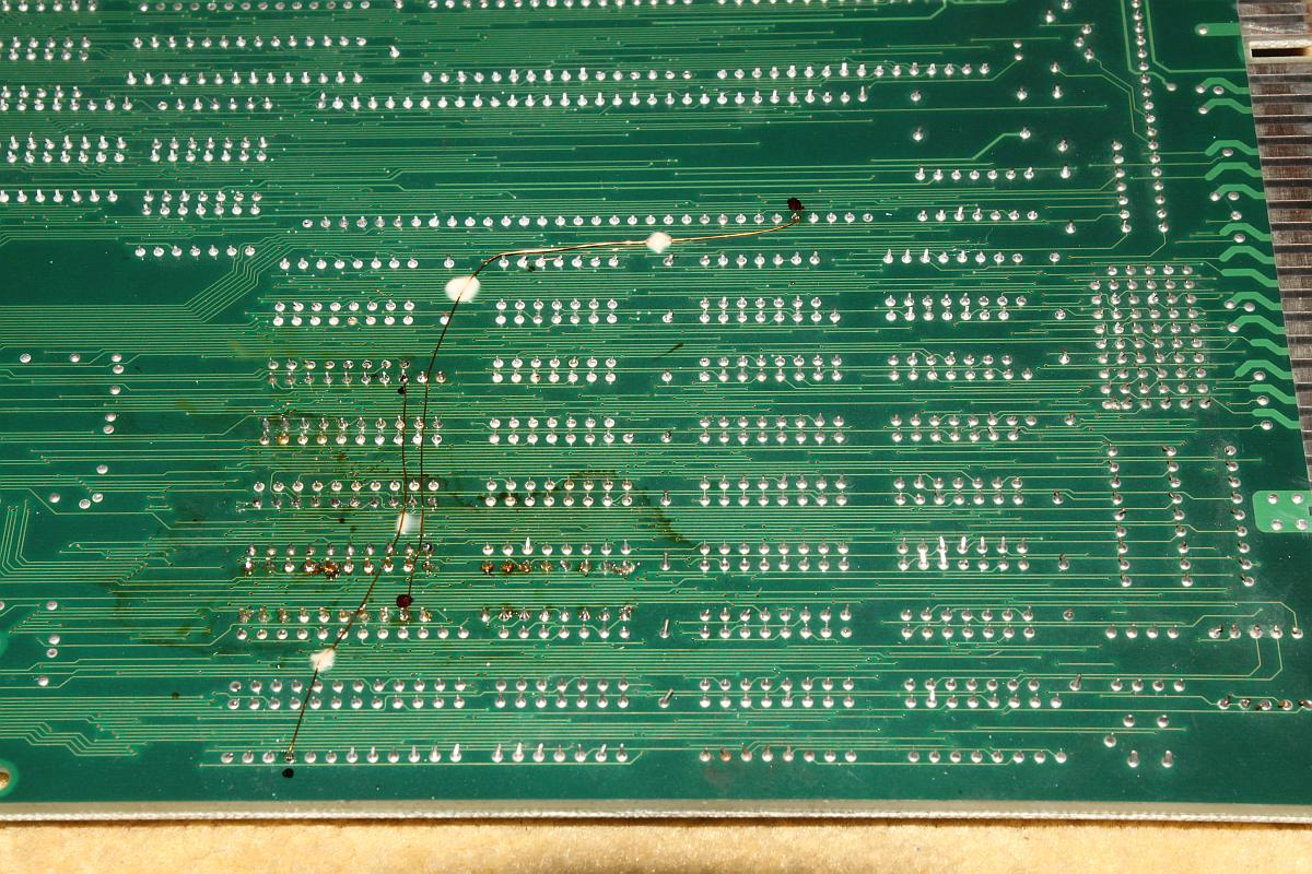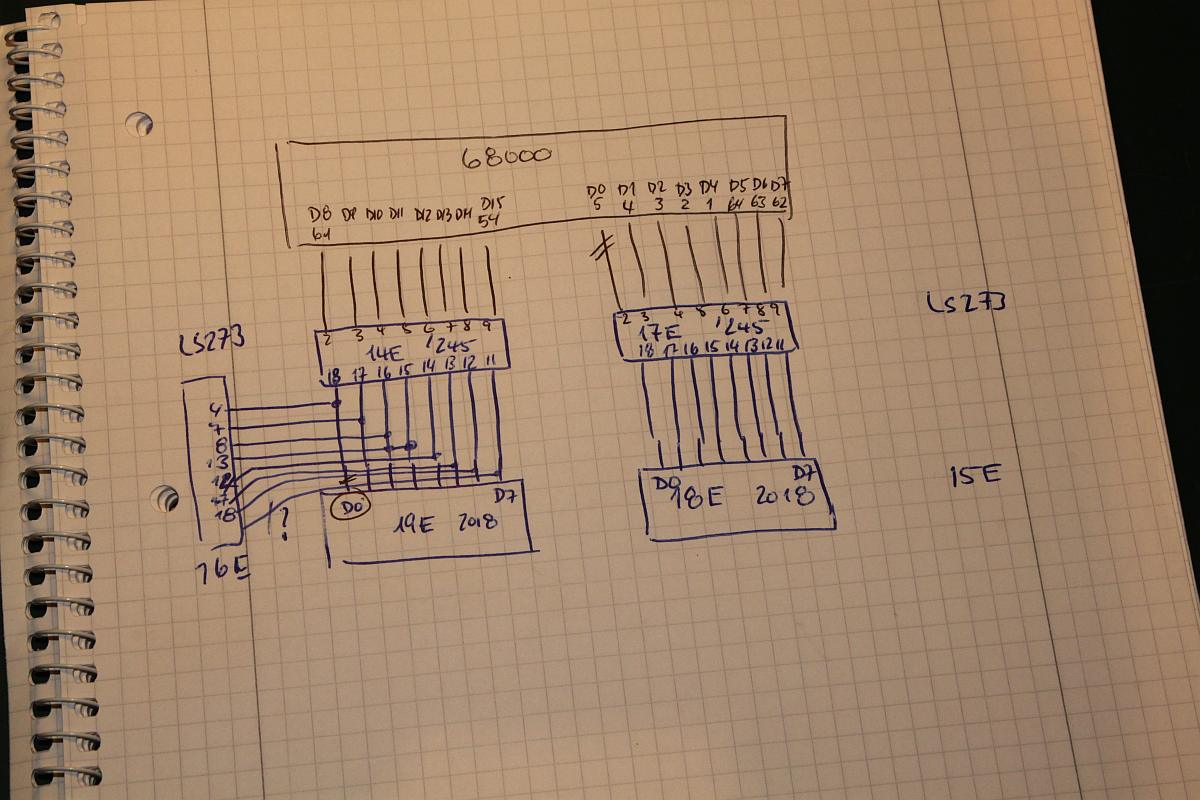 {Fehlerbeschreibung} RAM-Fehler beim Start: 18E und 19E Bad! Zu Asterix gibt es leider keinen Schaltplan, also muss man die Adressen und Daten an den entsprechenden RAMs mal mit dem Oszi ansehen. {Diagnose und Reparatur} Auf der Platine waren schon einige Bustreiber und Latches getauscht, aber eben noch nicht alle, die Kontakt zu den gemeldeten RAMs haben. Es waren Datenleitungen auffällig still, somit lag es Nahe, die restlichen Bustreiber auch noch zu tauschen. Das Ergebnis war enttäuschend: keine Änderung im Fehlerbild. Also blieb nur die systematische Suche nach dem Verbleib der Datensignale mit Oszi und Durchgangsprüfer. Daraus ergab sich folgender Schaltplanteil: Es zeigte sich, dass bei beiden RAMs keine leitende Verbindung zu Datenbit 0 bestand. Das wollte ich dann mal mit einer einfachen Strippe überprüfen - sollte es so einfach sein? Einfach mal angeschlossen und - die Spannung steigt... Bingo! der erste Fehler ist weg!!! Gleich mal die zweite Fehlstelle verstrippt: {Reparatur} ...das war ja (fast) einfach, ich hätte mir den Treibertausch sparen können, die Unterbrechungen wurden vermutlich von dem Täter verursacht, der die ersten Treiberbausteine getauscht hatte... Einmal mit Spezialisten zusammenarbeiten... ;-) Jetzt noch sauber gefädelt... und ganz zum Schluss habe ich mir noch die verfügbaren Schaltpläne ähnlicher Spiele durchgesehen und tatsächlich ein passendes Exemplar gefunden: Run and Gun hat die gleiche RAM-Anbindung... Aber wer braucht schon Schaltpläne? ;-) |
