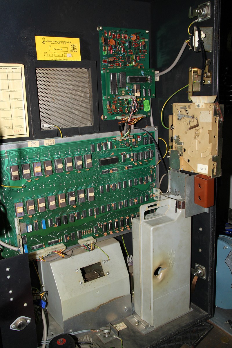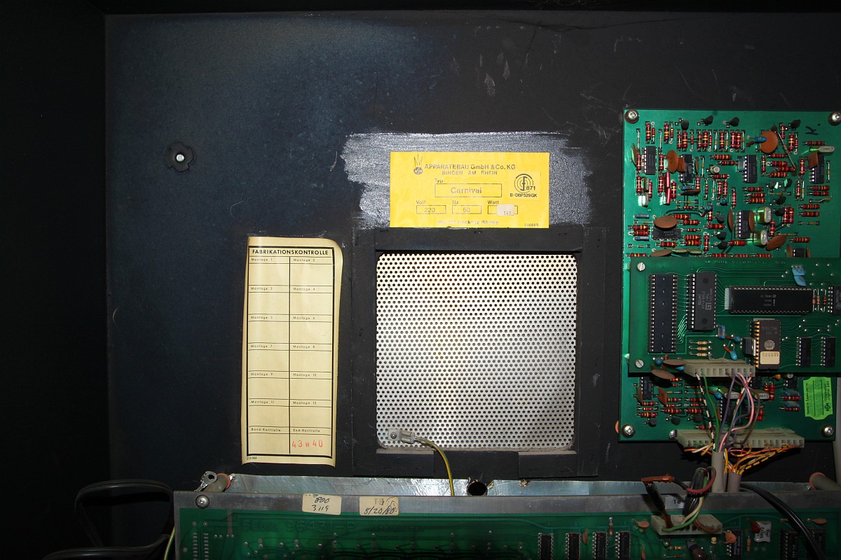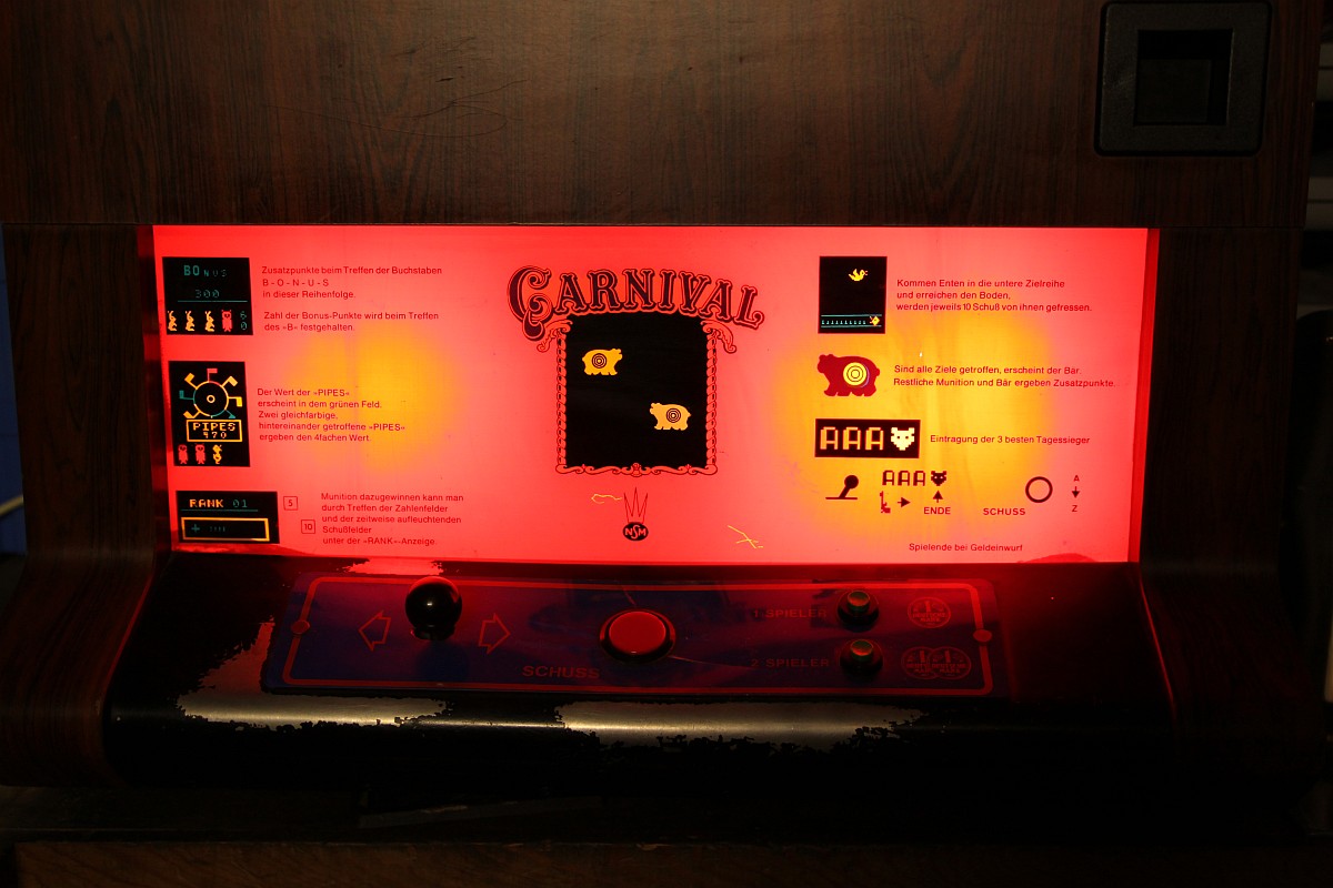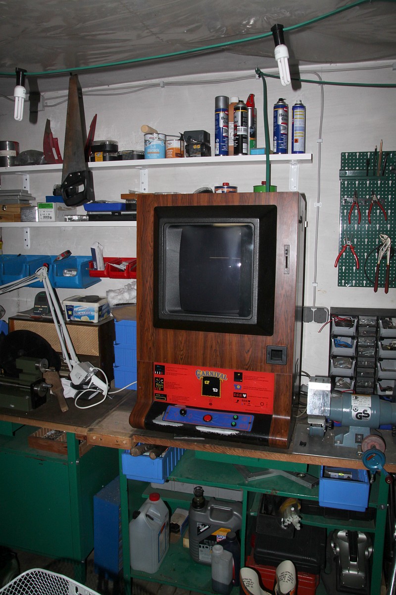 {NSM Carnival Wandautomat} Mein erster Automat... und es hat gar nicht weh getan... Ein Schnapper für 30 Taler in der Bucht, gleich um die Ecke von einem ganz sympatischen Verkäufer aber leider defekt. Ich bin echt gespannt. {Diagnose} Der Defekt war überschaubar, für die Diagnose benötigte man nur ein Multimeter und eine Lüsterklemme... Nebenbei: Carnival ist tatsächlich das bessere Space Invaders! Lustiges Gameplay mit vielen netten Details (Musik an- und ausschießen, brummelige Bären...) und der Sound ist glasklar und witzig. Für den Jahrgang 1980 eine tolle technische Leistung! {Innenleben und Impressionen} Nun noch ein par Fotos von meinem ersten richtigen Automaten. {Monitorauflösung} Ein interessantes Detail: bei den alten Monitoren (14") ist die Auflösung der Lochmaske fast geringer als die Auflösung des Spieles selber... Voll retro! ;-) |
