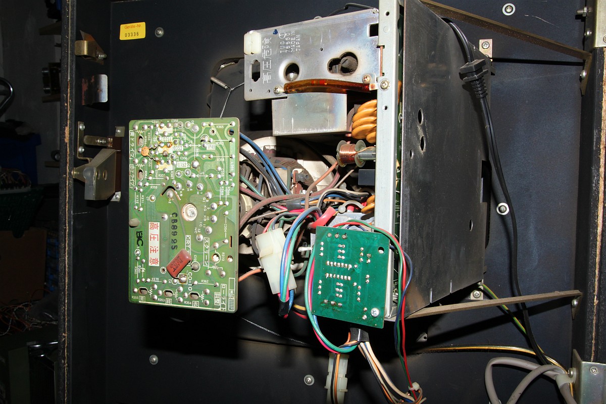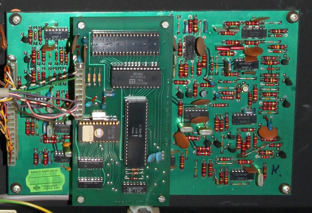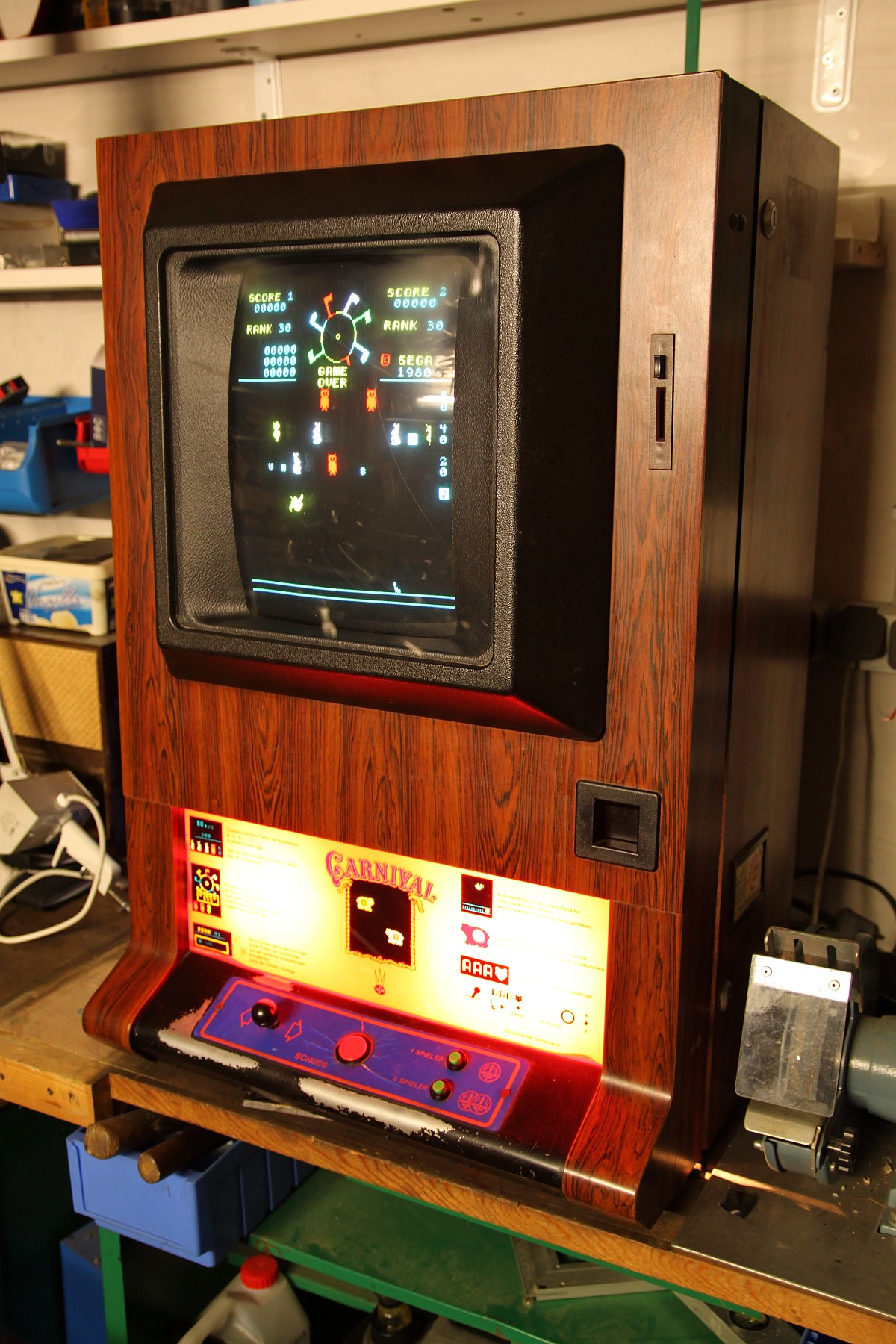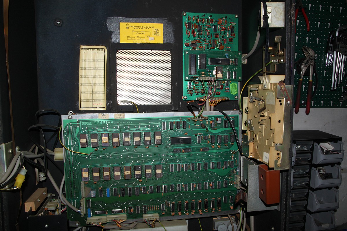 {NSM Carnival Wandautomat} Mein erster Automat... und es hat gar nicht weh getan... Ein Schnapper für 30 Taler in der Bucht, gleich um die Ecke von einem ganz sympatischen Verkäufer aber leider defekt. Ich bin echt gespannt. {Diagnose} Der Defekt war überschaubar, für die Diagnose benötigte man nur ein Multimeter und eine Lüsterklemme... Nebenbei: Carnival ist tatsächlich das bessere Space Invaders! Lustiges Gameplay mit vielen netten Details (Musik an- und ausschießen, brummelige Bären...) und der Sound ist glasklar und witzig. Für den Jahrgang 1980 eine tolle technische Leistung! {Innenleben und Impressionen} Nun noch ein par Fotos von meinem ersten richtigen Automaten. {Monitorauflösung} Ein interessantes Detail: bei den alten Monitoren (14") ist die Auflösung der Lochmaske fast geringer als die Auflösung des Spieles selber... Voll retro! ;-) |