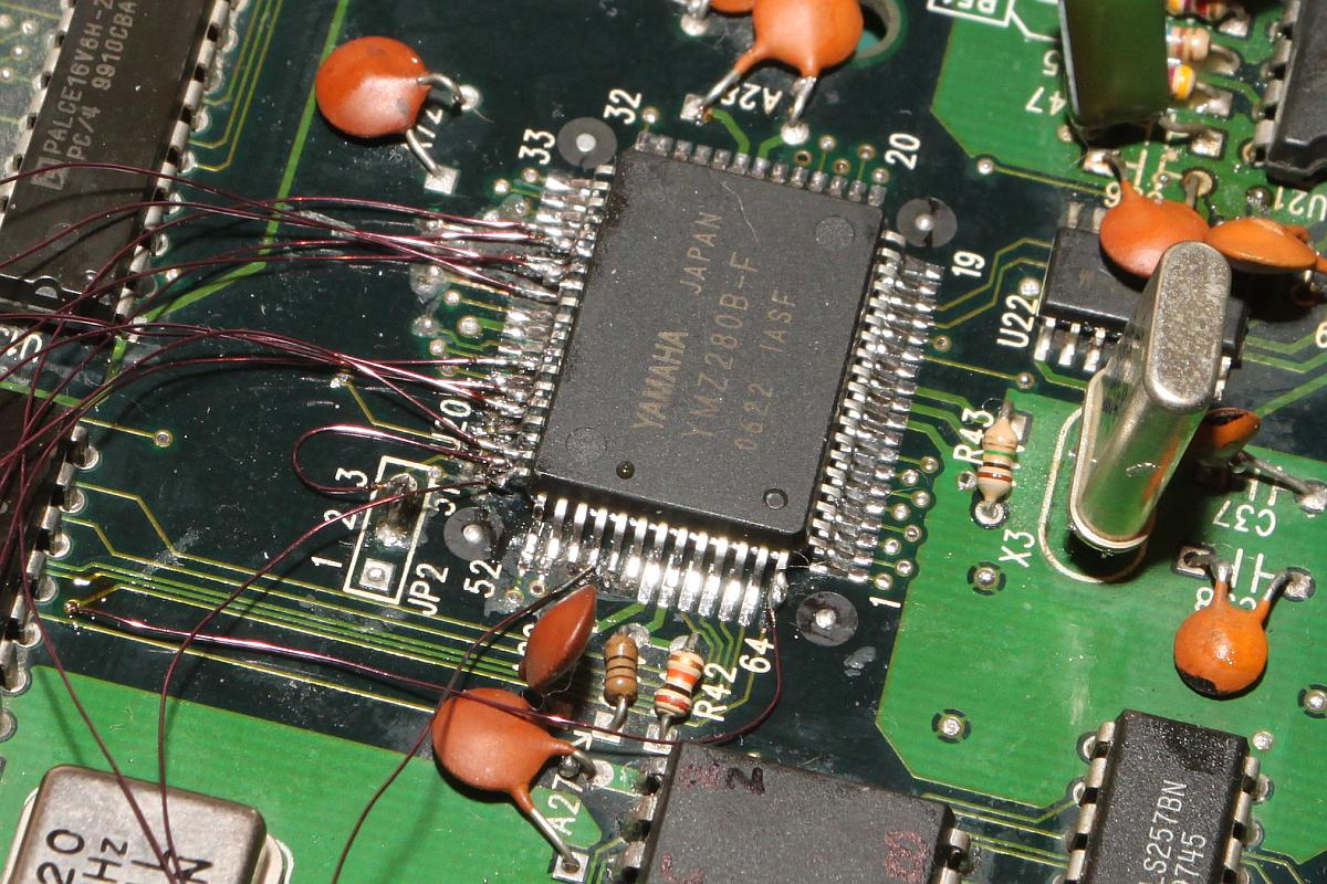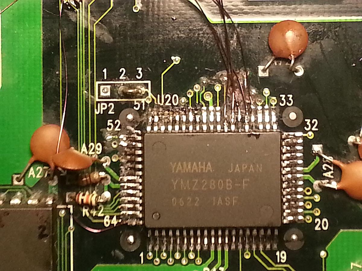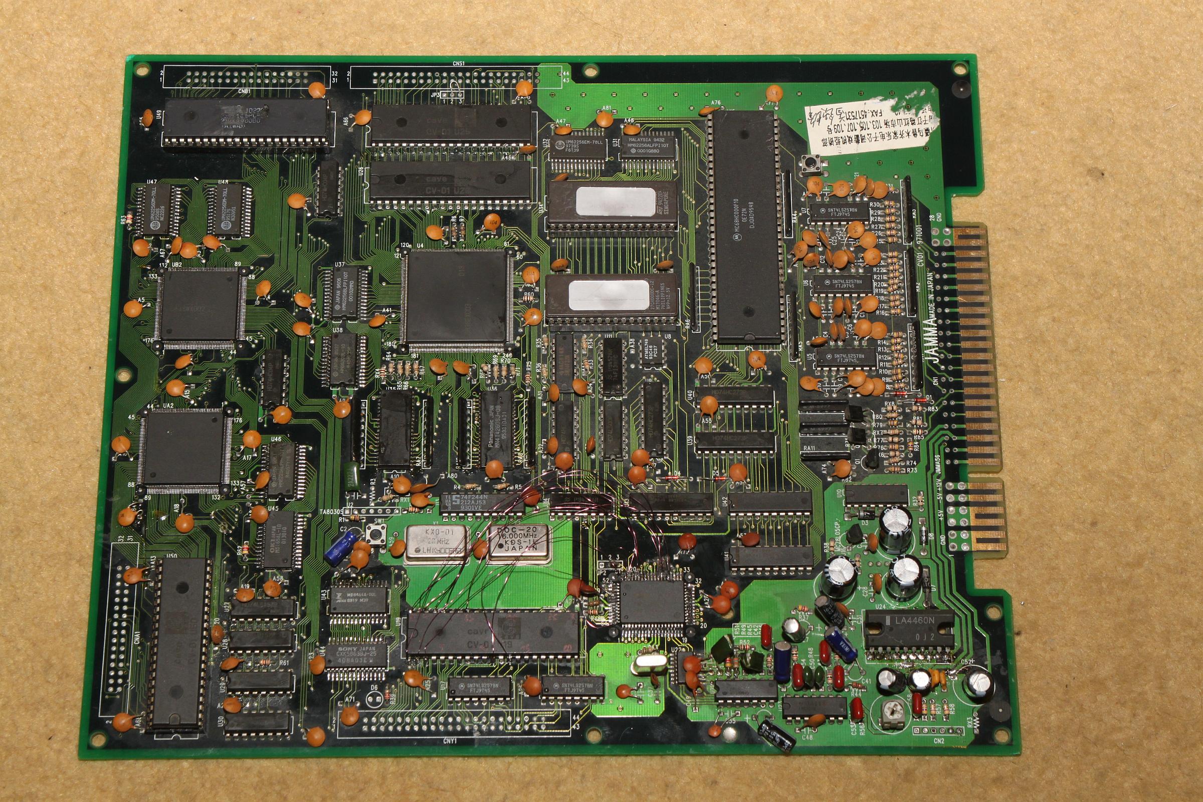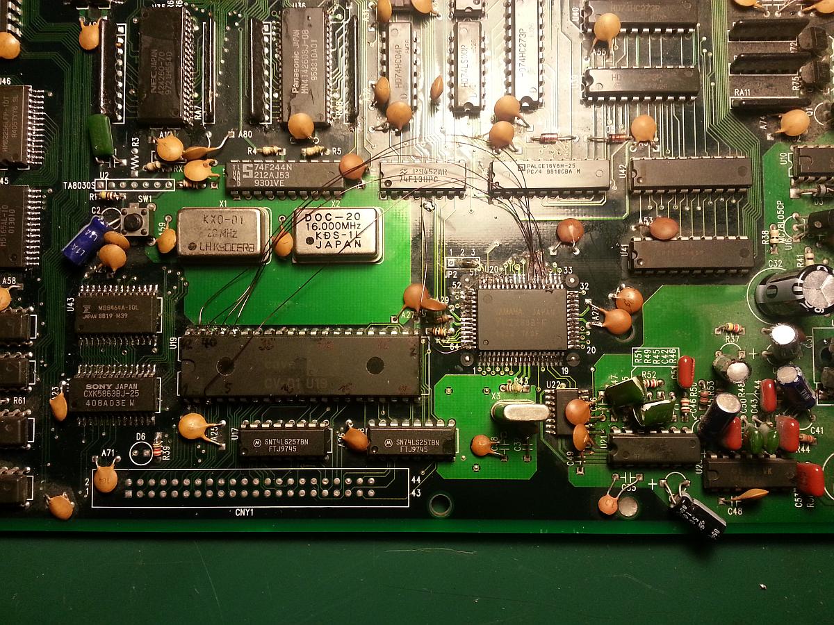 {Fehlerbeschreibung} Heute ein Reparaturlog von einem Exemplar, welches - wäre es ein Pferd - den sofortigen Gnadenschuss erhalten würde... Dangun Feveron, ein Cave Titel mit permanent nerviger Disco-Musik... nicht mein Fall. Als Erstes fiel auf, dass das Sound-IC fachgerecht ausgelötet wurde (Ersatz lag im Tütchen mit bei...) {Reparatur} Das sieht nicht gut aus... Lötaugen, wer braucht schon Lötaugen... Eines der Programm-Proms zeigte eine interessante Besonderheit: ein Loch. Und jetzt der Knaller: nach ewiger Boot- und Selbsttestphase startet doch das Spiel tatsächlich mit einwandfreiem Bild. Ich hätte es nicht für möglich gehalten... Der Ton ist natürlich stumm... Dann noch ein Detail hervorgerufen durch sinnlos rumfliegende Lötzinnspritzer: Und dann habe ich mich an die Arbeit gemacht: die restlichen Pads reinigen, fotografieren und durchklingeln, wohin die abgerissenen Kontakte gehen: glücklicherweise alle an das daneben liegende PROM... Dann Fädeldraht und eine ruhige Hand: Und als dann alle Strippen gezogen waren, sah es so aus: Der Quarz für den Soundchip lümmelte nur noch so vor sich hin, das versprach nichts Gutes. Die Platine war auch weiterhin tonlos. Also ersetzte ich mal probehalber den 16,irgendwas MHz Typen gegen einen 14 MHz, den ich noch in der Kiste hatte - wow - es ballert mir sinnloser Discosound entgegen - zwar zerstückelt, aber immerhin. Nun ja, der richtige XTAL ist bestellt, wir werden weiter sehen. |