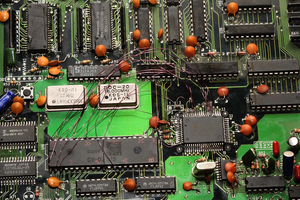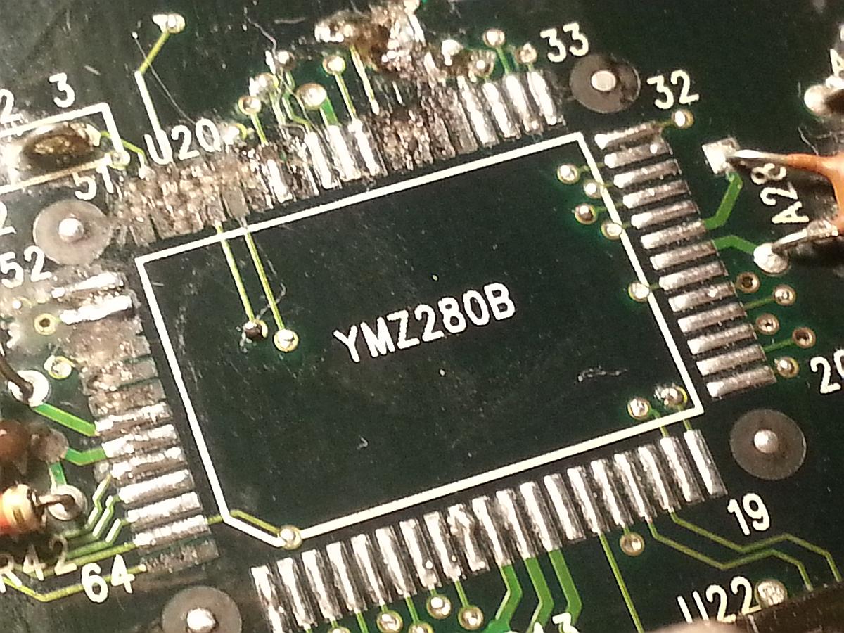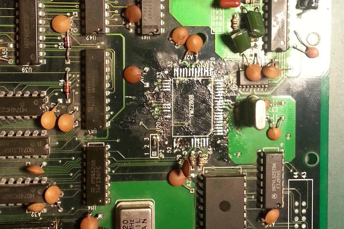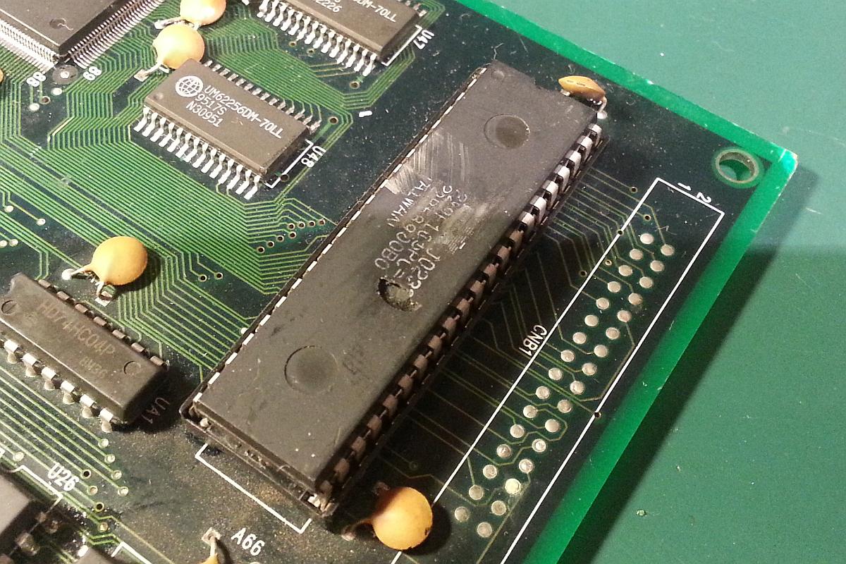 {Fehlerbeschreibung} Heute ein Reparaturlog von einem Exemplar, welches - wäre es ein Pferd - den sofortigen Gnadenschuss erhalten würde... Dangun Feveron, ein Cave Titel mit permanent nerviger Disco-Musik... nicht mein Fall. Als Erstes fiel auf, dass das Sound-IC fachgerecht ausgelötet wurde (Ersatz lag im Tütchen mit bei...) {Reparatur} Das sieht nicht gut aus... Lötaugen, wer braucht schon Lötaugen... Eines der Programm-Proms zeigte eine interessante Besonderheit: ein Loch. Und jetzt der Knaller: nach ewiger Boot- und Selbsttestphase startet doch das Spiel tatsächlich mit einwandfreiem Bild. Ich hätte es nicht für möglich gehalten... Der Ton ist natürlich stumm... Dann noch ein Detail hervorgerufen durch sinnlos rumfliegende Lötzinnspritzer: Und dann habe ich mich an die Arbeit gemacht: die restlichen Pads reinigen, fotografieren und durchklingeln, wohin die abgerissenen Kontakte gehen: glücklicherweise alle an das daneben liegende PROM... Dann Fädeldraht und eine ruhige Hand: Und als dann alle Strippen gezogen waren, sah es so aus: Der Quarz für den Soundchip lümmelte nur noch so vor sich hin, das versprach nichts Gutes. Die Platine war auch weiterhin tonlos. Also ersetzte ich mal probehalber den 16,irgendwas MHz Typen gegen einen 14 MHz, den ich noch in der Kiste hatte - wow - es ballert mir sinnloser Discosound entgegen - zwar zerstückelt, aber immerhin. Nun ja, der richtige XTAL ist bestellt, wir werden weiter sehen. |