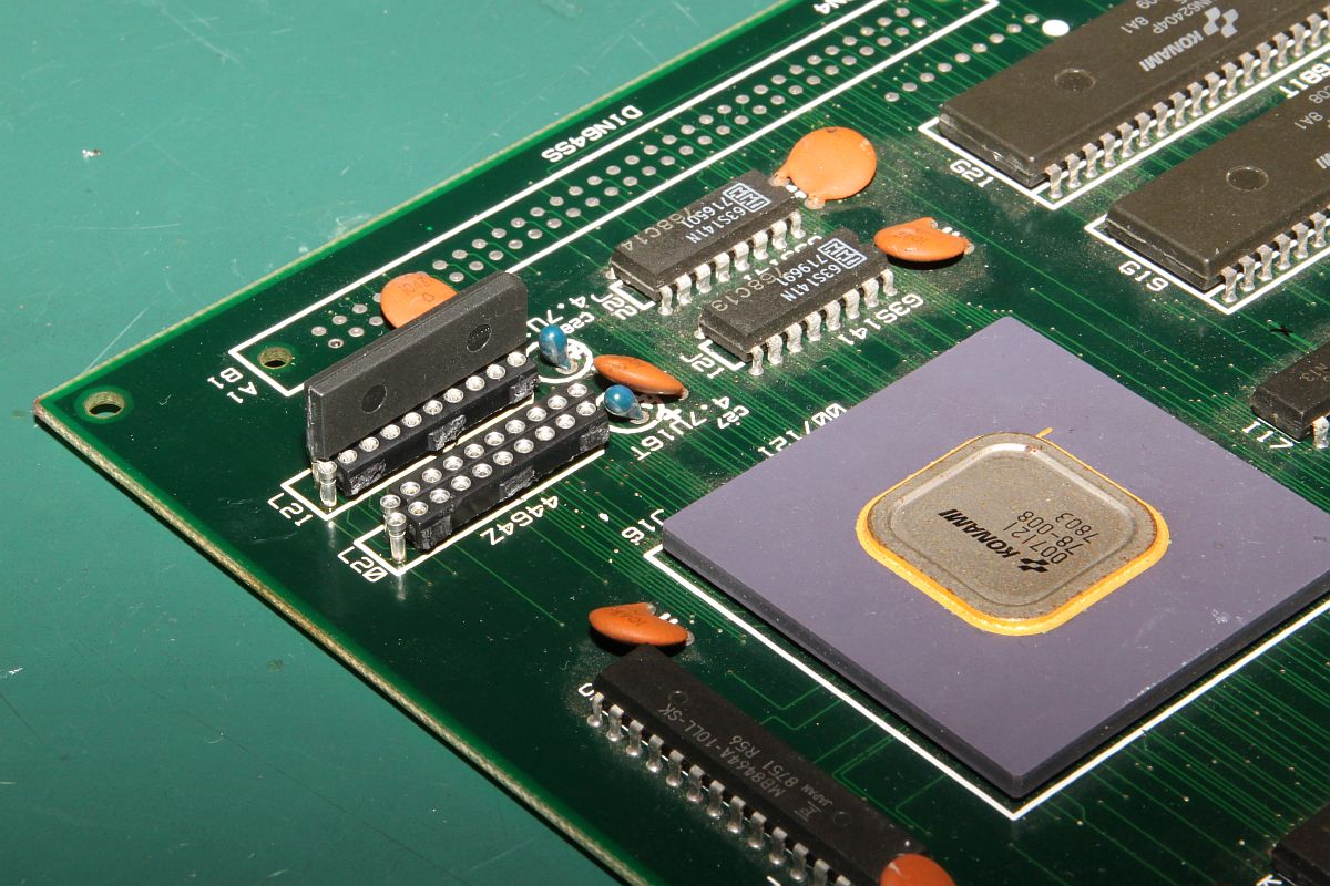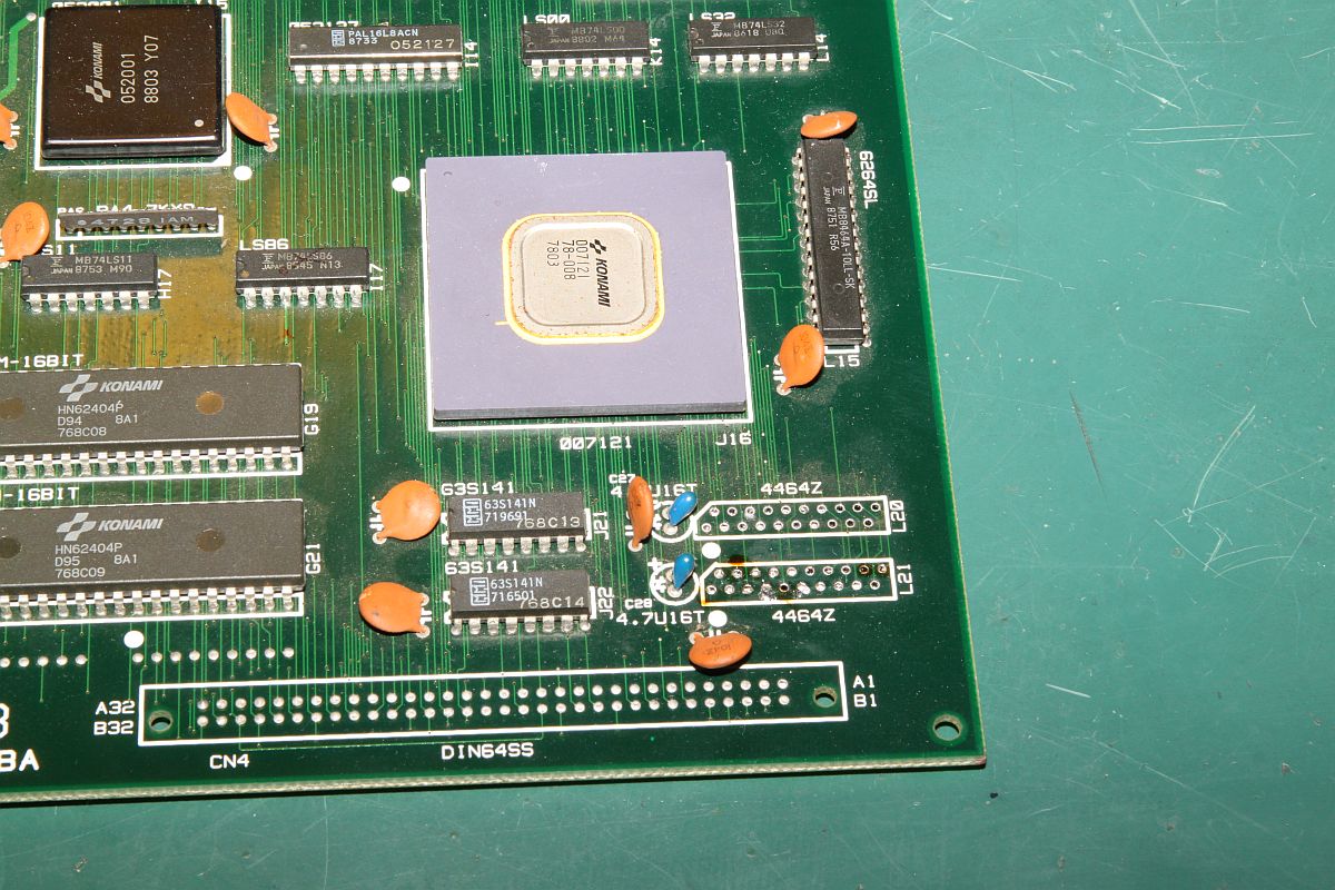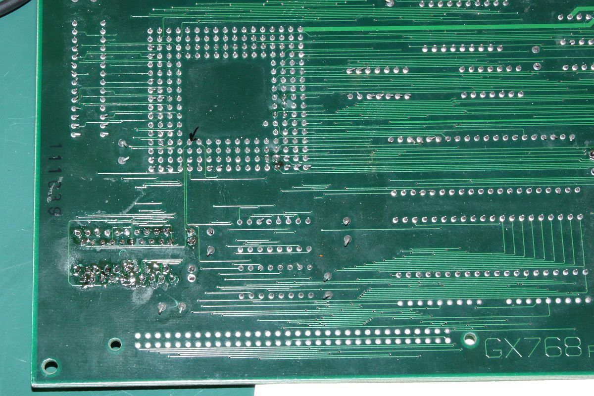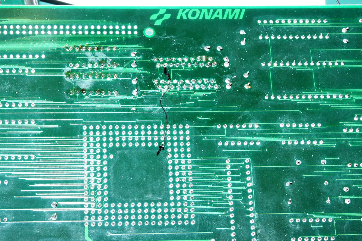 {Fehlerbeschreibung} Eine Haunted Castle (Uäch... Konami Custom Hell...) mit korrupten Sprite-Grafiken {Diagnose} Der Besitzer hatte bereits die Video-RAMs gewechselt, ein bekannter Fehler auf dieser Platine, die außerdem zu defekten Durchkontaktierungen neigt, die Dinger sind hier echt extrem klein... Der RAM-Tausch führte offensichtlich zu einer signifikanten Verschlechterung... {Reparatur} Wenn man die Grafik-RAMs an den Beinchen berührt, ändert sich das Fehlerbild in "noch schlechter"... Das deutet auf nicht verbundene Signalleitungen hin. Ich vermaß die Signale an den Video-RAMs... Eine der Adressleitungen war dauernd Low, kein gutes Zeichen! Um herauszufinden, wo diese Adressleitung, die offensichtlich durch vorheriges unachtsames Auslöten unterbrochen worden war, im Custom verschwand, hoffte ich auf identisch aufgebaute Video-Einheiten und klingelte den "gesunden" Part durch. Schon war der Pin identifiziert. Nun mal probeweise den gleichen Pin auf der Nachbarseite mit dem dortigen RAM verbunden: Juhu... schon klappt es auch wieder mit den Sprites. {Reparatur Teil 2} Oh Mann, es wäre ja so schön gewesen, aber nach genauer Durchsicht zeigt sich, dass immer noch Sprites völlig fehlen: der Schriftzug im Titelbild, die Figuren am Anfang, fliegende Knochen und Steine... Also tausche ich auch noch die beiden anderen RAMs. Juhu... schon klappt es auch wieder mit ALLEN Sprites. |