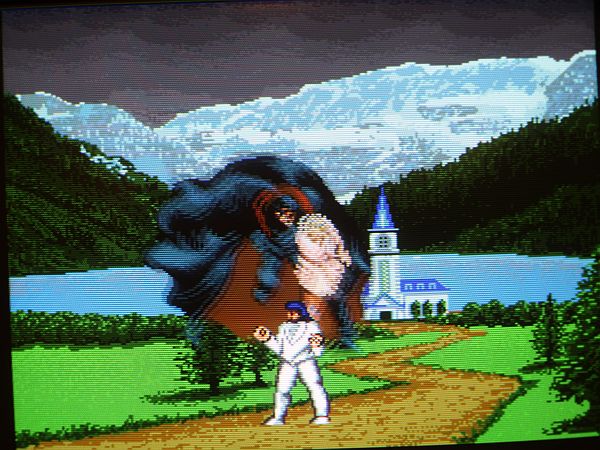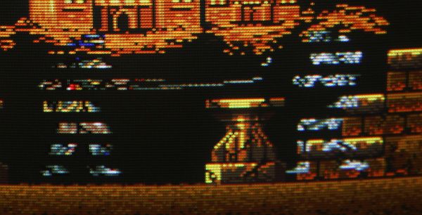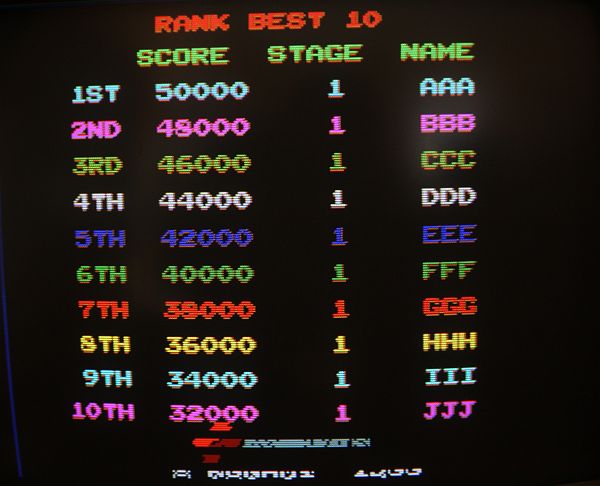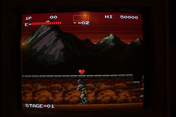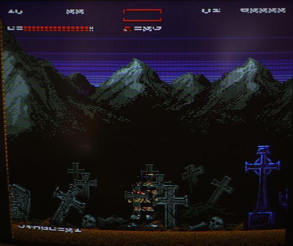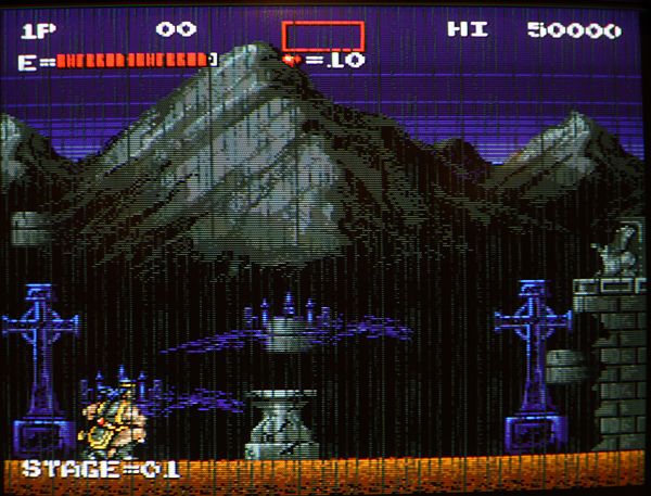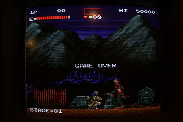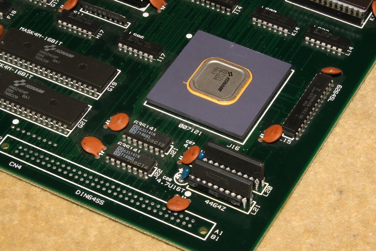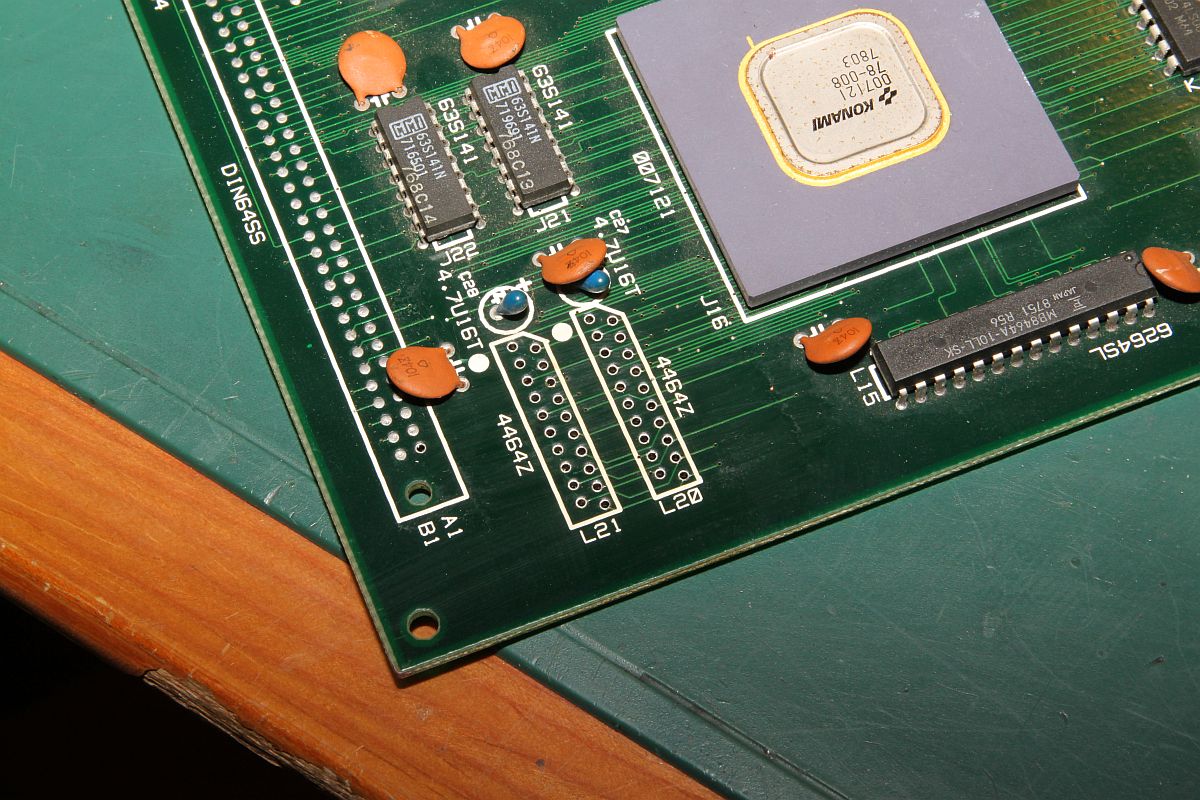 {Fehlerbeschreibung} Eine Haunted Castle (Uäch... Konami Custom Hell...) mit korrupten Sprite-Grafiken {Diagnose} Der Besitzer hatte bereits die Video-RAMs gewechselt, ein bekannter Fehler auf dieser Platine, die außerdem zu defekten Durchkontaktierungen neigt, die Dinger sind hier echt extrem klein... Der RAM-Tausch führte offensichtlich zu einer signifikanten Verschlechterung... {Reparatur} Wenn man die Grafik-RAMs an den Beinchen berührt, ändert sich das Fehlerbild in "noch schlechter"... Das deutet auf nicht verbundene Signalleitungen hin. Ich vermaß die Signale an den Video-RAMs... Eine der Adressleitungen war dauernd Low, kein gutes Zeichen! Um herauszufinden, wo diese Adressleitung, die offensichtlich durch vorheriges unachtsames Auslöten unterbrochen worden war, im Custom verschwand, hoffte ich auf identisch aufgebaute Video-Einheiten und klingelte den "gesunden" Part durch. Schon war der Pin identifiziert. Nun mal probeweise den gleichen Pin auf der Nachbarseite mit dem dortigen RAM verbunden: Juhu... schon klappt es auch wieder mit den Sprites. {Reparatur Teil 2} Oh Mann, es wäre ja so schön gewesen, aber nach genauer Durchsicht zeigt sich, dass immer noch Sprites völlig fehlen: der Schriftzug im Titelbild, die Figuren am Anfang, fliegende Knochen und Steine... Also tausche ich auch noch die beiden anderen RAMs. Juhu... schon klappt es auch wieder mit ALLEN Sprites. |