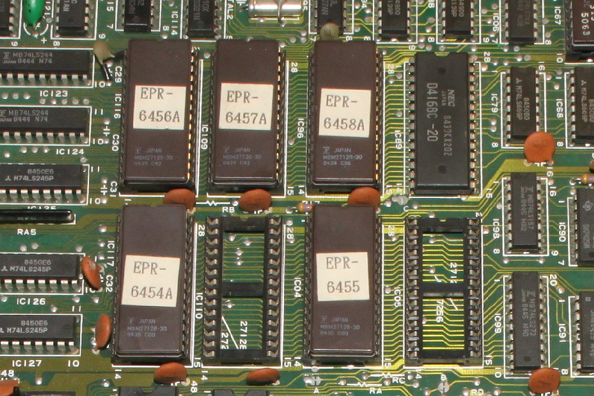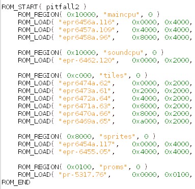 {Diagnose} Im MAME Source Code ist genau aufgeführt, welche ROMs wo stecken und welche Funktion sie haben. Das ist bei der Fehlersuche immer sehr hilfreich! Hier sind zum Beispiel die Sprite Grafik ROMs.