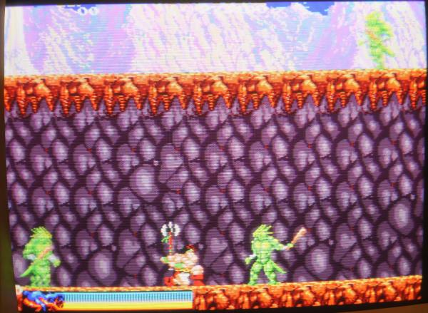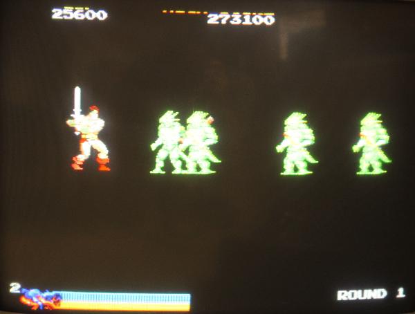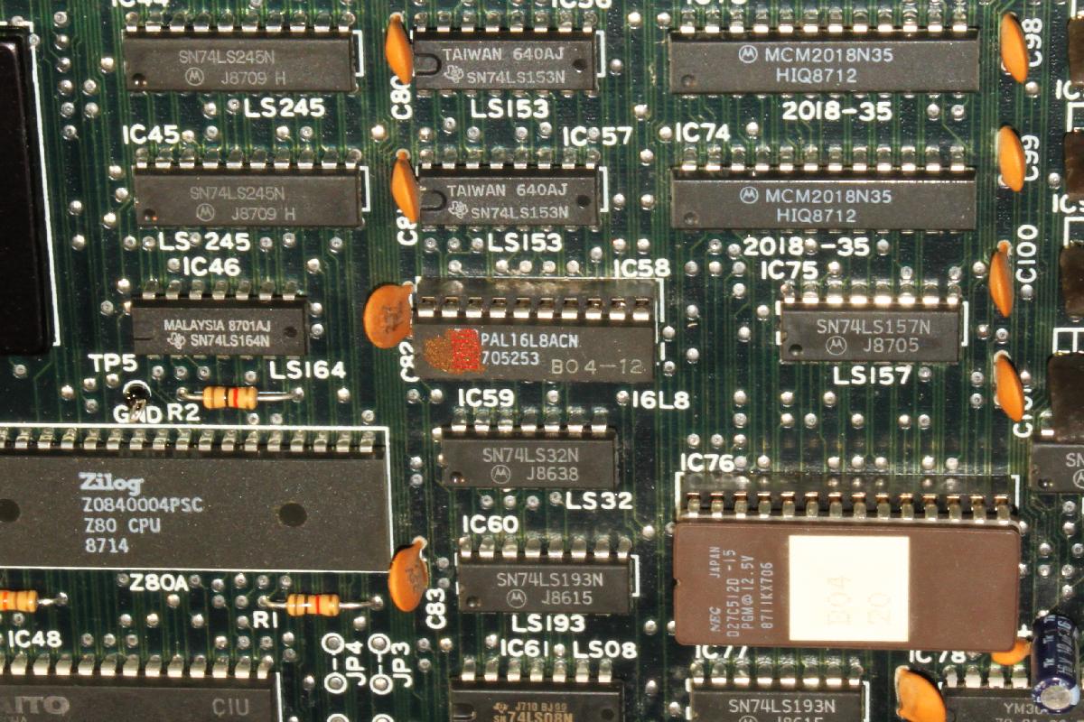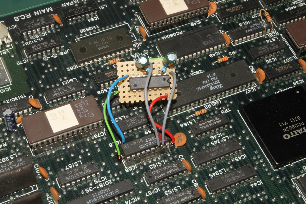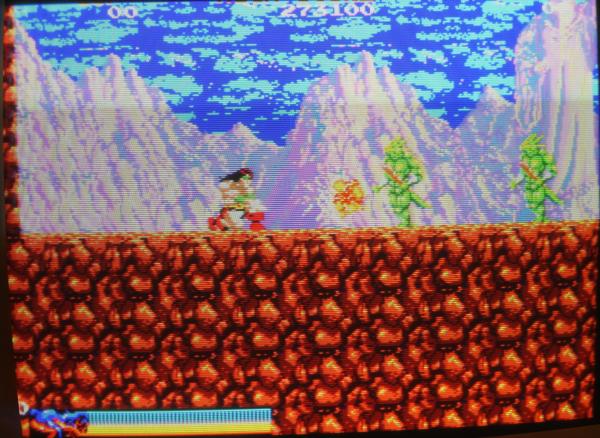 {Fehlerbeschreibung} Rastan Saga ohne festes Bild, nur wilde Streifen. Das Spiel läuft, Sound geht, also scheint nicht so viel hin zu sein. Das Oszi deckt auf: kein Sync-Signal. {Diagnose} Die Verfolgung des Sync-Signals endet mit dem Durchgangspieper an einem Pal... (Nachdem ich einige durchgebrannte Leiterbahnstücke gebrückt hatte, da war wohl ein kapitaler Kurzschluss am Werke...) {Reparatur} Nachdem ich festgestellt habe, dass das Sync-Signal direkt aus dem PAL 16L8 (IC58) mit der Nummer B04-12 kommt, war alles ganz leicht: Mit einem LS86 einfach einen Separate Sync to Composite Sync generator gebastelt und schon stand das Bild: {Reparatur 2} Mist, keine Tiles... Die Hälfte des PAL ist tot. Die Steuersignale kamen also auch aus dem PAL... Gottseidank gibt es in den Weiten des Internets Seiten, die PAL-Dumps anbieten. Das ist toll. Und das Beste: mein Billigchinaeprommer kann die brennen, und: ich hatte noch einen Baustein vorrätig. Und: die Farben bei Rastan sind echt gruselig... Wobei mir hier scheint, dass das eine oder andere Farbbit nicht korrekt ist, aber das Spiel ist spielbar und sieht (fast) ganz gut aus. |