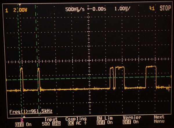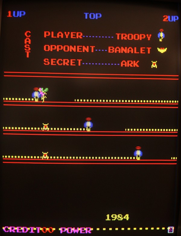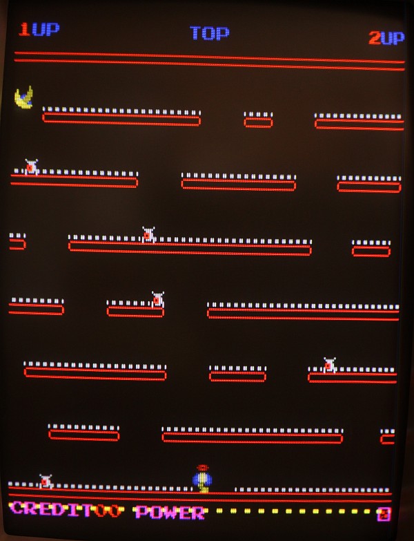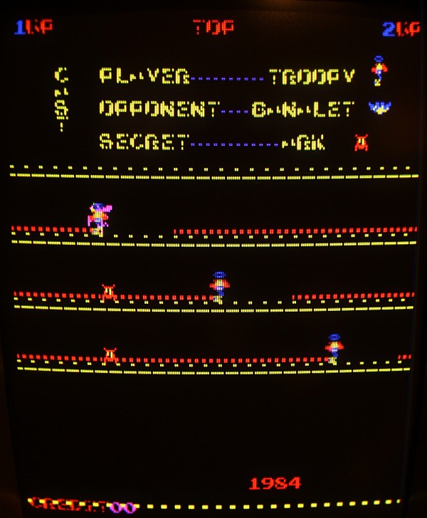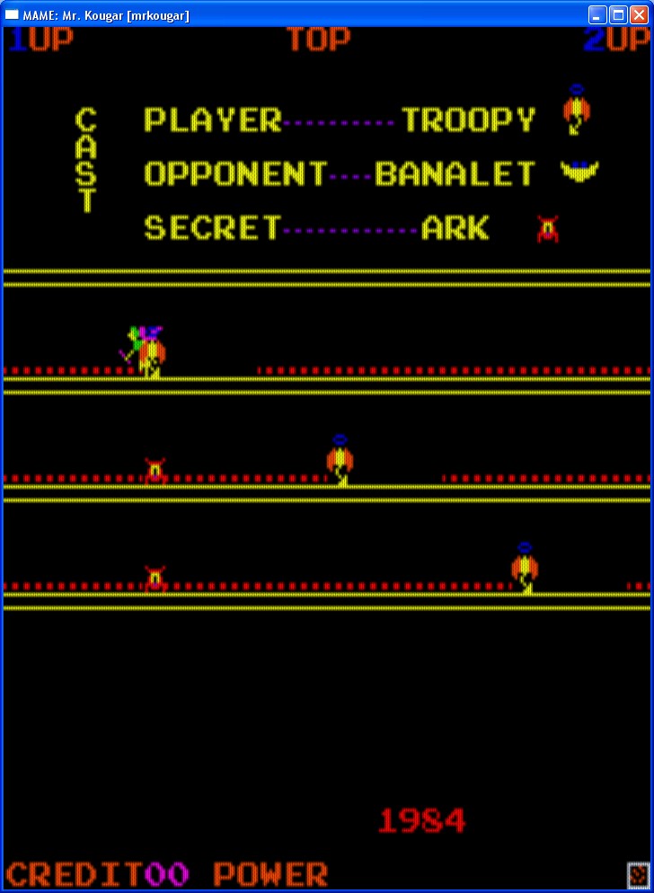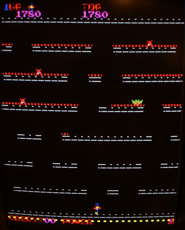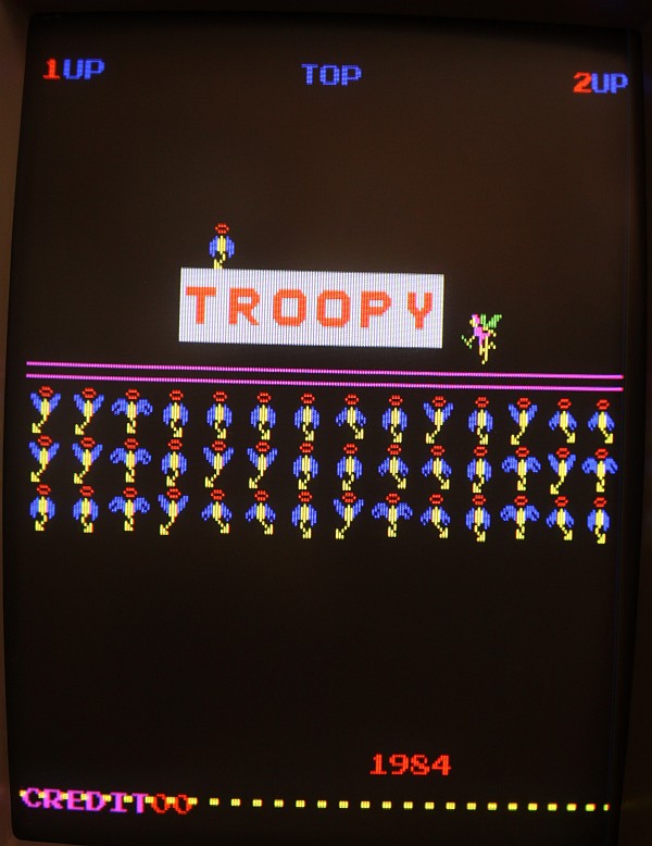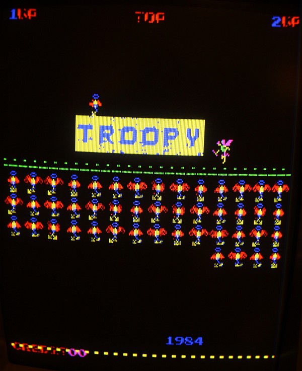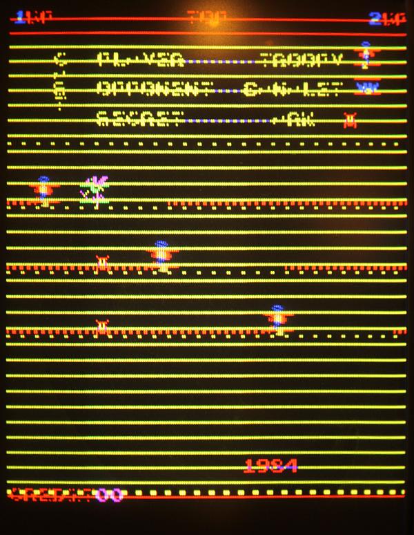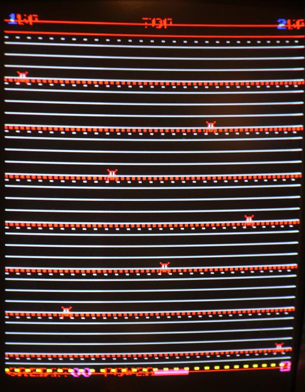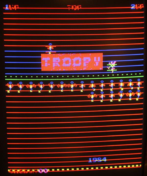{Fehlerbeschreibung} Ein Spiel, welches es nicht gibt... Troopy geizt im Internet mit Infos, es handelt sich um ein Mr. Kougar-Clone. MAME kennt auf jeden Fall die Programm-ROMs nicht, dazu aber später mehr. Der Patient wurde eingeliefert mit schweren Grafikdefekten... {Diagnose} Die ollen EPROMs sind so marode in ihren Fassungen, dass alleine der Vorgang des Extrahierens für das Auslesen die Zahl der Fehler um mindestens 50% reduziert hat. Hier werde ich mal gedrehte IC-Sockel spendieren... Fortsetzung folgt. {Reparatur} Eine grundsätzliche Platinenreinigung und der Austausch der martoden Sockel gegen gedrehte IC-Fassungen zeigt Wirkung: ein Großteil der Streifen ist verschwunden, man kann das Spiel schon mal erahnen. Die ausgelesenen ROMs habe ich mal in MAME zur Emulation bei Mr. Kougar eingefügt: {Reparatur Teil 2} Woher kommen jetzt die GFX-Fehler? Manche Pixel flackern, sind also nicht stabil. Das deutet auf grenzwertige Datenpegel hin. Das Oszi zeigt: die Daten der zwei Mostek-EPROMs sehen nicht gut aus, 3V sind zu wenig: ...und nach dem Brennen neuer 2716-Eproms eines alternativen Herstellers (Intel) sieht das doch richtig gut aus. Nur die gelben Punkte in der untersten Zeile bekomme ich nicht weg... |