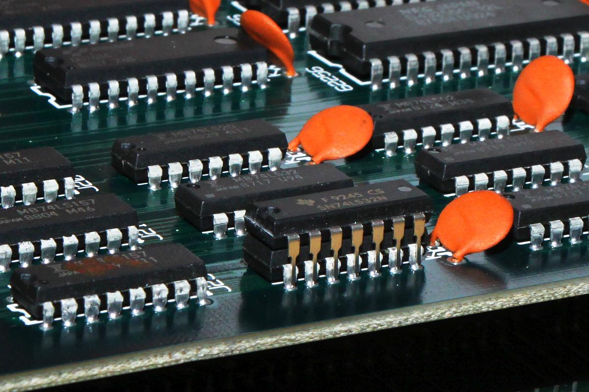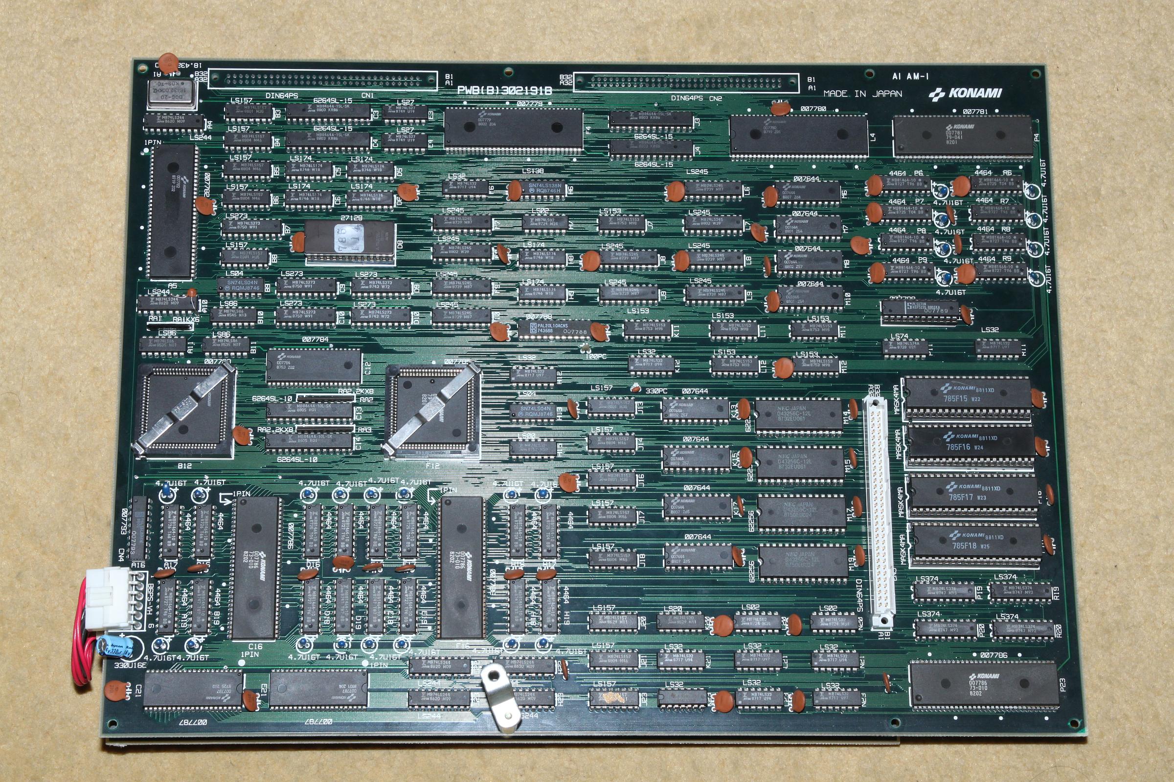 {Diagnose und Genesung} Vier Anläufe zur Fehlersuche waren nötig, frustriend, da Custom-Hell, kein Schaltplan und fürchterlich viele ICs... Und wieder einmal halfen Oszi (Signalintegrität), Durchgangsprüfer (Signalverfolgung) und Heissluftfön (IC-Auslöten). Auf der unteren Platine werden die Video-Signale generiert. Auf J23 ist ein 74LS157 (Multiplexer), der letztendlich die Framebuffer bedient. Dessen Eingänge Pin 3 und Pin 6 waren auf schwebendem Potential. Der Durchgangspieper verriet, dass die Signale vom daneben liegenden 74LS32 (Oder-Gatter) kamen. Dieser war offensichtlich defekt. Da wurde doch ein komplettes Bild Framebuffer bei den Sprites nicht geschrieben... Vier Mal die PCB in den Händen gehabt - drei Mal Frust, einmal Lust. Manchmal darf man halt einfach nicht aufgeben.