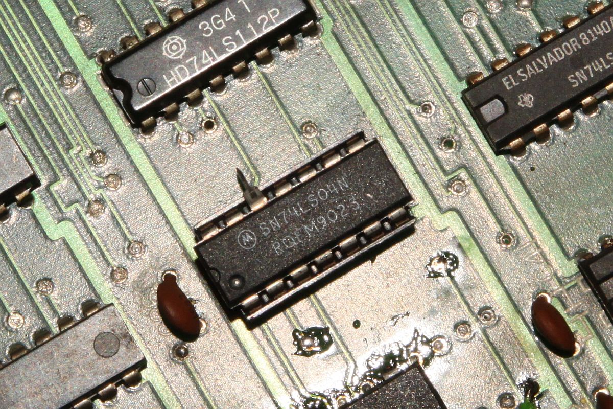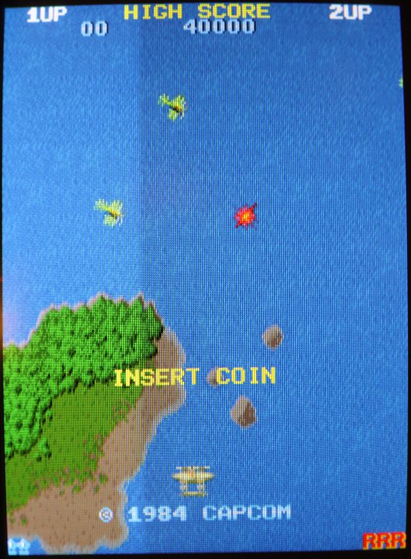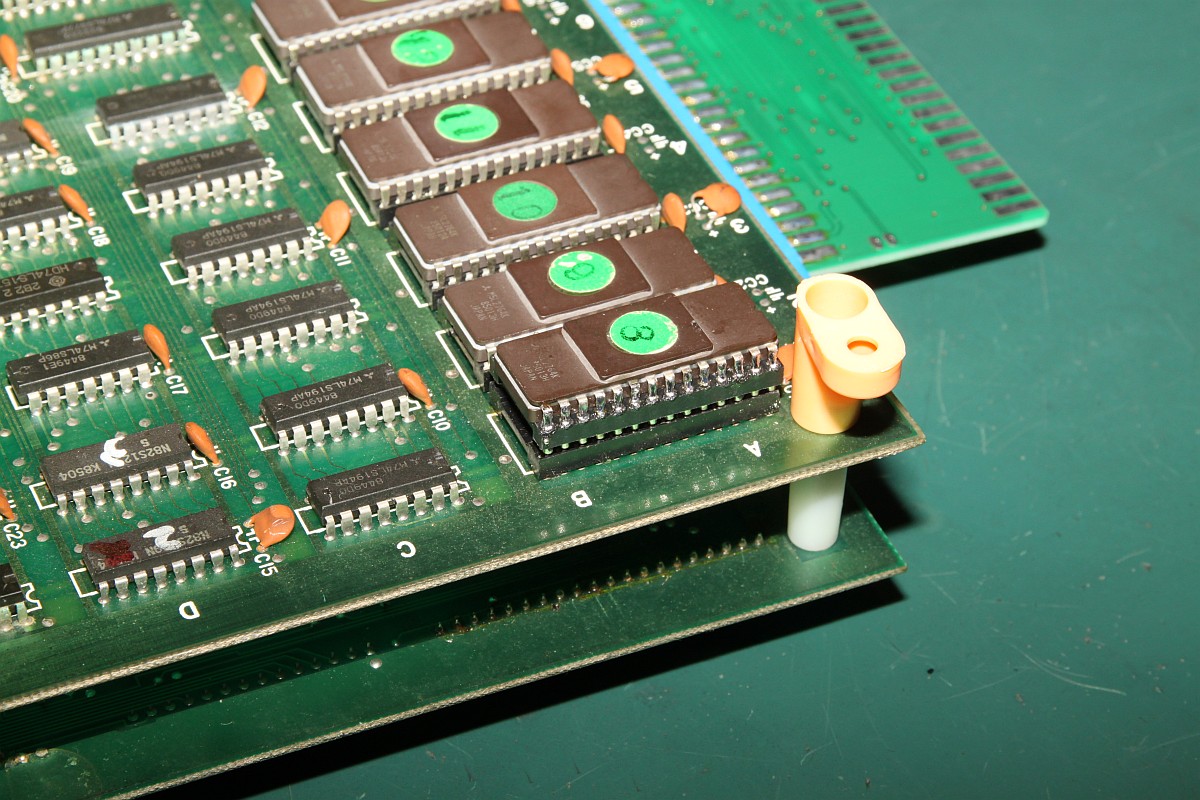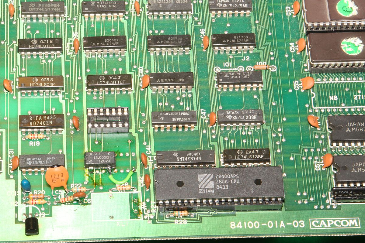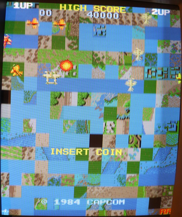 {Fehlerbeschreibung} eine Capcom 1942 völlig tot... Kein Bild kein Ton, die erste Untersuchung zeigt: kein Quarztakt, der Z80 ist gebraten. Austausch von Quarz, Z80 und 74LS04 (so ein suspekter Bayerisch-Malz-Typ) bringt keine Besserung, der Takt will nicht anspringen. Die Takterzeugung bei der 1942 ist etwas kritisch, nicht alle Typen 74LS04 funktionieren, daher reißt mir der Geduldsfaden und ich setze einen Fertigoszillator ein. Elektronik-Fast-Food... {Reparaturergebnis} Den 74LS04 brauche ich ja nicht mehr, also raus damit... dachte ich mir so... {Reparatur 2} Ups, da fehlt ja jede zweite Spalte im Bild und Sprites gibt es auch keine (man kann sie in Spalte 0 erahnen...). Die weitere Fehlersuche ergibt Folgendes: ich entfernte den 74LS04 wegen des Quarzoszillators und übersah, dass da noch Inverter anderweitig verwendet wurden. So zum Beispiel, um den horizontalen Blankingimpuls zu generieren. Ohne Inverter taktet dieser mit halber Pixelfrequenz und löscht damit jedes zweite Pixel... Also flugs den Inverter geholt und nur den Systemtakt abgeklemmt... ganz professionell... {Teilerfolge} Uff, die Zeilen sind vollständig, die Sprites leben. Aber: manche Sprites werden an manchen Stellen horizontal verschoben dargestellt. Unregelmäßigkeiten in den H und V Takten für die Adressierung der bewegten Objekte kann ich nicht feststellen (Das würde sich auch auf den scrollenden Hintergrund auswirken), vermutlich haben die 2114 einen Schuss, die Sprites und deren Position enthalten... (Object RAM). Ich werde weiter berichten. {Reparatur 3} Sodele, jetzt ganz gnadenlos die beiden Object-RAMs getauscht, 2114 gehen ja immer gerne mal kaputt: {Sieg!} Und schon sind alle Sprites an der richtigen Stelle! {Update: Reparatur 4} Gerade wollte ich das Mistding verpacken und zurücksenden, da fiel mir beim erneuten Endtest wieder ein Fehler auf: {Erneuter Sieg!} Langer Suche kurzer Sinn: ein GFX-Eprom war ein klein wenig angefressen... (ich auch!): |