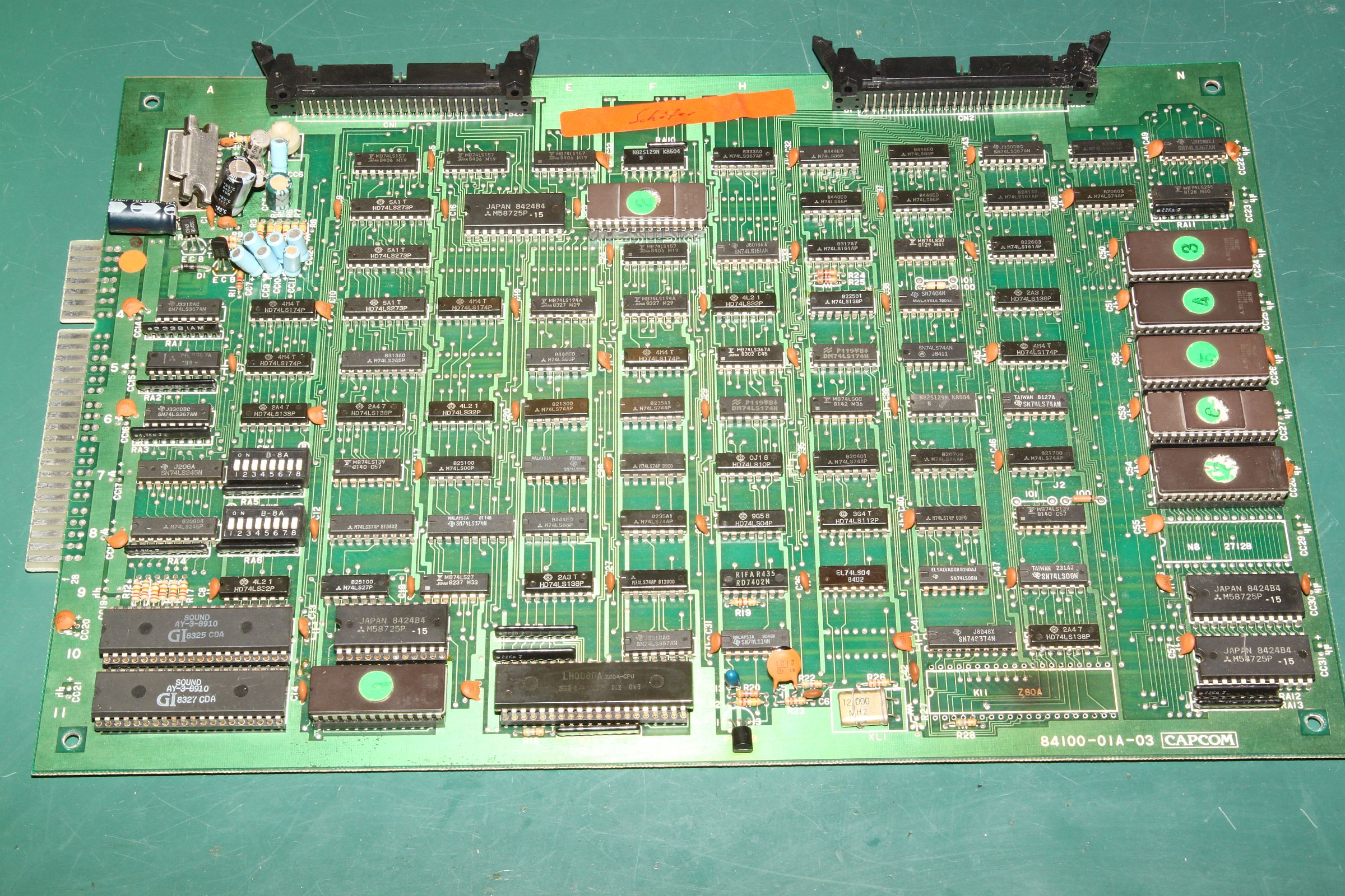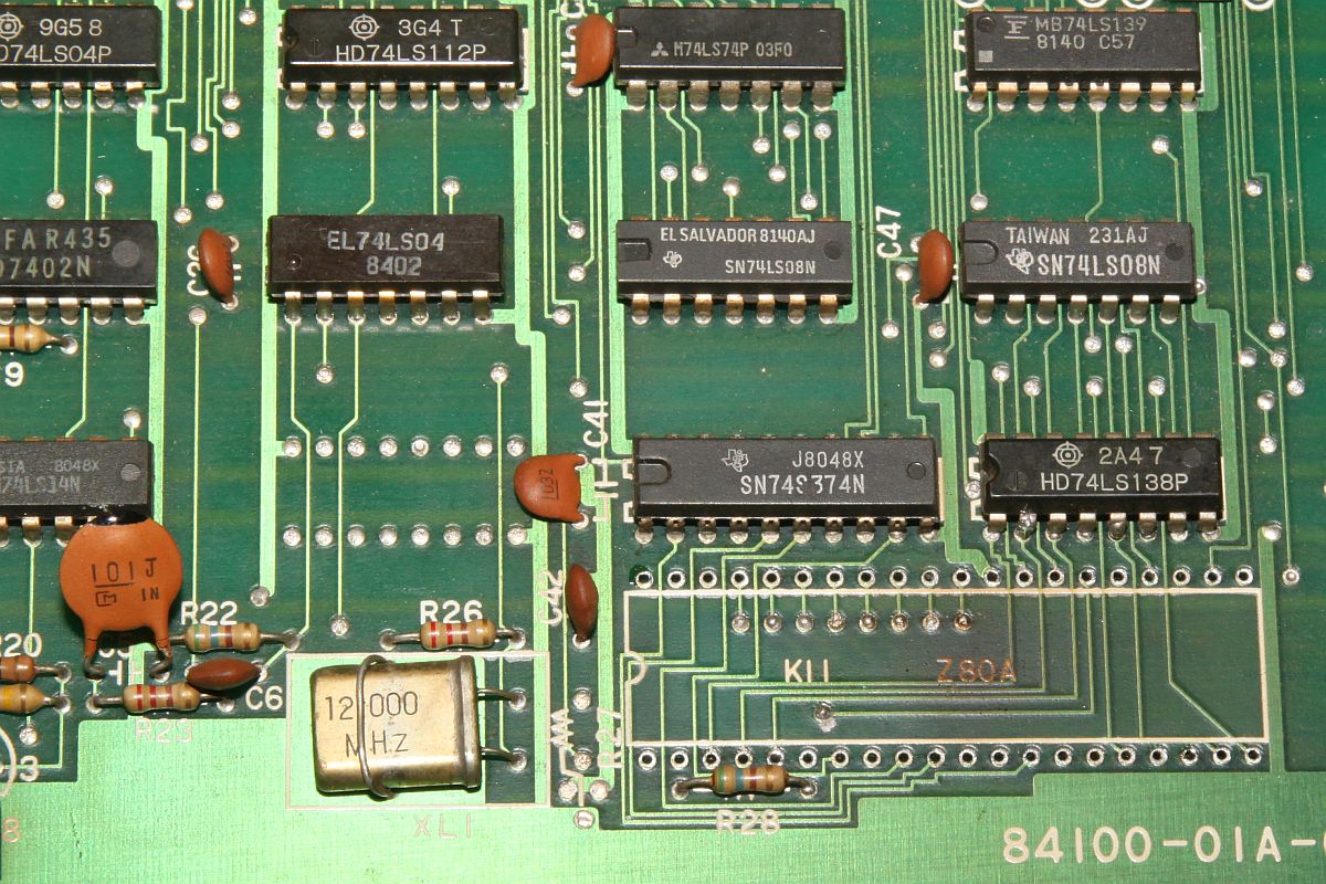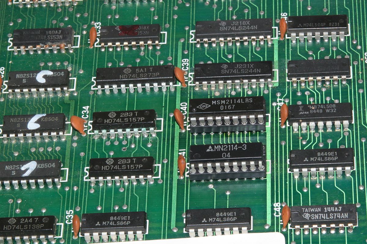 {Fehlerbeschreibung} eine Capcom 1942 völlig tot... Kein Bild kein Ton, die erste Untersuchung zeigt: kein Quarztakt, der Z80 ist gebraten. Austausch von Quarz, Z80 und 74LS04 (so ein suspekter Bayerisch-Malz-Typ) bringt keine Besserung, der Takt will nicht anspringen. Die Takterzeugung bei der 1942 ist etwas kritisch, nicht alle Typen 74LS04 funktionieren, daher reißt mir der Geduldsfaden und ich setze einen Fertigoszillator ein. Elektronik-Fast-Food... {Reparaturergebnis} Den 74LS04 brauche ich ja nicht mehr, also raus damit... dachte ich mir so... {Reparatur 2} Ups, da fehlt ja jede zweite Spalte im Bild und Sprites gibt es auch keine (man kann sie in Spalte 0 erahnen...). Die weitere Fehlersuche ergibt Folgendes: ich entfernte den 74LS04 wegen des Quarzoszillators und übersah, dass da noch Inverter anderweitig verwendet wurden. So zum Beispiel, um den horizontalen Blankingimpuls zu generieren. Ohne Inverter taktet dieser mit halber Pixelfrequenz und löscht damit jedes zweite Pixel... Also flugs den Inverter geholt und nur den Systemtakt abgeklemmt... ganz professionell... {Teilerfolge} Uff, die Zeilen sind vollständig, die Sprites leben. Aber: manche Sprites werden an manchen Stellen horizontal verschoben dargestellt. Unregelmäßigkeiten in den H und V Takten für die Adressierung der bewegten Objekte kann ich nicht feststellen (Das würde sich auch auf den scrollenden Hintergrund auswirken), vermutlich haben die 2114 einen Schuss, die Sprites und deren Position enthalten... (Object RAM). Ich werde weiter berichten. {Reparatur 3} Sodele, jetzt ganz gnadenlos die beiden Object-RAMs getauscht, 2114 gehen ja immer gerne mal kaputt: {Sieg!} Und schon sind alle Sprites an der richtigen Stelle! {Update: Reparatur 4} Gerade wollte ich das Mistding verpacken und zurücksenden, da fiel mir beim erneuten Endtest wieder ein Fehler auf: {Erneuter Sieg!} Langer Suche kurzer Sinn: ein GFX-Eprom war ein klein wenig angefressen... (ich auch!): |