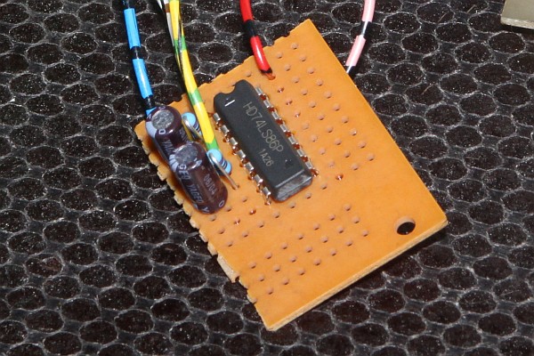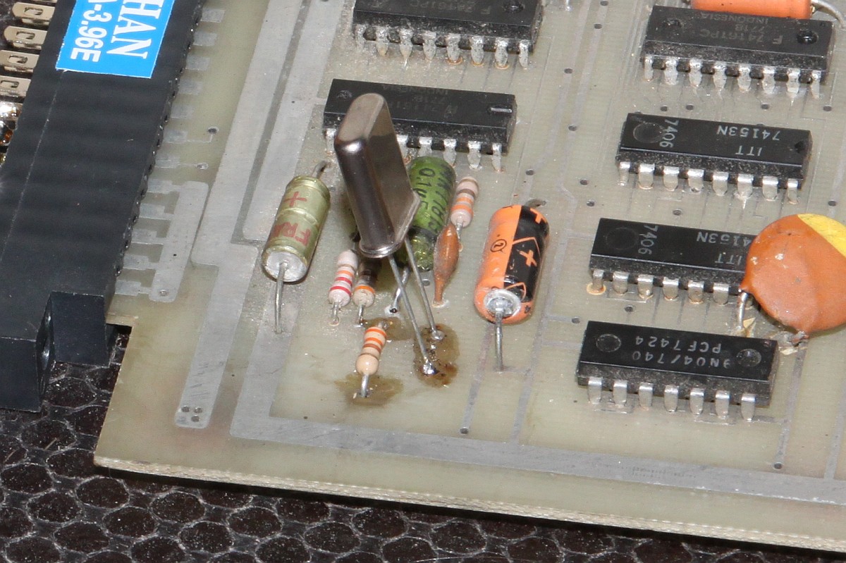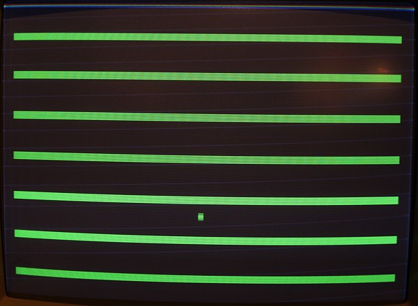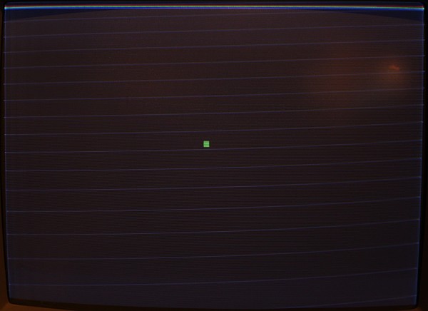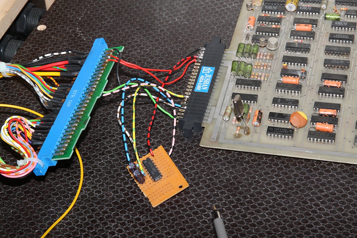 {Eine unbekannte diskret aufgebaute Arcade-PCB von Lich} Keiner konnte mir bisher etwas über diese Platine sagen. Von der Komplexität her scheint sie nicht besser, als irgend ein Pong-Clone zu sein... {Anschließen} Plus und Minus bei 5V sind schnell ausgemessen. Video ist da schon schlimmer... Also erst mal einen Adapter basteln, dann mit dem Oszi die Videosignale heraussuchen und dann feststellen, dass das Teil separate H-Sync und V-Sync liefert. Also muss ein Sync-Adapter her: {Erste Reparatur} Auf den ersten Blick ist schon mal der Quarz defekt, weil kein Takt kommt. Das ist schnell repariert und dabei auch gleich den zerbrochenen Widerstand am Quarz gefixt... {Nicht viel los aber alt!} Das aktuellste Bauteil auf der PCB ist von 1977... vielleicht ist das ein Hinweis. Und die Inbetriebnahme liefert ein bewegtes, aber langweiliges Bild... Aber außer einem kleinen Quadrat, welches geduldig von unten nach oben auf dem Schirm wanderte und waagerechten Streifen, die alle 10-20 Sekunden eingeblendet werden, ist bisher noch nicht passiert. Keiner der verfügbaren Eingänge hat irgendwas am Spielverlauf geändert... |