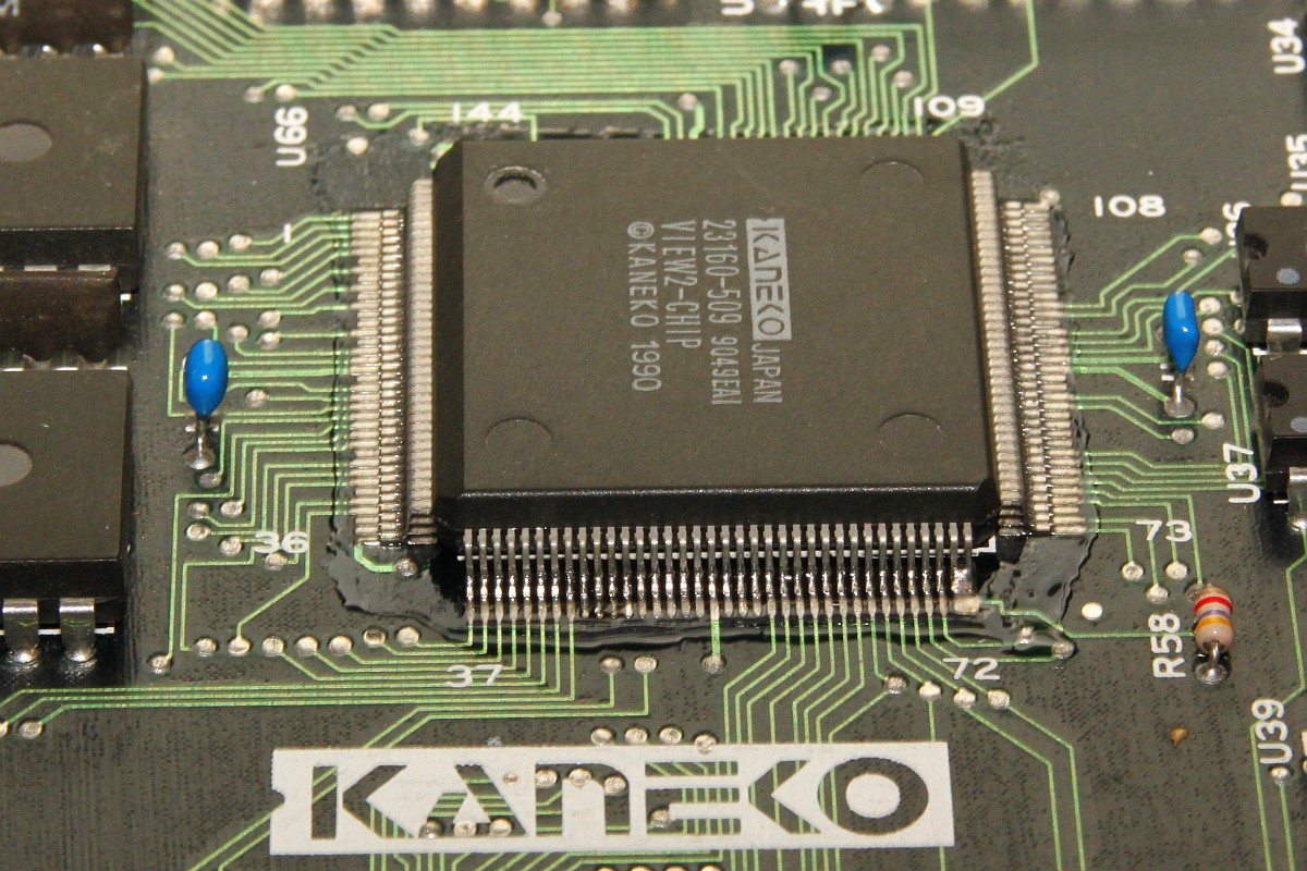 {Fehlerbeschreibung} Die Platine startet schon mal mit einer kapitalen aber fast nicht lesbaren Fehlermeldung: {Diagnose} Diese resettet immer wieder... Epromdrücken hilft nicht, Platine biegen schon: Der Speichertest läuft durch und das Spiel startet: {Fehlersuche und Reparatur} Na toll. Da werde ich wohl mal den Custom nachlöten müssen... Flussmittel drauf und sauber verlöten... {Inbetriebnahme} Schon startet alles problemlos, auch ohne mechanische Gewalt... {Reparatur 2} Ach nee, noch mehr Grafikprobleme, also den zweiten Custom auch noch bearbeiten, aber da sind fix die Pads ab, die Leiterplattenqualität ist echt mies! Da bleibt mir nichts anderes übrig, als den Custom ablöten, die Beinchen geradebiegen, die Pads vorsichtig verzinnen und den Custom wieder drauflöten. Ganz einfach. Was für ein Aufwand für ein nicht ganz so beliebtes Spiel. Aber eigentlich haben alle Arcade-PCBs ein Recht auf einwandfreie Funktion... ;-) |