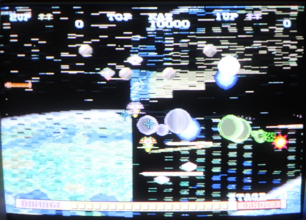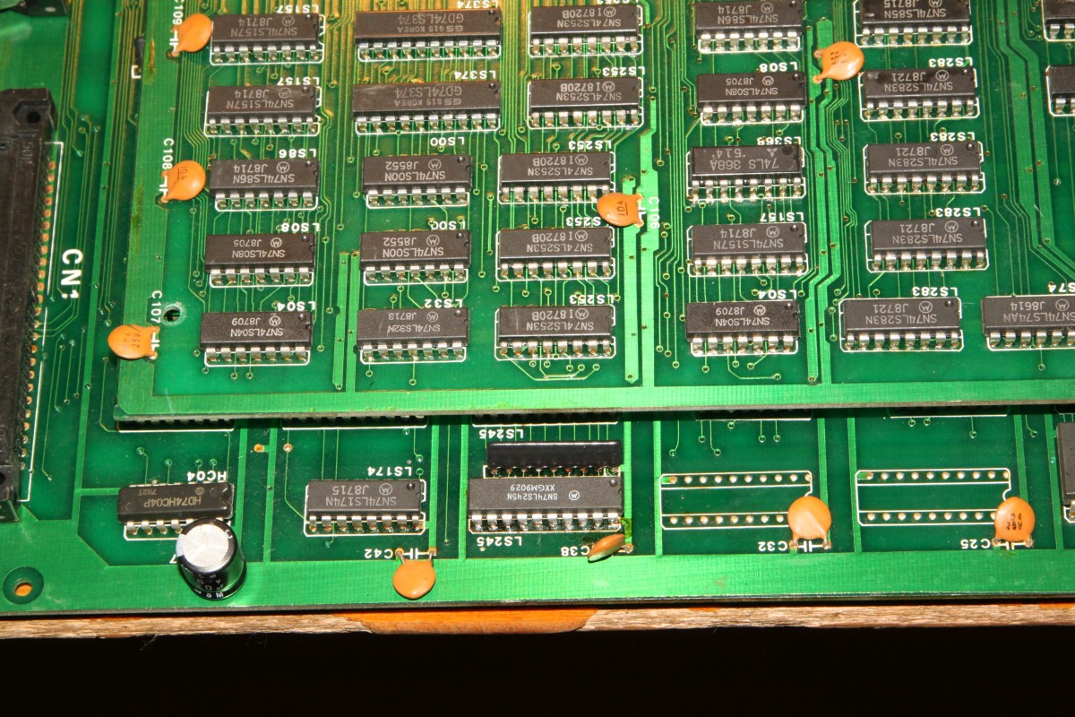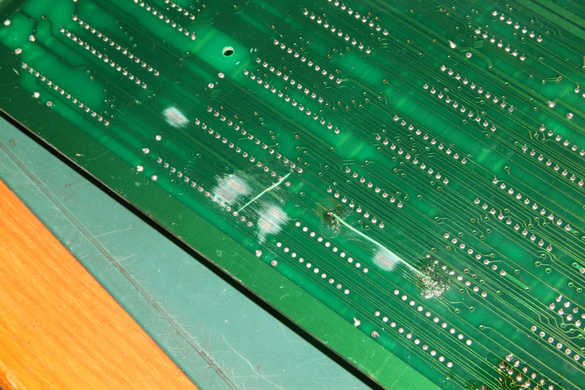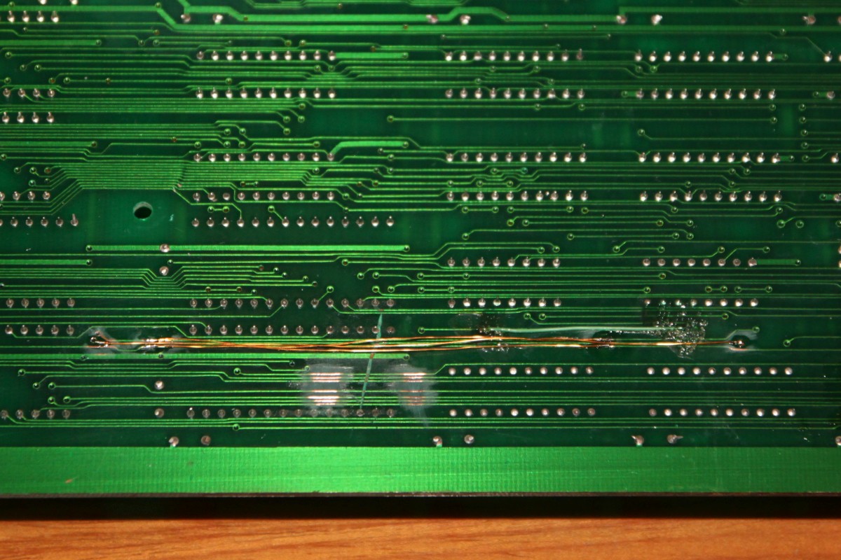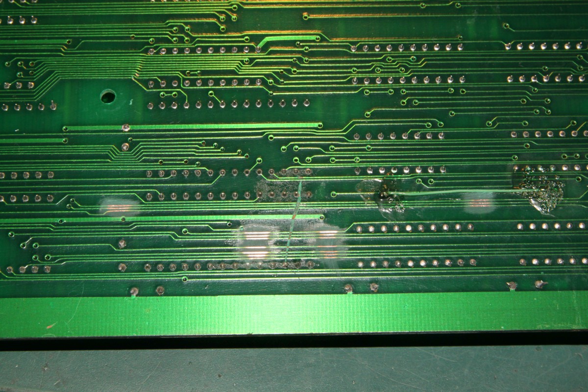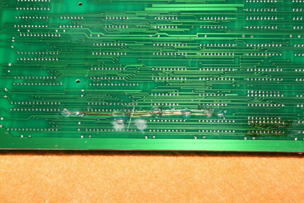 {Fehlerbeschreibung} S.D.I. - ein sauber gearbeitetes Bootleg eines SEGA System 16A Systems... Eingeliefert mit massiven Grafikfehlern. {Screenshots} Sprites funktionieren, Textlayer geht auch - aber die Tiles sind korrupt: {Fehlersuche} Die Fehlersuche ergab korrupte Datenleitungen am Tile-ROM, welches sich übrigens weit weg von den Tile-GFX-EPROMs befindet... Präventiv hab ich mal einen bidirektionalen Buffer getauscht, was aber nichts gebracht hat... {Reparatur} Dann fiel mir auf der Unterseite der PCB ein massiver Kratzer auf und ich nahm den Glasfaserstift zur Hilfe, um den Durchgang der Leiterbahnen zu prüfen: alle drei durch... Dann mit ruhiger Hand Fädeldraht gelötet... Und mit Heißkleber fixiert: {Erfolg!} Schon klappt es wieder mit den Tiles... Manchmal sollte man sich auf die einfachen Dinge konzentrieren. ;-) |