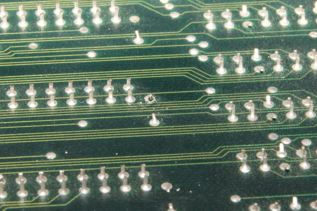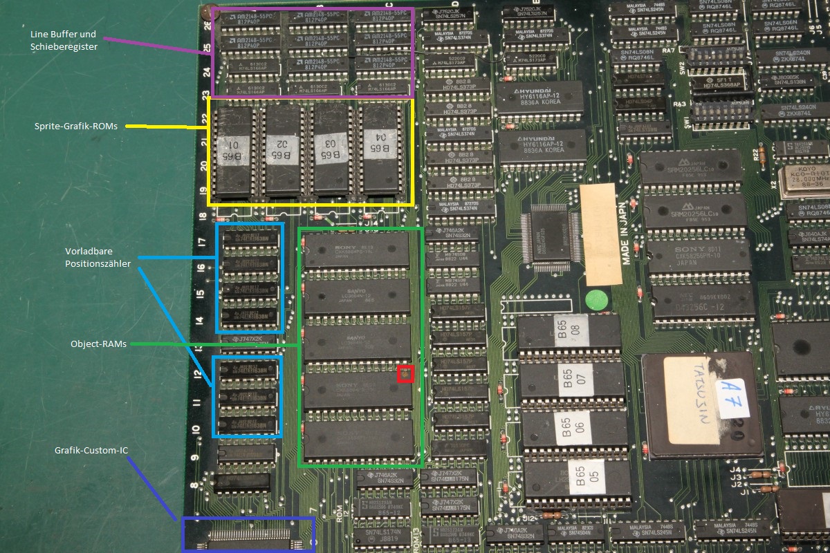{Diagnose und Reparatur} Von Truxton gibt es kein Schaltbild, also ist akribisches Signalprüfen im Bereich Object-RAM, Positionszähler, GFX-ROMs angebracht. Addierer hat die Videoeinheit keine Separaten, das macht wohl der Custom-Chip auf der Platine. Nach langer Suche finde ich ein fast-Stuck-High-Adress-Signal an einem Object-RAM. Ursache ist ein Beinchen eines Abblockkondensators, welches sich an eine nahegelegene Leiterbahn gekuschelt hat. Nur ein Idiot würde Leiterbahnen so derart knapp an Pins verlegen...