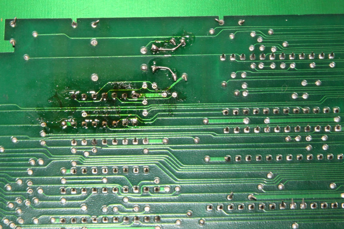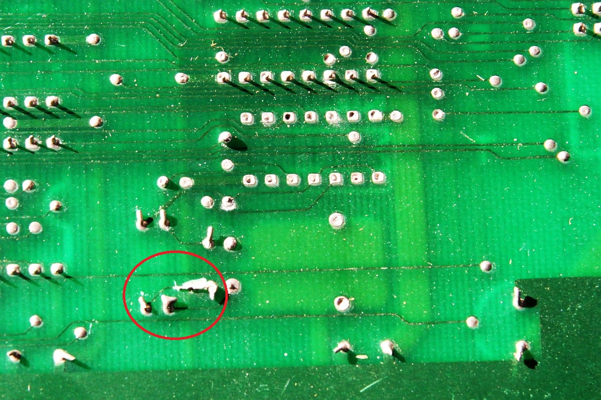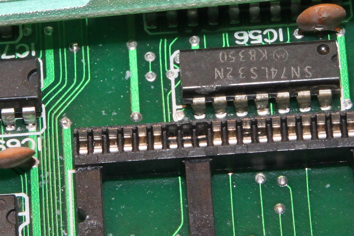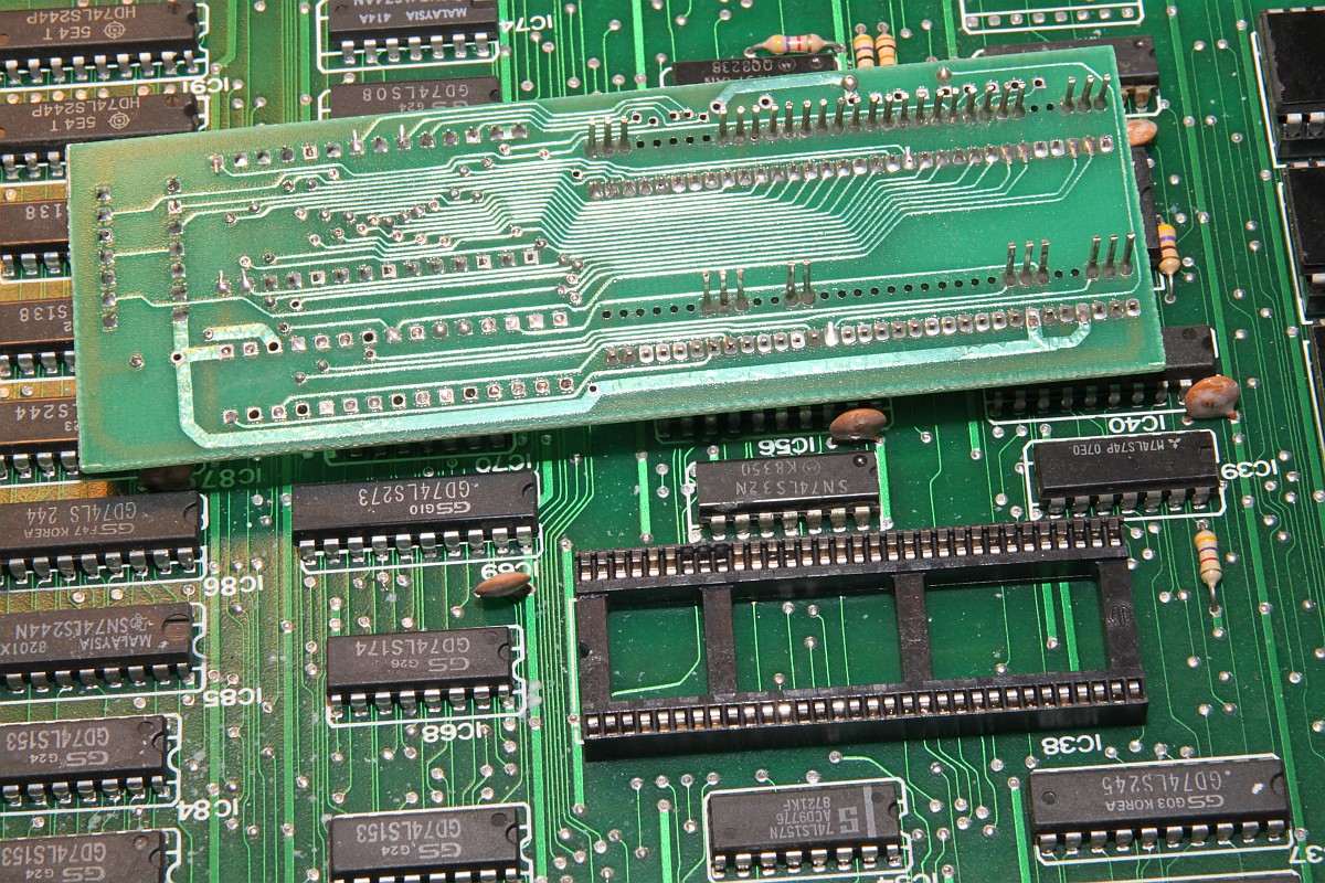 {Double Dragon Bootleg} Symptome: kein Ton, sonst geht alles... ein grenzwertiges Bootleg mit ultradünnen Leiterbahnen und miesen Sockeln. Dafür stimmt der Original-Schaltplan. Man nimmt, was man bekommt. {Fehlersuche} Speichertest O.K. Der Lautsprecher brummt, wenn man die AMP-Beinchen befingert, also muss der Fehler weiter hinten liegen. Die Soundchips bekommen keinen Input, also muss der Fehler weiter hinten liegen... Der gesamte Soundbereich bekommt überhaupt keinen Takt, der Quarz ist still, Treiber ist ein Goldstar 74LS04... also raus damit. Leiterbahn durchtrennt... kann ja nicht schwingen. Also Sockel und Original-IC rein - Takt geht und der Ton kommt auch, wenn auch recht krächzig... ich schiebe das auf das Bootleg. Dann - fünf Minuten später: die Grafik verändert sich signifikant... Da stirbt mir doch was in der Sprite-Generierung unter der Reparatur... na ja, ist ja nicht das erste Mal. Klar, das ich nach den Hinweisen im Netz erst mal die Sprite Buffer RAMs getauscht habe... hier stehen die Daten drin, welche Sprites an welcher Stelle zu erscheinen haben, noch nicht die Grafikdaten! Auch hier werden gerade und ungerade Zeilen in unterschiedlichen RAMs abgelegt... könnte also der Fehler sein. Ein Datenbus sieht so aus: Der im Nachbar-RAM so: (kommt aus einem Goldstar Bustreiber...) Aber daran lag es nicht. Sowohl RAM-Tausch als auch Brücken des schwächlichen Treibers brachte keine Änderung. Nun musste ich die komplette Grafikkette durchgehen. Das Umschaltsignal zwischen geraden und ungeraden Zeilen hilft dabei. Vor den GFX-EPROMs (Adressbus) war noch alles bei beiden Zeilen gleich... nach den EPROMs (Daten) auch... Aber am Datenausgang des letzten RAMs IC120 (enthält die echten Grafikdaten) erkennt man einen deutlichen Unterschied zwischen den Zeileninhalten:br> Entweder ist das RAM defekt oder davor geht was verloren... Die ersten vier Adressbits sehen gut aus... Die zweiten vier nicht so... Da liegt der Fehler... ein 74LS86 ist gestorben... Der Huckepacktest funktioniert hier gut: Schon ist die Grafik vollständig. Alle RAMs haben funktioniert. {Das Finale} Was noch gefehlt hat: der Quarztakt in der Soundecke. Nachdem weder original alte, noch "S" Typen noch neue "LS" 7404er getan haben, bin ich - Astro's Rat folgend - konsequent auf Fehlersuche mit dem Durchgangsprüfer gegangen. Diese Bootlegs mit unscharfen und ewig dünnen Leiterbahnen... hier war tatsächlich eine mit bloßem Auge nicht sichtbare Unterbrechung... Draht hilft. Und die PCB ist nicht mehr taktlos. Stabil und nun mit glasklarem Sound. Grafik O.K.: Harte Jungs... Was machen die da eigentlich? ;-) |