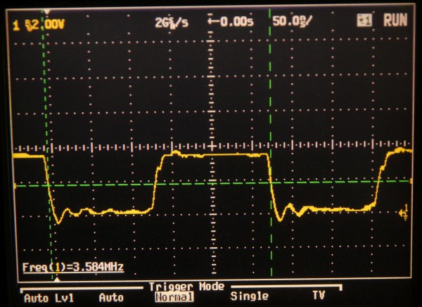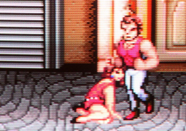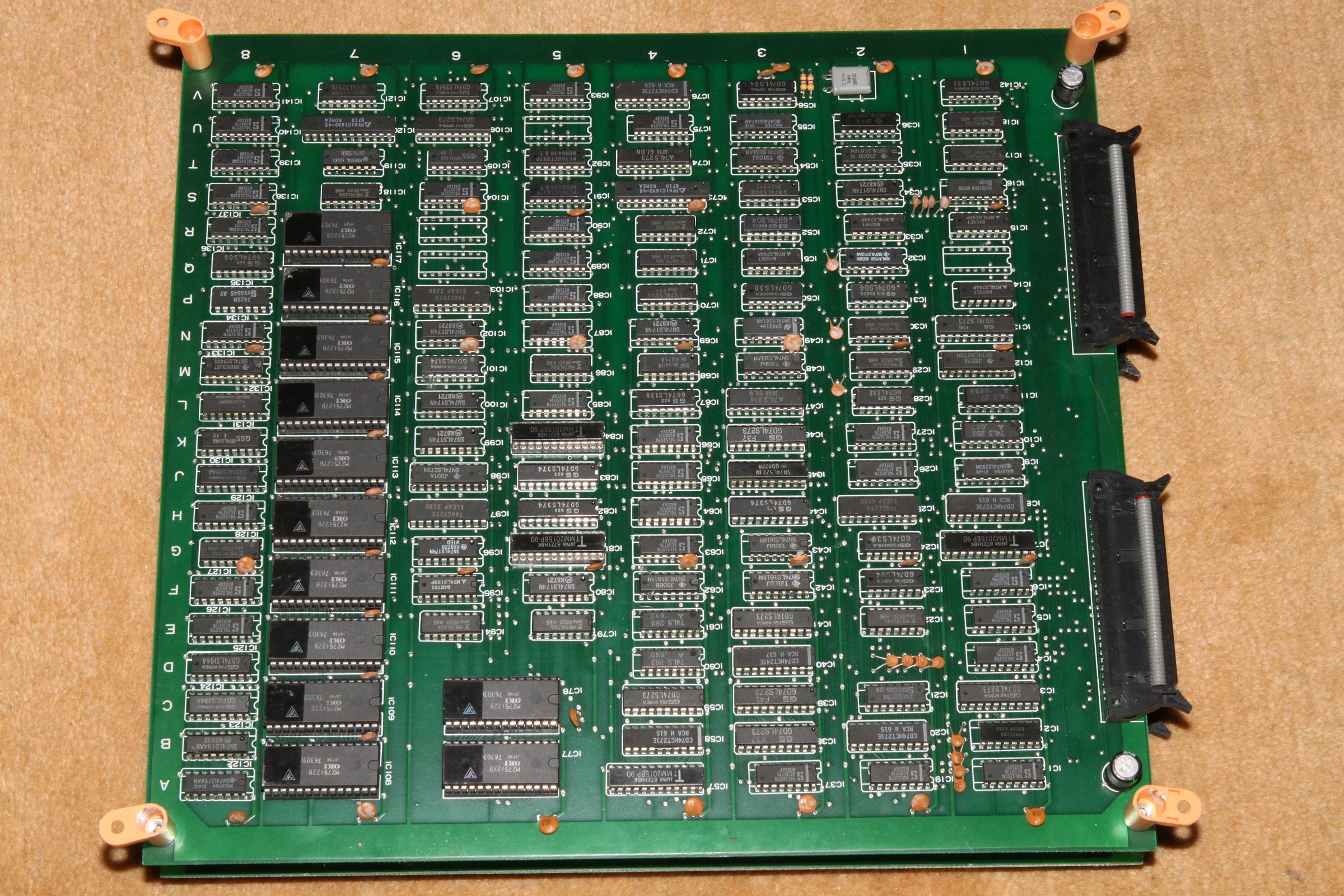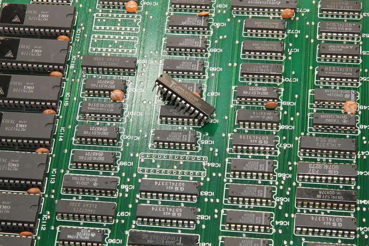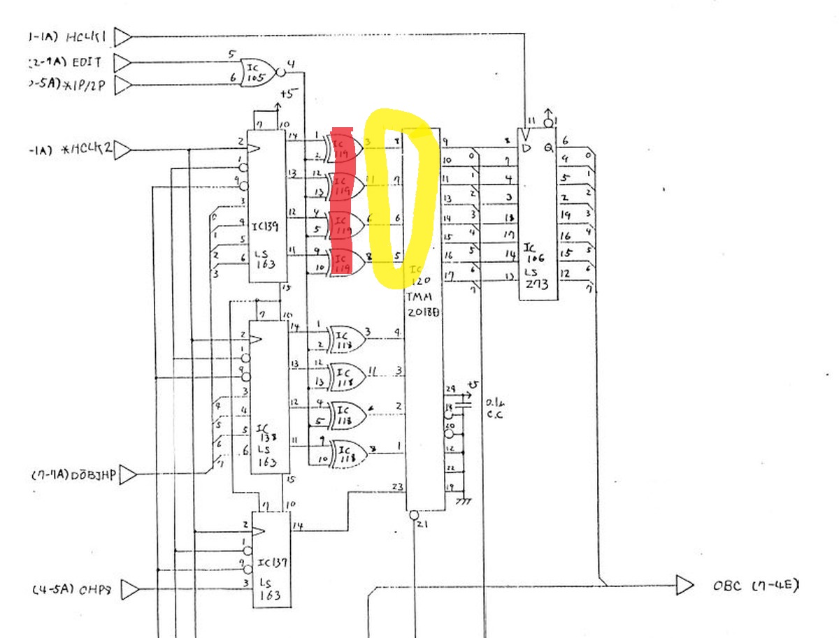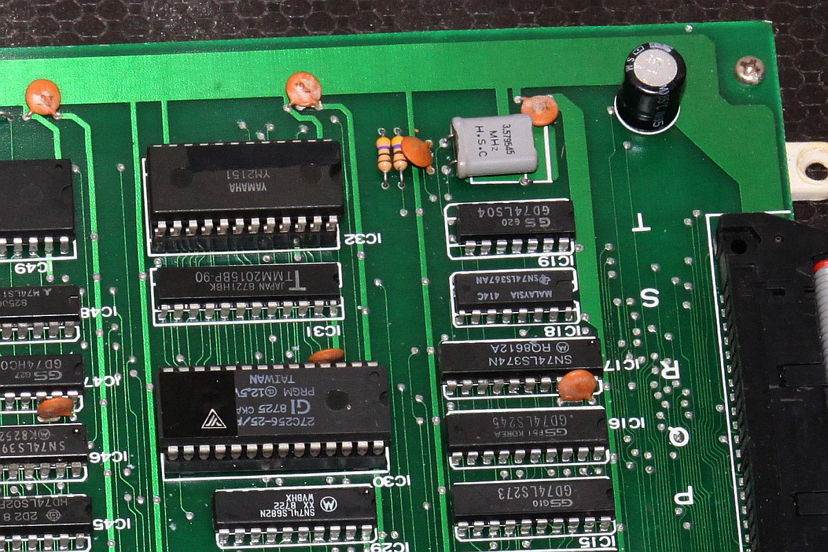 {Double Dragon Bootleg} Symptome: kein Ton, sonst geht alles... ein grenzwertiges Bootleg mit ultradünnen Leiterbahnen und miesen Sockeln. Dafür stimmt der Original-Schaltplan. Man nimmt, was man bekommt. {Fehlersuche} Speichertest O.K. Der Lautsprecher brummt, wenn man die AMP-Beinchen befingert, also muss der Fehler weiter hinten liegen. Die Soundchips bekommen keinen Input, also muss der Fehler weiter hinten liegen... Der gesamte Soundbereich bekommt überhaupt keinen Takt, der Quarz ist still, Treiber ist ein Goldstar 74LS04... also raus damit. Leiterbahn durchtrennt... kann ja nicht schwingen. Also Sockel und Original-IC rein - Takt geht und der Ton kommt auch, wenn auch recht krächzig... ich schiebe das auf das Bootleg. Dann - fünf Minuten später: die Grafik verändert sich signifikant... Da stirbt mir doch was in der Sprite-Generierung unter der Reparatur... na ja, ist ja nicht das erste Mal. Klar, das ich nach den Hinweisen im Netz erst mal die Sprite Buffer RAMs getauscht habe... hier stehen die Daten drin, welche Sprites an welcher Stelle zu erscheinen haben, noch nicht die Grafikdaten! Auch hier werden gerade und ungerade Zeilen in unterschiedlichen RAMs abgelegt... könnte also der Fehler sein. Ein Datenbus sieht so aus: Der im Nachbar-RAM so: (kommt aus einem Goldstar Bustreiber...) Aber daran lag es nicht. Sowohl RAM-Tausch als auch Brücken des schwächlichen Treibers brachte keine Änderung. Nun musste ich die komplette Grafikkette durchgehen. Das Umschaltsignal zwischen geraden und ungeraden Zeilen hilft dabei. Vor den GFX-EPROMs (Adressbus) war noch alles bei beiden Zeilen gleich... nach den EPROMs (Daten) auch... Aber am Datenausgang des letzten RAMs IC120 (enthält die echten Grafikdaten) erkennt man einen deutlichen Unterschied zwischen den Zeileninhalten:br> Entweder ist das RAM defekt oder davor geht was verloren... Die ersten vier Adressbits sehen gut aus... Die zweiten vier nicht so... Da liegt der Fehler... ein 74LS86 ist gestorben... Der Huckepacktest funktioniert hier gut: Schon ist die Grafik vollständig. Alle RAMs haben funktioniert. {Das Finale} Was noch gefehlt hat: der Quarztakt in der Soundecke. Nachdem weder original alte, noch "S" Typen noch neue "LS" 7404er getan haben, bin ich - Astro's Rat folgend - konsequent auf Fehlersuche mit dem Durchgangsprüfer gegangen. Diese Bootlegs mit unscharfen und ewig dünnen Leiterbahnen... hier war tatsächlich eine mit bloßem Auge nicht sichtbare Unterbrechung... Draht hilft. Und die PCB ist nicht mehr taktlos. Stabil und nun mit glasklarem Sound. Grafik O.K.: Harte Jungs... Was machen die da eigentlich? ;-) |