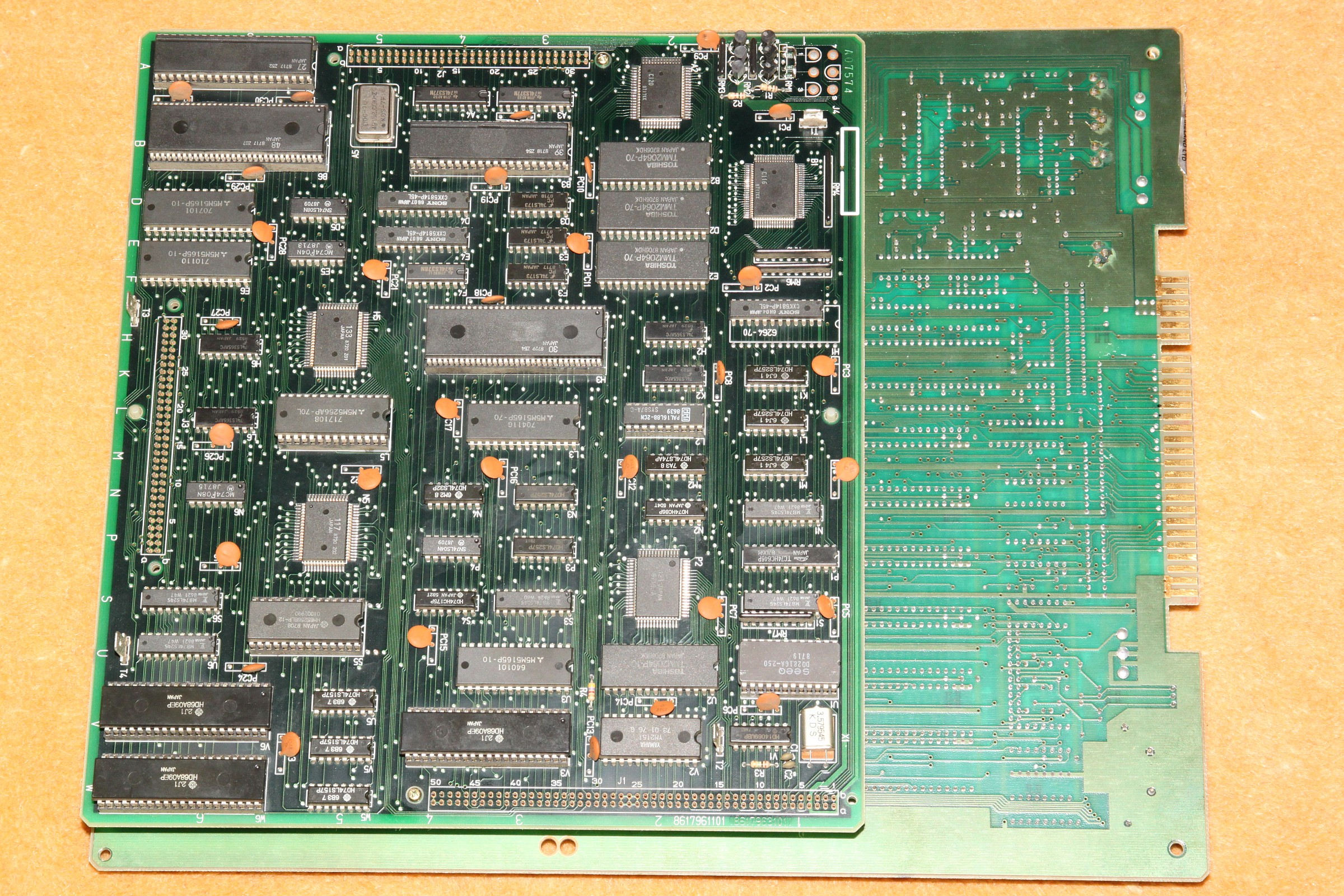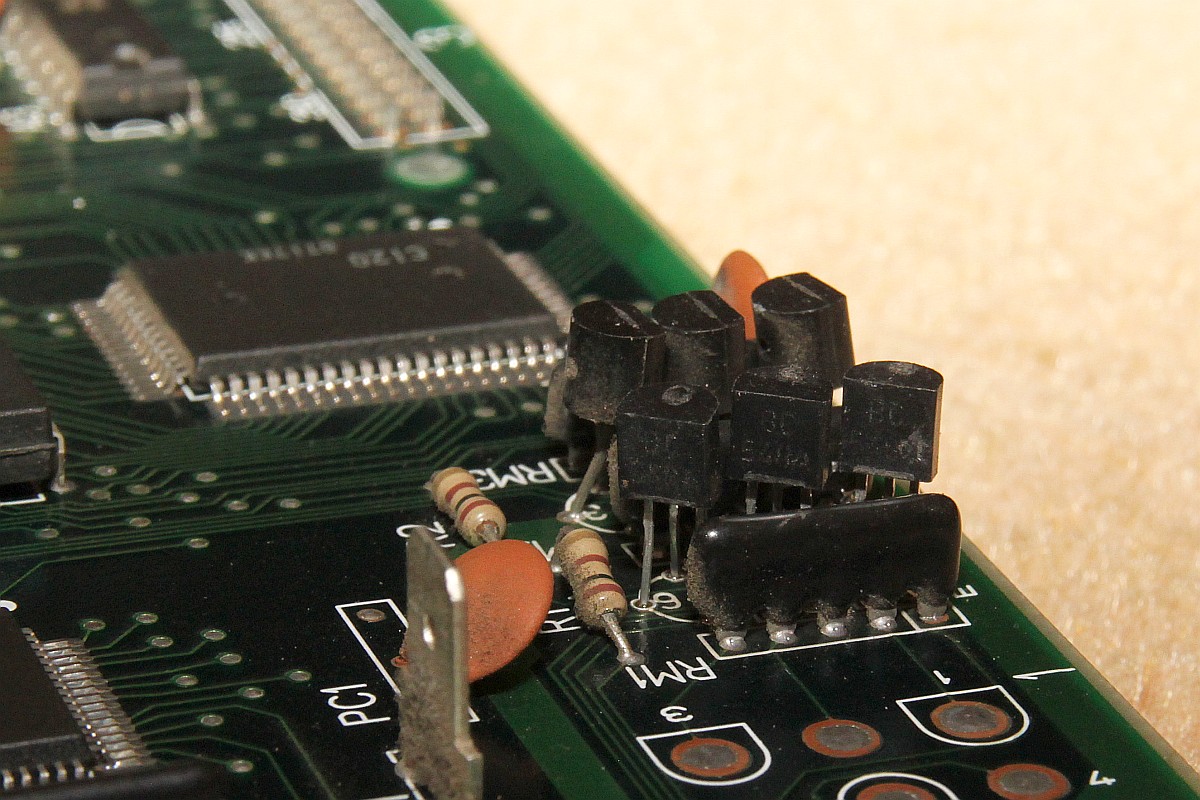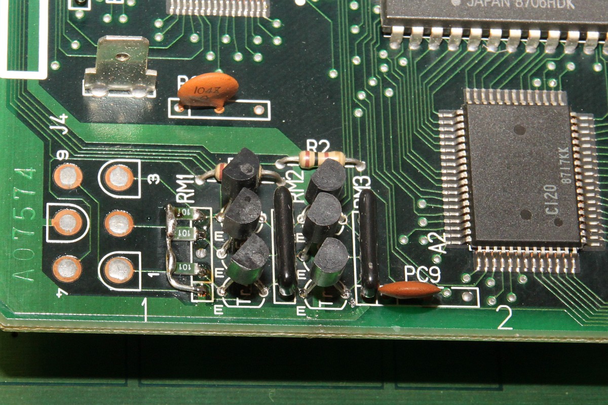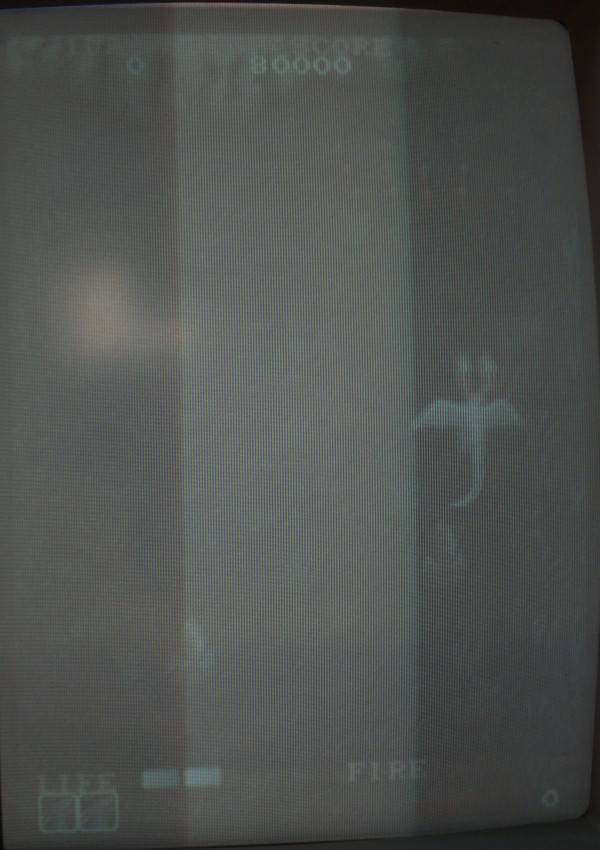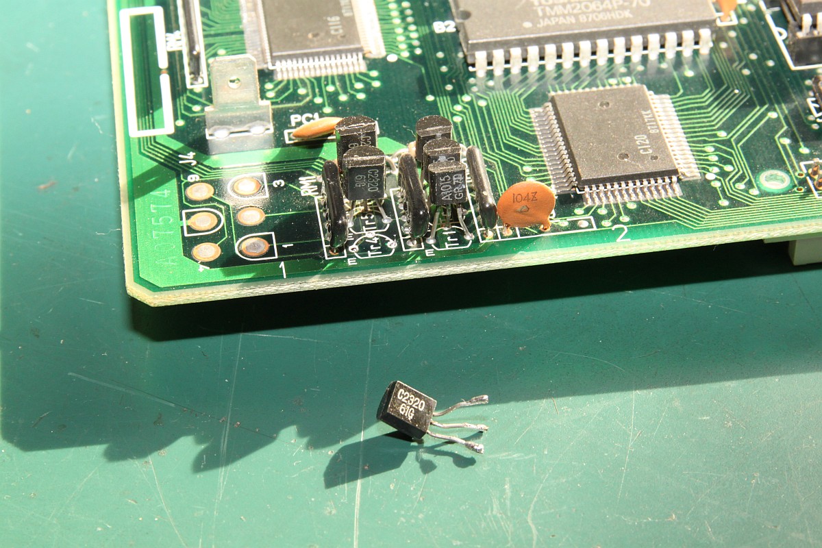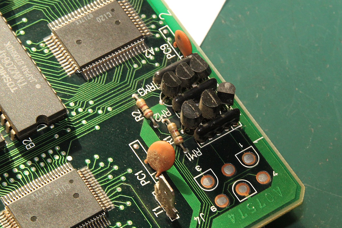 {Dragon Spirit Conversion Video} Ist schon ein Jahr her, aber ich hatte ganz vergessen, die Details zu veröffentlichen. Dragon Spirit Conversion mit defekter Video-Ausgangsstufe. Symptome: So sieht die PCB aus: Und den Videotreiberschaltplan entnimmt man am Besten PacMania: Das Oszi sagt mir, dass vor der Endstufe alle Videosignale gut anliegen, also müssen die Ausgangstransistoren defekt sein. Das passiert hier gerne, wenn man versehentlich Spannung auf RGB gibt... Doch - welche Transistoren nehmen, 2SC23220 und 2SA1015 sind im Europäischen Raum nicht gerade häufig. Glücklicher Weise sind in dieser Anwendung die popeligsten Universaltransistoren gerade gut genug, auch wenn sie eine etwas andere Binchenbelegung haben: Erst mal mit einem probieren: Es tut sich was! Alle drei getauscht: Das Bild ist seltsam: Erst nach Tausch der anderen drei Transistoren und des einen Widerstandsnetzwerkes (auch durchgebrannt...)... ...ist das Bild wieder richtig gut: Geiles Spiel übrigens! |