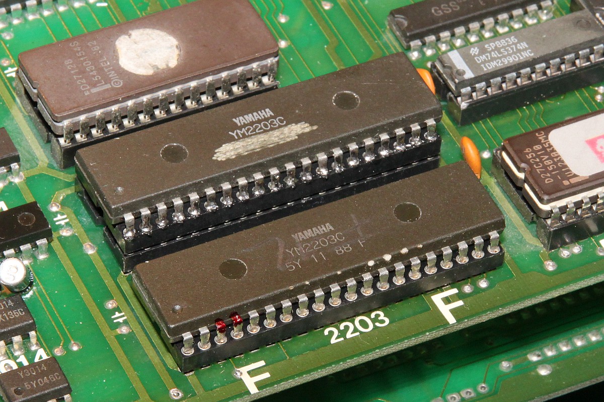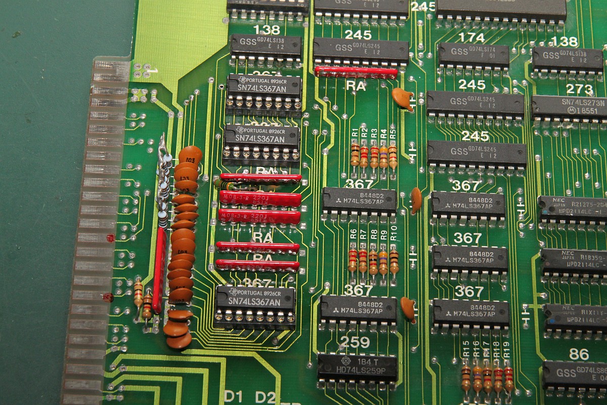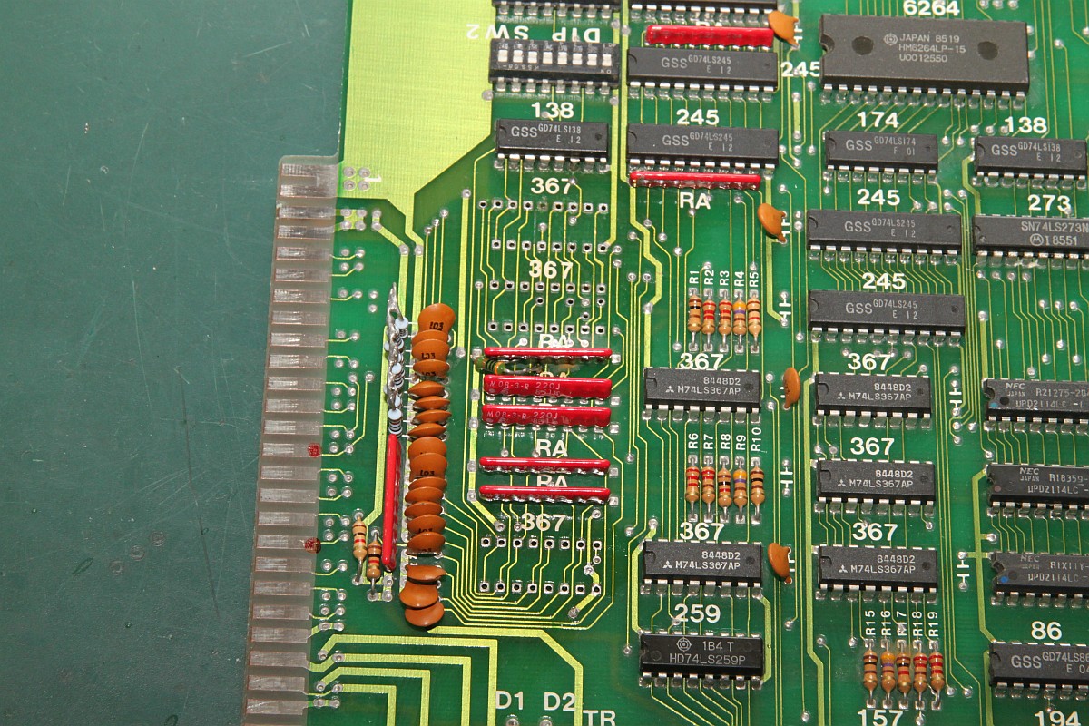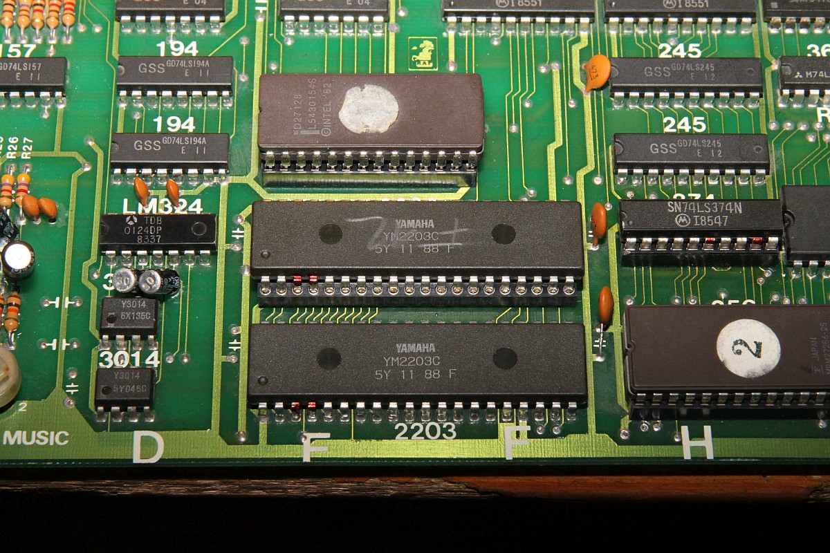 {Ghost 'n Goblins} Hatte ich schon 2014 auf dem Tisch - Grafikfehler behoben... der Nachteil, wenn man aus Faulheit nur Power und RGB verkabelt, dann fallen einem die anderen Fehler nicht auf. Also dachte ich mir, bevor das Ding zurück zu seinem Besitzer geht, teste ich noch mal alles durch. Adapter gebastelt - keine Reaktion auf Münzeinwurf... Ghost 'n Goblins hat den Nachteil, das es mit einem verlockenden 2x28-poligen Stecker ausgestattet ist - aber kein JAMMA! Daher scheint mir, werden gerne mal die Eingangskreise zerschossen... Drei 74LS367 defekt... Teile raus... Sockel rein... Natürlich Bootlegmäßig wieder mal eine Leiterbahn gehimmelt... Super - Das Spiel geht. Münzeinwurf, Steuerung, alles gut. Sound: Nope! Gibt's eigentlich irgendwas, was an dieser PCB funktioniert? Die Oszisuche im Soundkreis zeigt einen schlappen Datenbus D2 und D3... Ohje... der Originale Capcom Schaltplan arbeitet mit einem Custom - das Bootleg hat aber gut nachgebaut und den Custom durch einen Z80 mit RAM ersetzt... sonst alles ähnlich: Ganz schön was an Teilnehmern am Datenbus... Ich fange mit dem Bustreiber an: Der war's natürlich nicht... dann eben der RAM... War's natürlich nicht... Den YM-2203? Auch nicht... Z80 getauscht - nix. EPROM lässt sich perfekt lesen... Der zweite YM-2203 verbessert auch nichts... Beide YM raus: keine Besserung. Aus Verzweiflung Brenne ich das EPROM trotzdenm neu: ein Datenbit geht wieder, neues RAM: das zweite Datenbit kommt... Das Ende vom Lied: RAM und ROM haben sich gegenseitig runtergezogen und der eine YM ist defekt. Das EPROM alleine hat sich aber lesen lassen, komisch. Bis auf den YM-2203 hab ich alles da - eingesteckt: Jetzt geht auch der Ton, zumindest die eine Hälfte! Leider hat die Post wenig Rücksicht darauf genommen und einige Beinchen völlig verbogen: Egal, bekommt er halt eine Prothese - und das Schöne dabei: er funktioniert einwandfrei. GnG in voller Soundvielfalt! |