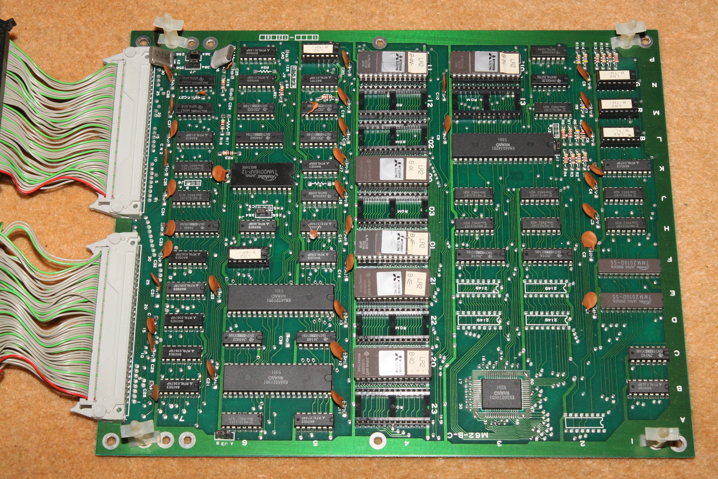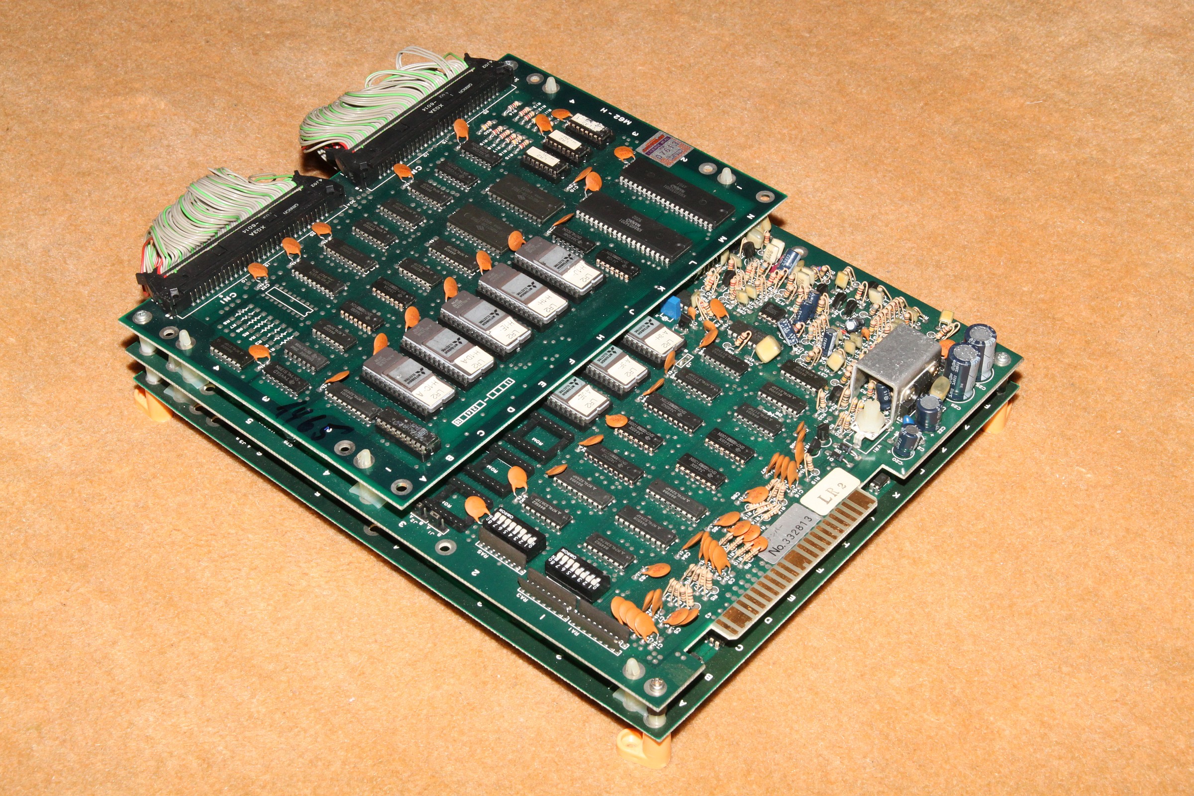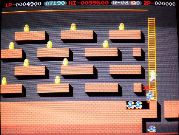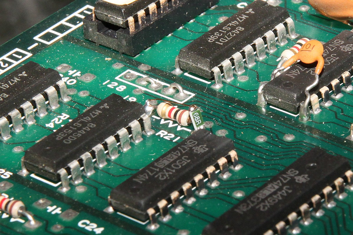 {Lode Runner} Heute: ein schönes Original: Lode Runner - sauber aufgebaute PCBs, übersichtlich, kein Schaltplan... {Diagnose} Heute: ein schönes Original: Lode Runner - sauber aufgebaute PCBs, übersichtlich, kein Schaltplan...Adapter bauen, anschließen, kein stehendes Bild - auf den Fotos sieht es besser aus, als es ist... {Reparatur} Kein Sync... woran kann das liegen? Da hilft nur eine Durchgangspiepser-Orgie vom Stecker bis über drei Platinen. Composite Sync wird von einem 74LS08 zusammengbaut und über einen 1kOhm Widerstand an die Steckerleiste gegeben - bei 75 Ohm Eingangswiderstand der gängigen Monitore ist das eine suboptimale Idee - vom Signal bleibt nichts übrig! Ein Überbrücken mit 68 Ohm (ich hatte leider nur SMD da) behebt das Problem sofort: Ach, so sieht es doch schon besser aus - das Spiel ist echt gut gemacht. Ich spielte es damals gerne auf dem Apple ][... Auf der untersten PCB sind die Kandidaten: der obere Kreis zeigt den 1KOhm Widerstand, der untere Kreis den 74LS08, der das Composite Sync generiert: |