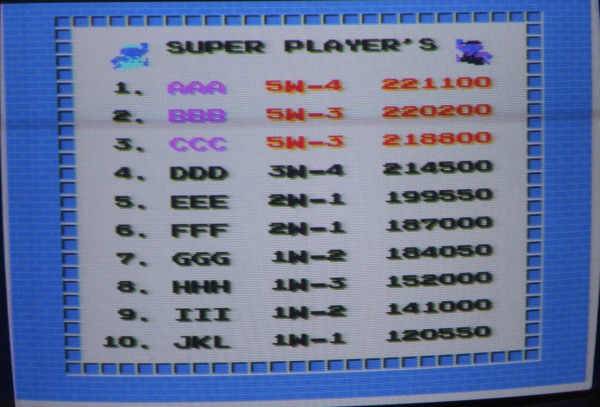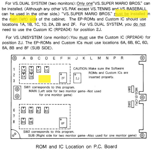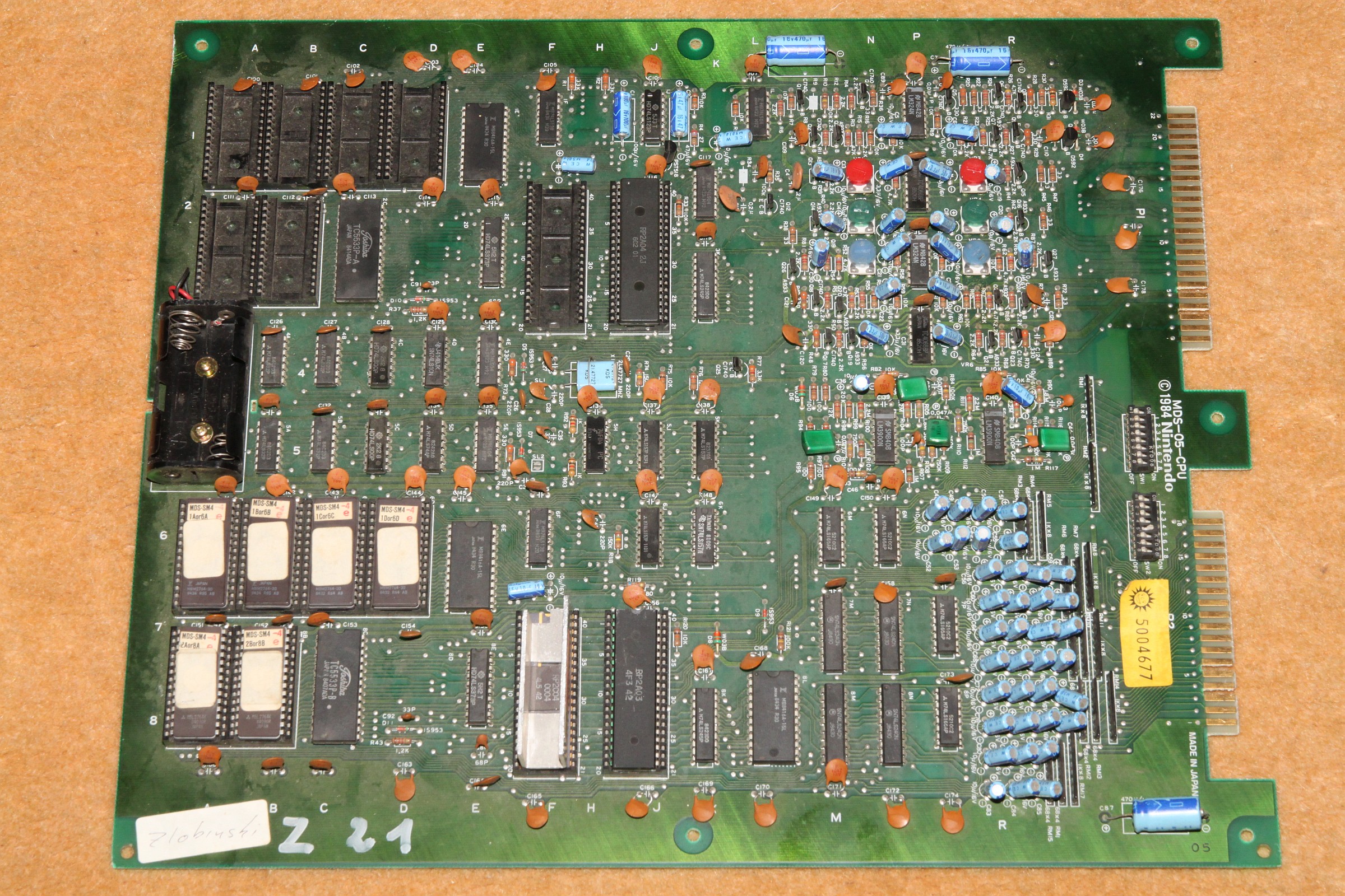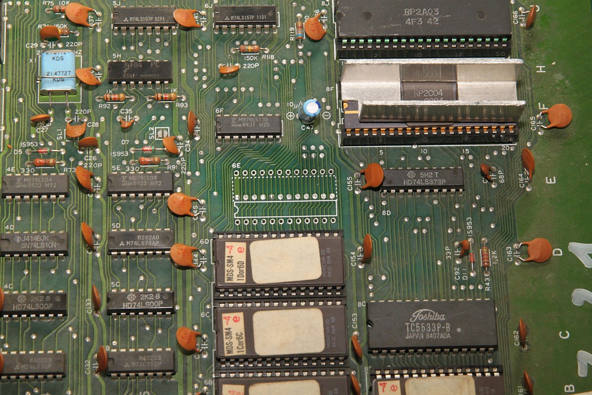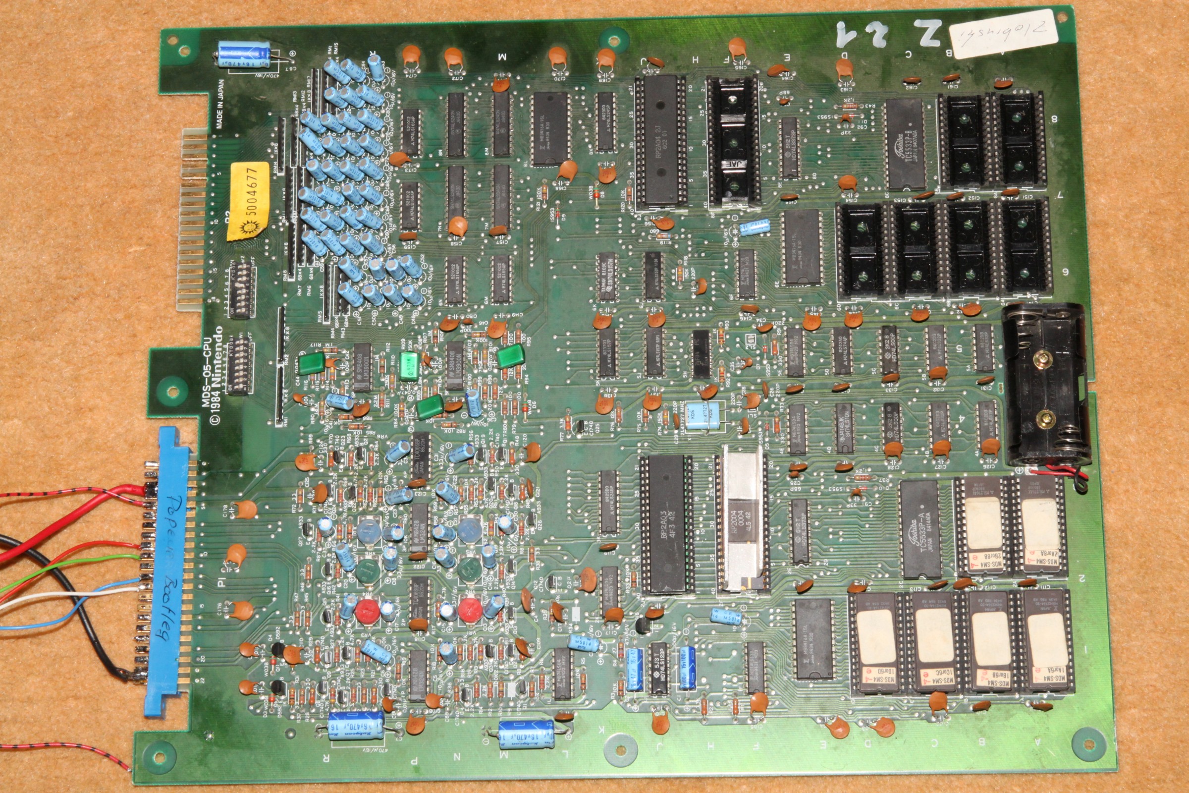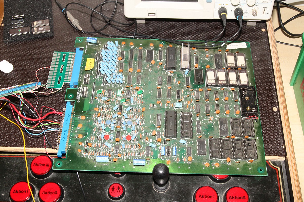 {Der Patient} Ein Patient von einem mir gut bekannten Horter außergewöhnlich kontaminierter PCBs: Nintendo VS mit Mario. Ist nicht allzu viel drauf, dafür ziemlich fiese Teile, Custom Grafik-CPUs, RAMs, die keiner kennt, etc... Immerhin gibt es einen Schaltplan. Nachdem ich endlich einen Adapter gelötet und rausgefunden hatte, welche Anschlüsse für die Master- und Slave Seite die richtigen sind, überraschte mich das Spiel mit einem eintönigen Gameplay: Bluescreen... Also hoffen, dass die GPU keinen Schuss hat und zielgerichtet an die Suche... Der Takt geht: Sync kommt raus. Gut so. Das Oszi erzählt mir von wildem Datenverkehr in der ersten Sekunde, dann ewige Stille. Mal die ROMs auslesen und prüfen: Mist, alle perfekt in Ordnung... Links, rechts... wo ist links? Das Dokument sagt was Anderes, als auf der PCB gesteckt ist... Probehalber mal umstecken: Einschalten... Hihi... da finde ich im ersten Augenblick die Fehlfarben nicht mal erschreckend... Videoverstärker hin? Doch falsche GPU-Palette? Moment: war da nicht was mit invertiertem Video bei Nintendo? Mal mein Irfanview machen lassen, wenn ich schon keinen Spezialmonitor habe: Uff... Un der Ton geht auch, den kann man hier aber auch bloß mit dem Signalverfolger prüfen, weil das Scheißteil keinen Amp auf der Platine hat. Ja, Links, Rechts, sind doch eh alles nur bürgerliche Begriffe... Der Kunde will natürlich, dass das Spiel auf beiden Seiten funktioniert. So werde ich noch die RAMs testen... Den neuen alten reingesetzt (ja, 6116 ist kompatibel zu MB8416A-15L): Angestöpselt - die Spannung steigt... Uff... geht! Das sind die Momente, die ich bei Arcade so liebe: eben repariert, Testlauf - nach 10 Minuten ist das Teil wieder verreckt... O.K., die Toshiba 6116 RAMs haben nicht den besten Ruf. Haben sie hiermit eindrucksvoll bestätigt. Jetzt kommt Qualität auf die PCB. |