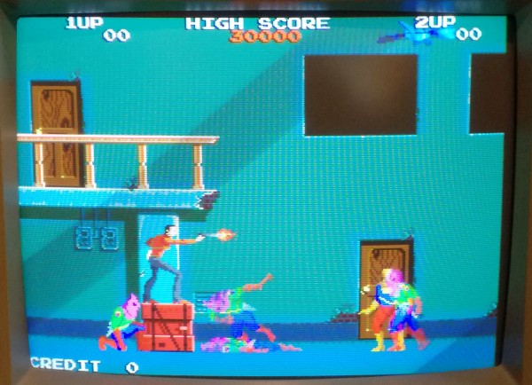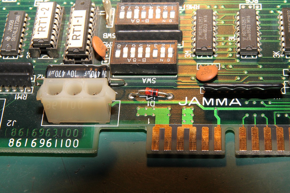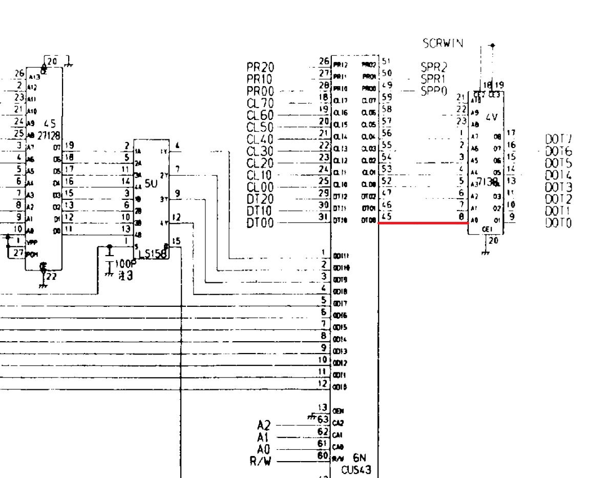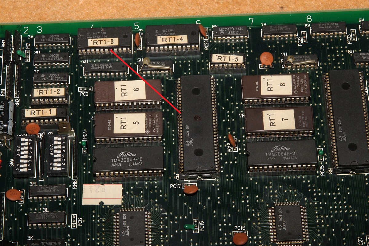 {Rolling Thunder Symptome} Mist - nicht meine eigene... ;-) Symptome: Tonausfall bei Berührung und Grafikfehler - falsche Farben und flackernde Pixel... Ein Spiel, was ich noch gerne hätte - der alten (TM) Zeiten wegen... Hier gut zu sehen: manche Farben werden falsch dargestellt, Pixel flackern ganz leicht... fällt kaum auf, sollte aber trotzdem repariert werden. Doch dazu später! Zuerst wollte der Kunde den Tonfehler beseitigt haben: der Ton fällt bei leichter Berührung der PCB im Soundbereich aus, ich vermutete zuerst einen Haarriß im Bereich des Postis. Doch dann stellte ich fest, dass der Ton nicht einfach an und aus geht, sondern zuweilen auch beim Wiedererscheinen völlig falsche Sounds auftraten, die nach einiger Zeit wieder normal wurden... das musste also im Digitalteil der Sounderzeugung zu finden sein. Mein Oszi führte mich zur Quelle der Takterzeugung: Ganz schön blöd bestückt, das war von Anfang an so, ein Wunder, dass das je funktioniert hat. Ein einfaches Rausbiegen des Quarzes behebt den Fehler sofort und die digitale Sounderzeugung fühlt sich nicht mer so "taktlos"... Fortsetzung folgt (hoffentlich). {Rolling Thunder Grafikfehler} Machmal verliert man - manchmal gewinnen andere... Manchmal gewinnt auch niemand. Der Custom 43 (Tile Generator Controller Whatever) füttert den Tile Color Table PROM mit Adressen: Die sehen allgemein so aus: Bis auf eine: Das erklärt deutlich, warum bei den Hintergrundgrafiken (Tiles) die Farben nicht stimmen und manche Pixel sogar flimmern - der Tausch der beiden Customs lässt den Fehler wandern, es ist eindeutig der Custom defekt! Hier mal das Malheur im Schaltplan: Interessant, dass schon mal jemand die Überspannungsschutzdiode abgeknipst hat - da war sie wohl schon mal gebraucht worden, vielleicht erklärt das die Defekte auf der PCB. Eine hübsche PCB eigentlich, aber hier kann ich leider nichts ausrichten. {Es wird doch noch alles gut!} Manchmal passieren Dinge, da glaubt man im Traum nicht dran - ein Forums-User schickt mir Überreste einer Schlachteplatte! Einfach so. Ich fasse es nicht... ;-) Danke Tom! Und schon sind alle Farben wieder richtig! Und nach diesem schönen Erlebnis hab ich gleich noch mal nach dem Soundproblem gesehen - im Testmodus geht alles außer Tiernahrung. Ähhhh... Voice. Das wird auf der Extra-Platine erzeugt und über einen Elko ausgekoppelt, der sehr exponiert rumsteht. Das hat ihm nicht gut getan. Ein neuer Elko rein und schon klappen die Türen wieder, und die Schüsse knallen, und die tödlich Verwundeten schreien.... einfach schön. Rolling Thunder ist eines der Spiele, die mich besonders an meine Zeiten in der Spielothek erinnern und die ich (noch) nicht selbst besitze. Daher hat mir diese Reparatur ganz besonders viel Freude gemacht! Schön auch, dass es die Arcade-Foren gibt, in denen man sich beim Erhalt der alten Technik einfach und unkompliziert gegenseitig hilft! |