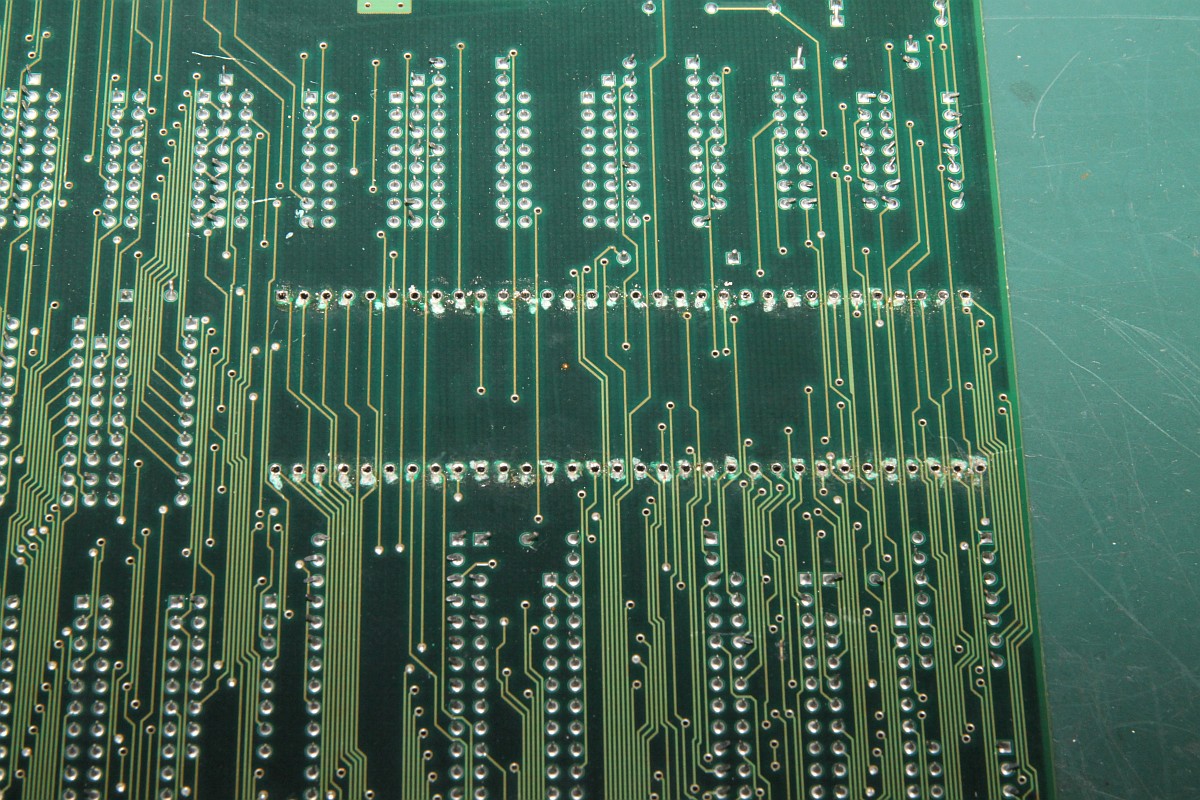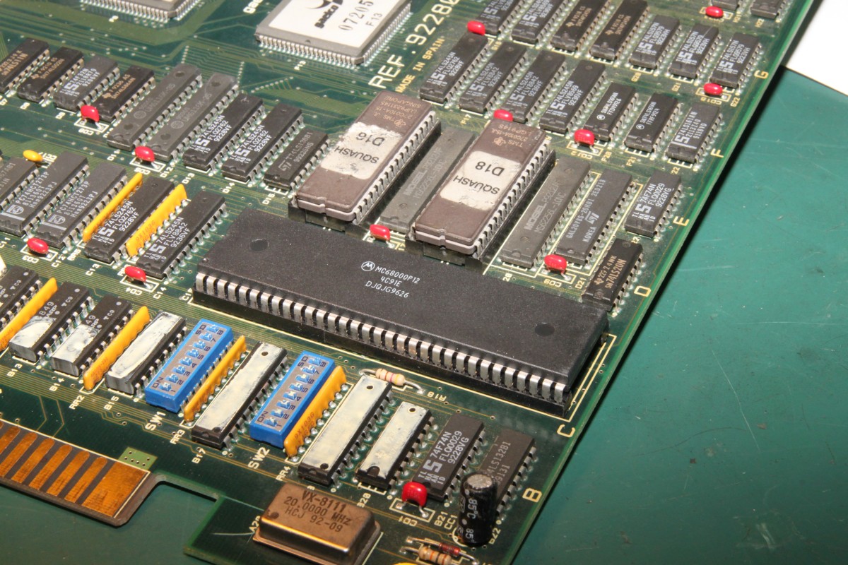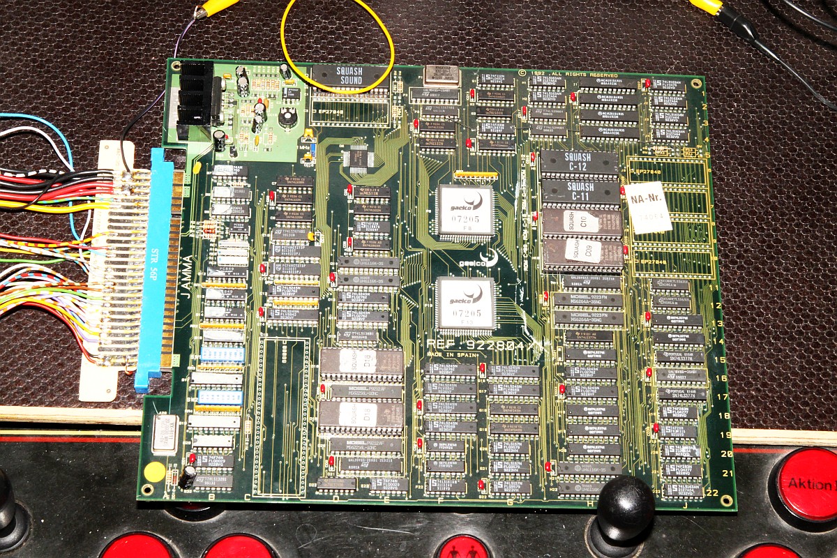 {Gaelco Squash}Manchmal überraschen einen doch noch Aufträge ob ihrer Skurrilität. Diese Gaelco Squash ist so einer. Beim Einschalten egribt sich ein buntes Pixelbild mit wechsenden Störartefakten. Natürlich habe ich gleich mal nachgesehen, was so auf den Datenbussen an den EPROMs passiert - nichts. Woran könnte das liegen? Die Platine sieht eigentlich gut aus... Warum zum Teufel wollen die Prog-ROMs nicht laufen? Da hat wohl einer dringend einen 68000er gebraucht... Wieder ein Stück Elektroschrott als Teilespender... |