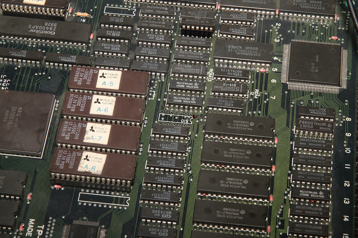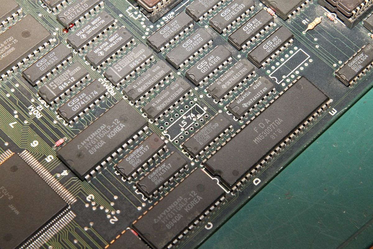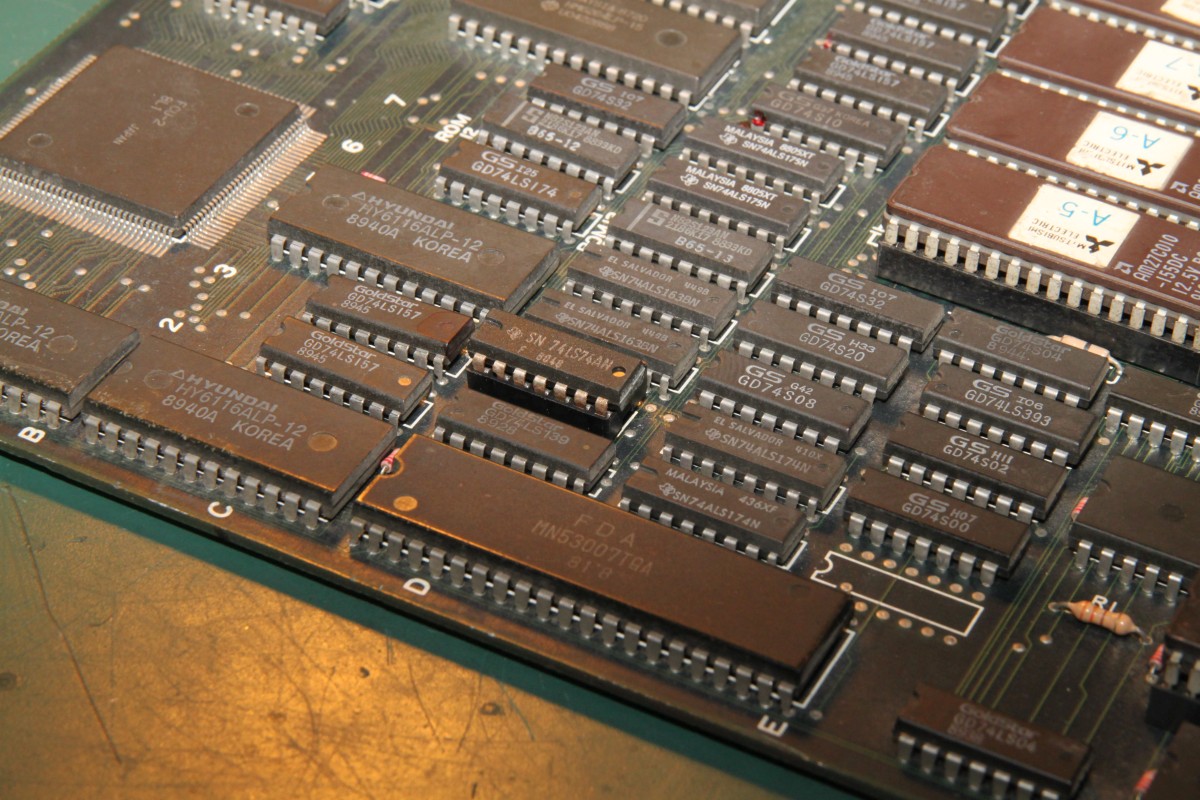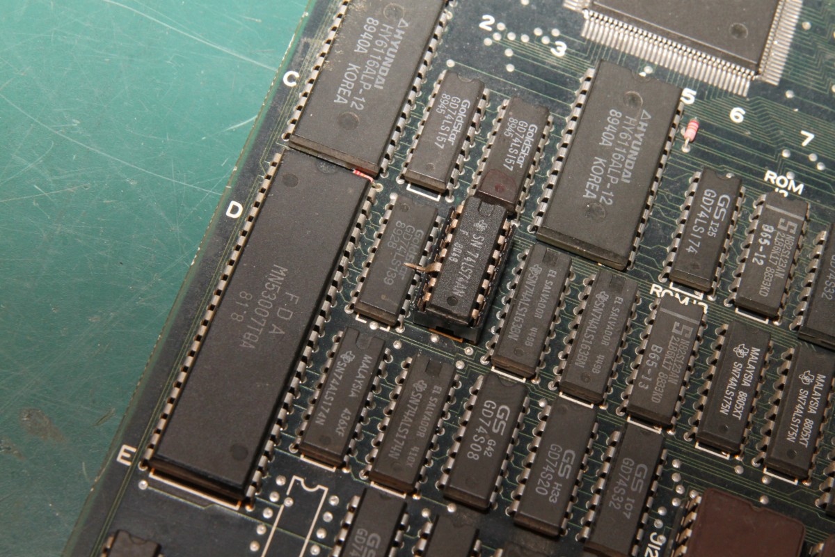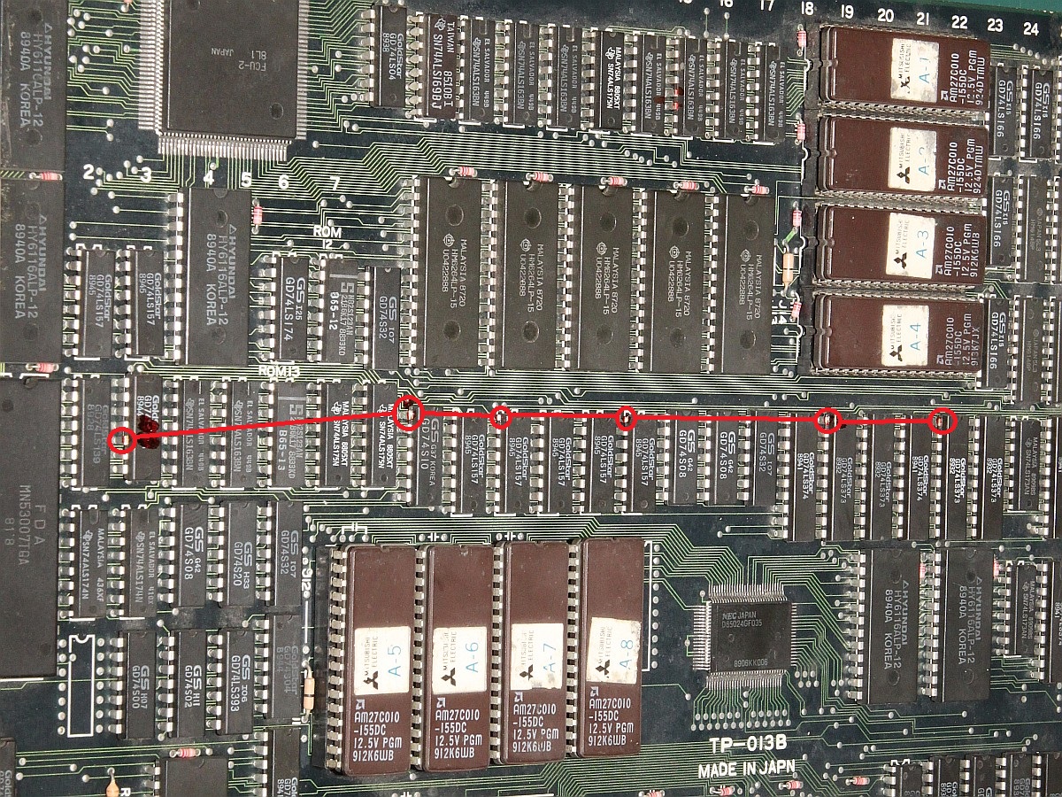 {Truxton Reparatur} Ein neuer Patient, quasi eine Notaufnahme zwischen all den Langzeitkranken... Starke Grafikfehler, nur jede zweite Zeile der Tiles wird dargestellt, Sprites fehlen völlig: Truxton ist mir schon aufgefallen als ein Kandidat, der auf der Unterseite sehr lange Pins aufweist, die - weil eng gebaut - sich gerne in kurzschlüssiger Weise treffen... Hier sieht das auch grenzwertig aus. Hier hilft aber leider kein Geradebiegen, der Fehler geht einfach nicht weg... Was machen mit einer PCB, von der es keinen Schaltplan gibt? Richtig: Baustein für Baustein nach irregulären Signalen durchforsten. Natürlich solte man bei Grafikfehlern damit auch im Grafikbereich anfangen. {Fehlersuche} Nach geraumer Zeit fand ich ein Output Enable Signal an einem der Bustreiber, welches nicht gut aussah... In der Kette führte das zu weiteren "komischen" Signalpegeln... Das Signal zieht sich über die ganze Platinenbreite und bedient ca. 6-7 Bausteine. Endlich fand ich die Quelle: ein 74LS74 Flipflop mit schlechten Augsgängen: {Reparatur 1} Raus damit und neu rein: Mist aber auch: das Ausgangssignal des neuen Bausteins ist genau so schlecht... einer der 6-7 Bausteine muss folglich über seinen Eingang (!) das Signal verhunzen... Das sieht man schnell, wenn man das Ausgangsbeinchen freistellt: {Reparatur 2} Gewissensfrage: welchen der 6-7 TTLs soll ich als erstes auslöten, um den Fehler zu finden? Ich entscheide mich aus dem Bauch heraus für den 74S10, weil er als S-Typ höher belastet ist, als die übrigen LS-Typen: Ohne den Baustein ist das Taktsignal endlich stabil - die Tiles sind endlich komplett, Sprites fehlen aber noch völlig - na ja, irgendeinen Sinn muss der Baustein ja haben... Ich habe keinen 74S10, aber zumindest einen 74LS10... einen Versuch ist es wert, könnte schlimmstenfalls einfach zu langsam sein... Alles gut: alle Sprites sind da - mein Lieblingsspiel ist vollständig genesen! Nur für die, die es interessiert: hier ist mal die Kette der betroffenen Bausteine markiert: Klar, dass bei einem einzigen defekten Signal eine ganze Menge nicht mehr geht... Noch ein Hinweis zu Truxton: diese PCB ist nach den Regeln der EMV Störfestigkeit sehr gut aufgebaut! Die PCB ist Multilayer, in den inneren Lagen befinden sich Masse und +5V - perfektes Spiel, perfektes Design. Großflächige Innenlagen bedeuten aber auch großflächige Wärmeverteilung beim Löten und Entlöten. Man darf sich hier nicht einbilden, ICs mit dem Lötsauger aus der Platte zu bekommen, es hilft nur der Heißluftfön! Alles Andere führt meist zu Tränen. |