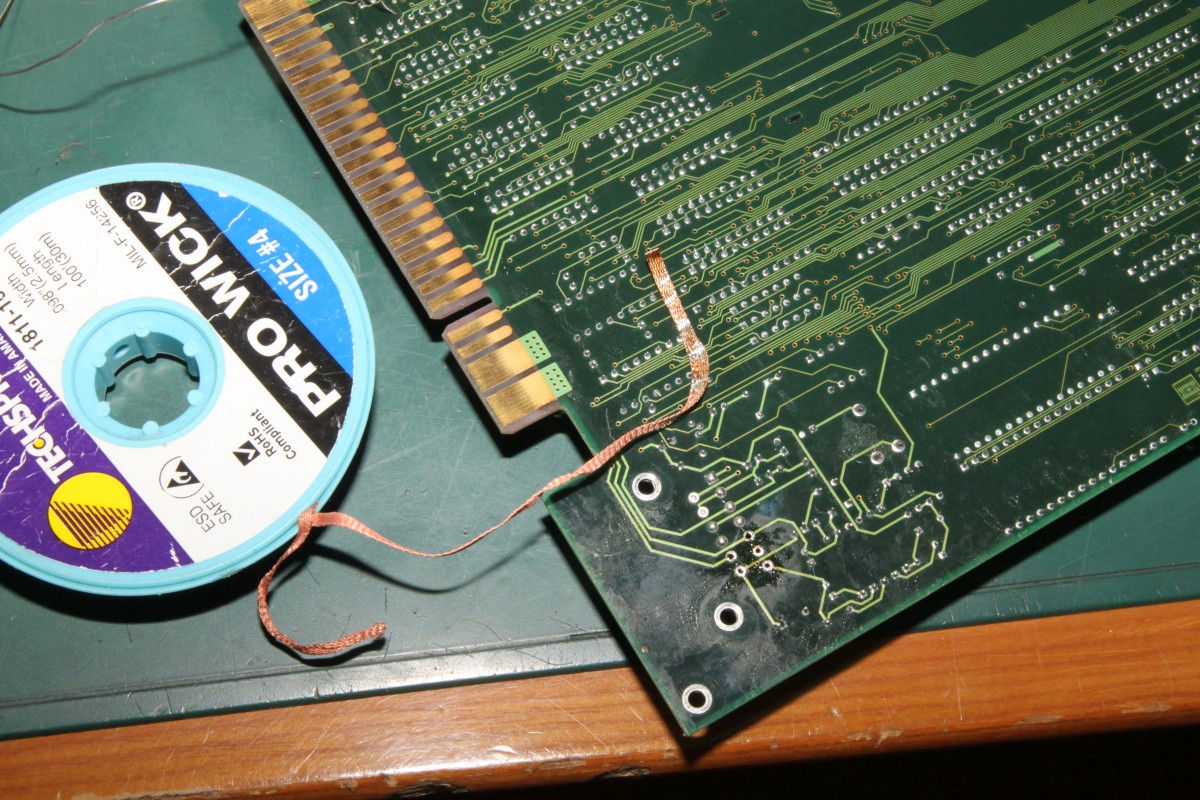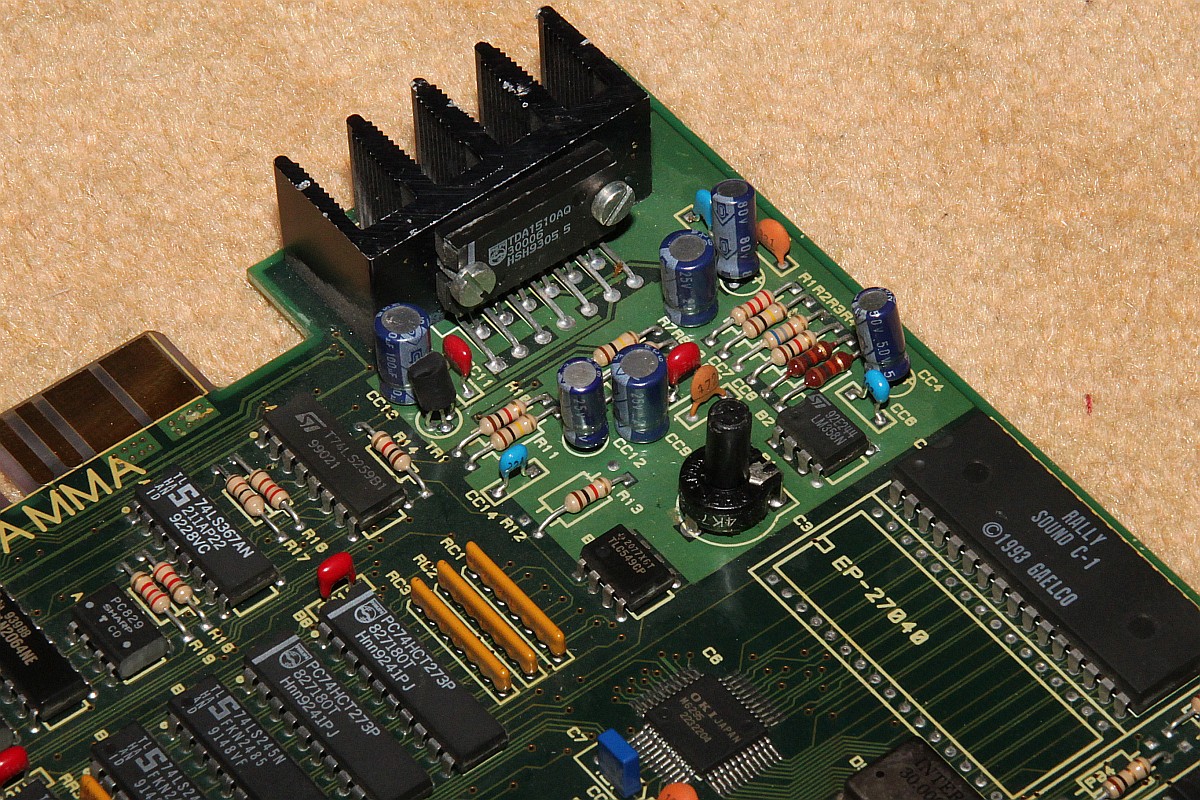 {Gaelco World Rally} Ein kleiner Snack zwischendurch: World Rally ohne Ton. Ein interessantes Verhalten: den ersten Münzeinwurf hört man noch ganz kurz, dann ist Stille und der AMP wird in aller Seelenruhe heiß... Bei der Gaelco World Rally frage ich mich immer: ist diese Platine zu reppen nicht irgendwie wie eine Zeitbombe neu zu lackieren? Immerhin tickt in diesem Teil die Decryption-Knopfzelle - und die ist nicht so ohne Weiteres wechselbar... Alternative: fix verkaufen, solange das Spiel noch geht... Die Sound-Ecke... Ein praktisches Utensil: der Audio-Verfolger. Gab es mal billig bei Pollin, mittlerweile leider aus dem Programm verschwunden. Unverstärkte Audio-Signale sind mit einem Oszi hoher Bandbreite nahezu nicht zu sehen. Man kann sie quasi nicht vom Rauschen unterscheiden! Ein kleiner Verstärker mit Lautsprecher kann hier gute Dienste leisten, wenn man wissen will, bis wohin das Audio-Signal noch funktioniert. Gag am Rande: der Verstärker auf dem Board funktioniert, wenn man den Audio-Verfolger an den Eingang hält. Dann wird der Masseversatz so hoch, dass der "einbeinige" Brückenverstärker wenigstens halb tut... Noch mal für die, die sich immer noch wundern, warum manche ihrer PCBs am JAMMA-Kabelbaum akustisch abrauchen. Es gibt Audio-Verstärker, die erwarten eine Lautsprecherlast gegen Masse. Ein Pin Lautsprecher, der andere: 0V. Alles gut. {Reparatur} Weiter geht's... Wenn der Postmann klingelt: Erst den Kühlkörper abschrauben - lange Schrauben für den IC, kurze Schrauben für die Platinenbefestigung! Heißluft - zu faul heute... Gute Entlötlitze - gute Ergebnisse: Alles sauber. Erst den AMP auf den Kühlkörper schrauben, dann den Kühlkörper mit AMP auf die Platine und dann erst löten! Abzwicken, einschalten, geht! |