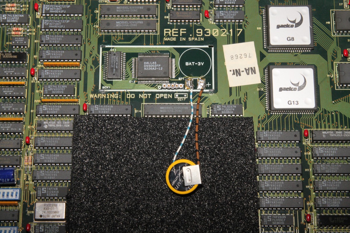 {World Rally Batterietausch} Eigentlich wollte ich das Teil wegpacken - dann überfiel mich hemmungsloses Verantwortungsbewusstsein: was, wenn die Backup-Batterie schlapp macht... wäre doch schade. Also sofort den Deckel abgesprengt, den man nie nicht öffnen soll... Darunter: ein Dallas Microcontroller, ein SRAM mit Decryption-Tabelle und eine Lithium-Zelle. Das Datenblatt des SRAM zeigt, dass dieses speziell für Batteriebetrieb ausgelegt ist. Mein Multimeter sagt mir, dass die Zellenspannung auf 3,1V abgesunken ist - eine frische Lithiumzelle hat 3,3V... Es wird Zeit!!! Das SRAM darf nicht stromlos werden, ein Puffer-Elko wie bei CPS2 fehlt hier. Dafür wird das SRAM bei angeschlossener PCB mit 5V versorgt - Sicherheitshalber sorge ich für eine Notstromversorgung, man weiss ja nie... Gute Vorbereitung und eine ruhige Hand beim Löten ist hier wichtig. Man muss vor Allem beim Auslöten der Originalbatterie darauf achten, dass die Überbrückungsbatterie nicht mit ausgelötet wird! Notstrom angeschlossen: Schlappe Zelle entfernt: Neue Zelle dran: Notstromversorgung abgeklemmt: Ein Tropfen Heißkleber fixiert das Ganze: Eigentlich kann ja wenig schief gehen, wenn man die PCB angeschlossen hat, das SRAM bekommt ja immer Saft, aber spannend ist es doch. Aber wenn der CoPro O.K. ist, dann ist alles gut, auch wenn das Foto zufällig einen Grafik-Glitch eingefangen hat... Und den Deckel als Berührschutz habe ich auch gleich noch mit Heißkleber fixiert, nicht, dass noch was kaputt geht. Es passt nicht mehr alles drunter, dafür lebt das Spiel wieder Jahre länger! |