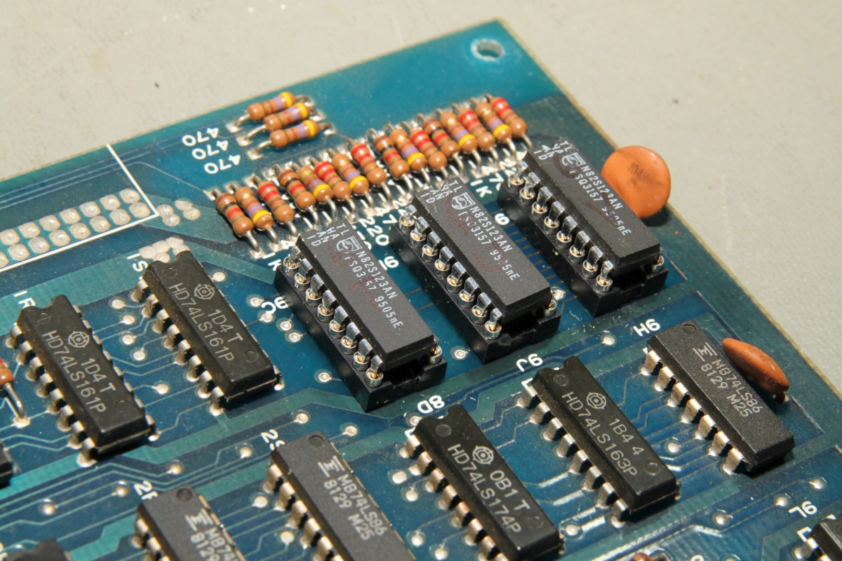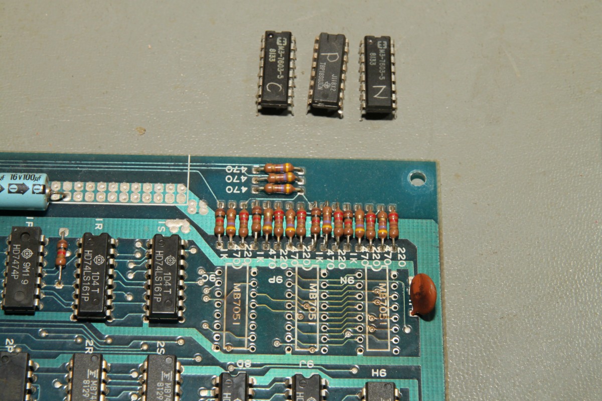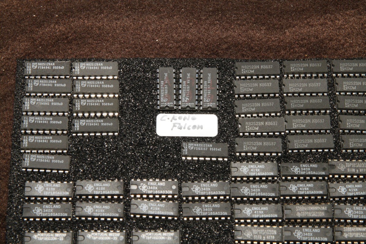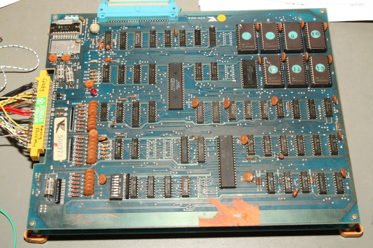 {Crazy Kong Falcon Bootleg} Crazy Kong - eine Geschichte voller Mißverständnisse... Hier ein weiterer Insasse der Schrottbox: Klinisch tot - immerhin geht die Video-Sektion und es sind alle Quarze drauf... man gibt sich ja mit so wenig zufrieden... Der Z80 ist völlig platt - sporadische Ausgangspegel von 1,5V machen keinen Speicher froh. Nach dem CPU-Tausch taktet wieder fast alles... bis auf ein Datenbit... Mit einem funktionierenden Bustreiber geht auch das... Spiel und Ton laufen - nur die Farben sind echt übel. Die Ausgangspegel der Color-PROMs sind schlecht. Gut, dass ich von einer vorherigen Reparatur mal fälschlich CK-PROMs gebrannt hatte (da hatte ich CK Pt. 2 gebraucht)... also fix gesockelt und getauscht: Und - Die Farben sind unverändert grauenvoll... ein kurzer Blick bei MAME und Youtube klärt mich auf: das muss so Scheiße sein. Na, wenigstens kann man jetzt in Zukunft defekte Color-PROMs ganz einfach tauschen... |