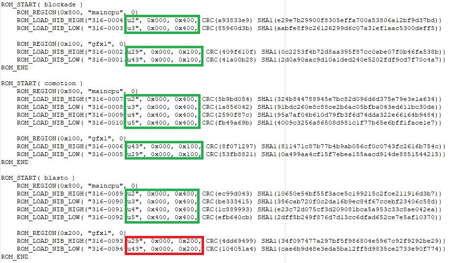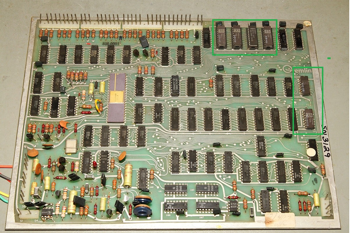 {Gremlin Comotion Conversion} CPS und MVS oder Namco System 1 konvertieren kann ja jeder! Aber geht das auch mit der Steinzeit der Arcade-Technik? Bei Gremlin werkelt ein 8080 Prozessor und Programm wie Grafik sind in bipolare PROMs gebrannt. Die Platinen sind über die Serie gleich, einen Kopierschutz gab es noch nicht. Nicht, dass es sinnvoll wäre, aber aus reiner Neugier wollte ich mal ausprobieren, ob sich auch so ein Dinosaurier konvertieren lässt. Die Character-PROMs müssen nachträglich gesockelt werden, die sind eingelötet... Alles getauscht: Und ein weiteres spannendes Spiel aus der Gremlin 8080er-Reihe: Blockade! Das Spiel "Hustle" oder "Blasto" wäre auch hübsch, das verwendet aber als Grafik-PROMs 82S131 (512x4)... diese Teile habe nicht mal ich auf Lager. Hier noch mal die Position der vier Programm-PROMs und der zwei GFX-PROMs: Ha! Weil ich es kann! ;-) |