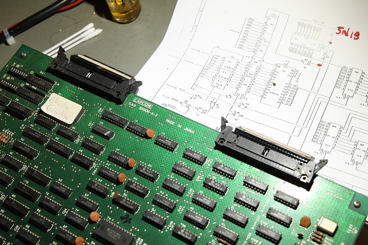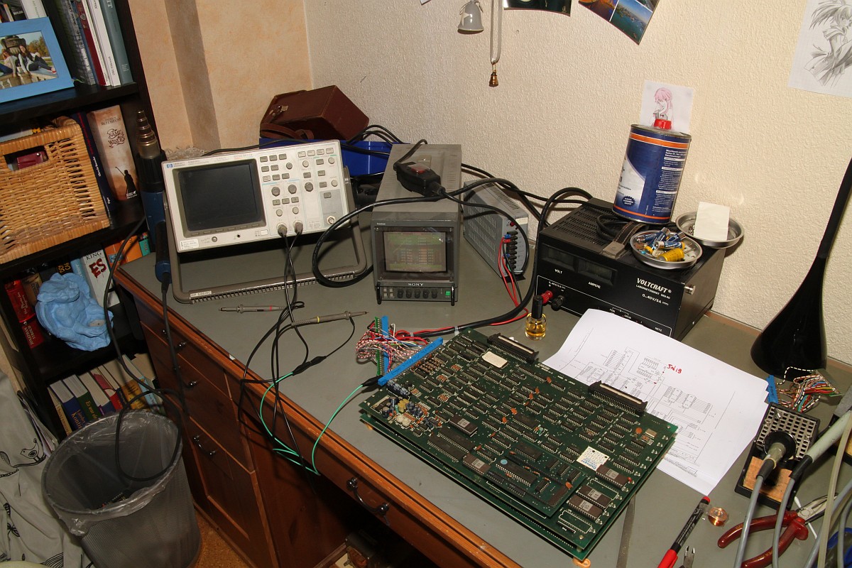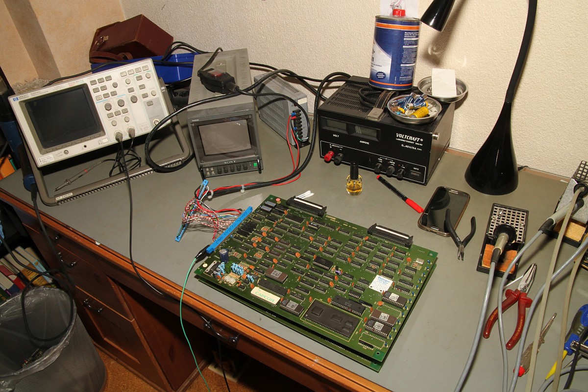 {Ghost 'n Goblins Original} So kann es kommen, wenn man ungezielt versucht, zu "reparieren": bei fast allen getauschten ICs sind die inneren Durchkontaktierungen gerissen, es ist mir persönlich unbegreiflich, wie das passieren kann, zumal man weder an den oberen, noch bei den unteren Pads irgendwelche Beschädigungen erkennen kann! Die G'n'G-Originalplatine ist speziell: Top- und Bottom-Layer sind durchgängige Spannungsversorgungsflächen, alle Leiterbahnen befinden sich in den inneren zwei Layern, unsichtbar und vor allem: man kommt nicht ran! Gut, dass es einen Schaltplan gibt, der zumindest zu 95% stimmt. Noch besser, wenn man eine Originalplatine zum Vergleich besitzt. Der Kunde hat zumindest versucht, seine Reparatur zu reparieren - leider mit begrenztem Erfolg. Solche Adressbusse braucht niemand, da fehlt wohl noch die eine oder andere Strippe: Wenigstens der Takt liegt an der CPU: Da kann ich doch gleich mal meine eigene G'n'G testen - sie hat anstelle des vergossenen Soundhybriden eine offene Adapterplatine, war sicher ein Glück für die Bootlegger... Läuft eine G'n'G nur mit dem CPU-Board? Eine Frage, die sich schon viele gestellt haben... einfach testen: In diesem Zusammenhang teste ich gleich mal, ob die Kunden-Sprite-PCB tut - sie läuft, also ist nur die CPU-PCB hin: Ich wurschtle mich durch fehlende Daten- und Adressbus-Verbindungen durch, manchmal fehlen auch Chip-Selcts... das gibt besonders lustige Signalformen: Nachdem ich eine fehlende Verbindung für ein Video-RAM-Enable gezogen habe, gibt es endlich sogar ein Bild. Statisch. Nachdem ich dann noch die defekte 68B09 getauscht hatte, ging grafisch die Post ab: O.K., das ist etwas zu viel Grafikoutput... Also nochmal genau die CPU-Signale checken... NMI ist Dauer-Low... dauernd Interrupt? das kann nicht gut gehen. Das Flip-Flop ist fritte... Hier läuft die Huckepacklösung wieder mal: Schon beruhigt sich die Grafik - die CPU läuft, mit ziemlichen Grafikfehlern, aber immerhin mal ganz grundsätzlich richtig... Wird sicher fortgesetzt... |