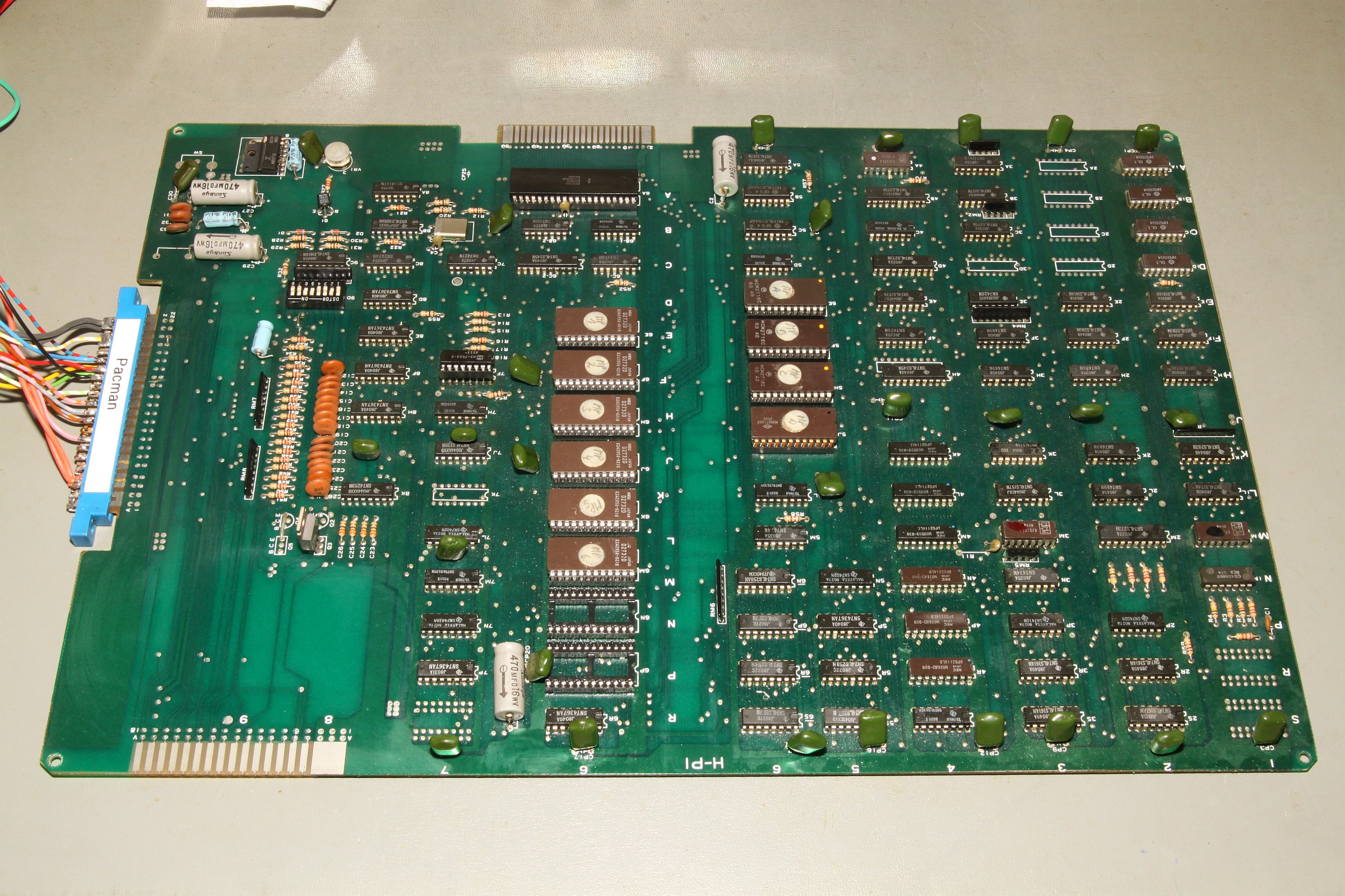 {Ms. Pacman} Patient mit leichten Grafikfehlern, Streifen in Vertikalrichtung, teilweise abhängig von Spritepositionen, Farbfehler bei Sprites, temperaturabhängig, berührungsempfindlich... Hier die PCB: