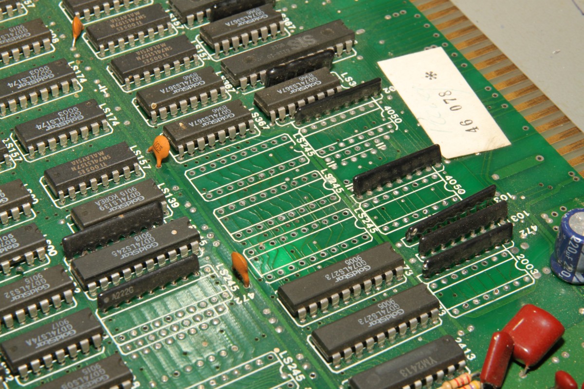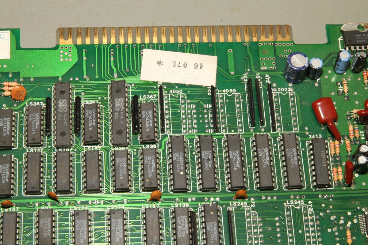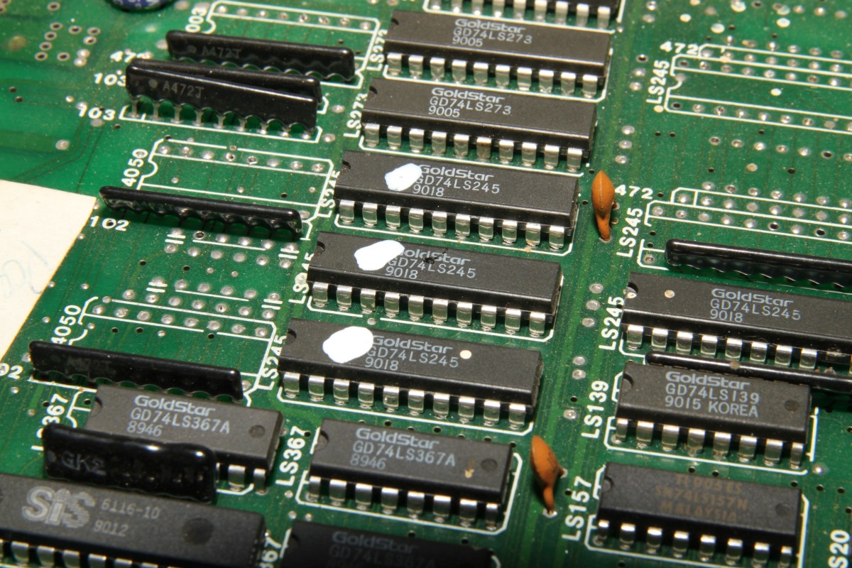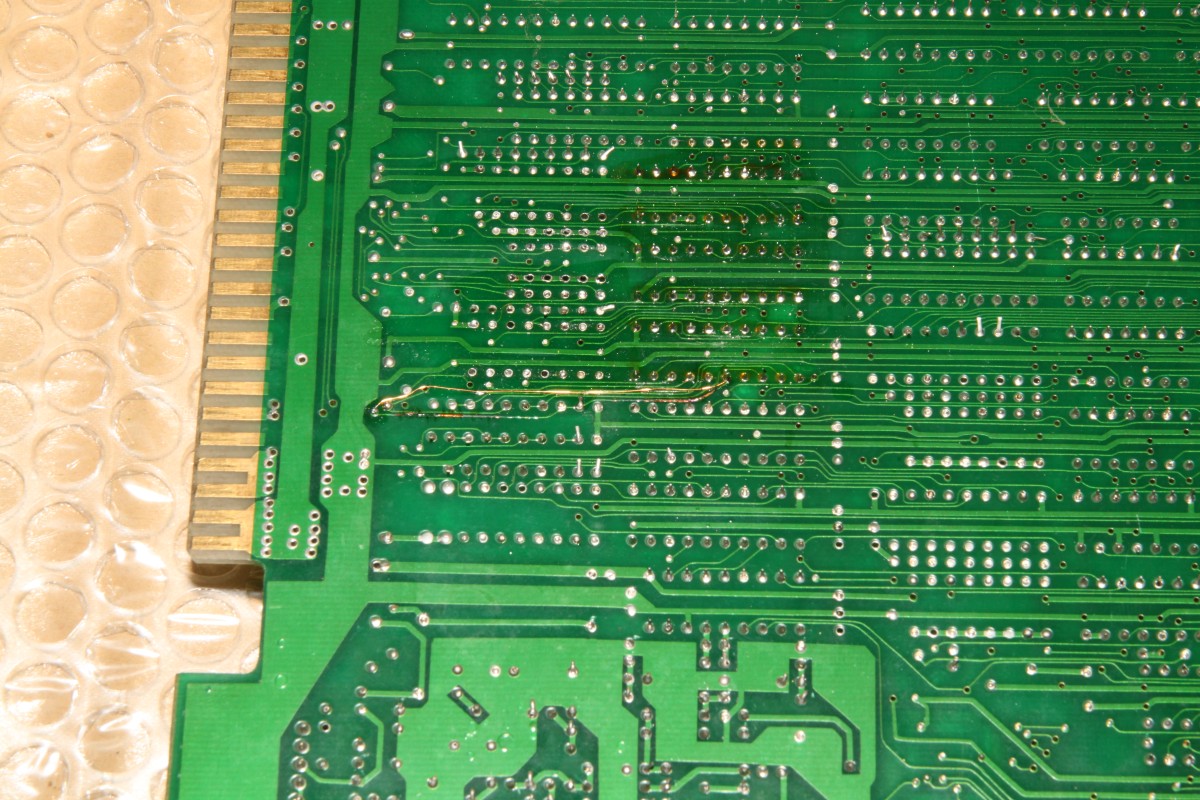 {Pang Bootleg} Zur Entspannung ein Pang Bootleg. Gleich beim Starten erscheint ein Credit und es reagiert nicht weiter. Die Eingangsbuffer sehen nicht gut aus, außerdem werden sie sackheiß... Unten drunter sieht es noch schlechter aus... wohl mal den JAMMA-Stecker verkehrt herum draufgesteckt... Die drei müssen raus: Nebenbei - auf dem Bootleg haben selbst die Bootlegger noch ganz schön rumgepfuscht - quick + dirty... Raus mit den Leichen: Houston - wir haben ein Bild. Ein schlechtes... Über den Testmodus - die Controls gehen jetzt ja wieder - kann man die Grafik anzeigen lassen. Das schafft stabile Verhältnisse zum Messen: Das RAM hier hat einen ganz schlappen Datenbus. Völlig abgerundete Flanken. Raus damit und ein Neues rein: Geht doch. Die Grafik ist nicht ganz 100%ig, ich schiebe das mal auf's Bootleg. Hier die geflickte Unterseite: Und die PCB in ihrer ganzen Bootleg-Pracht: |
