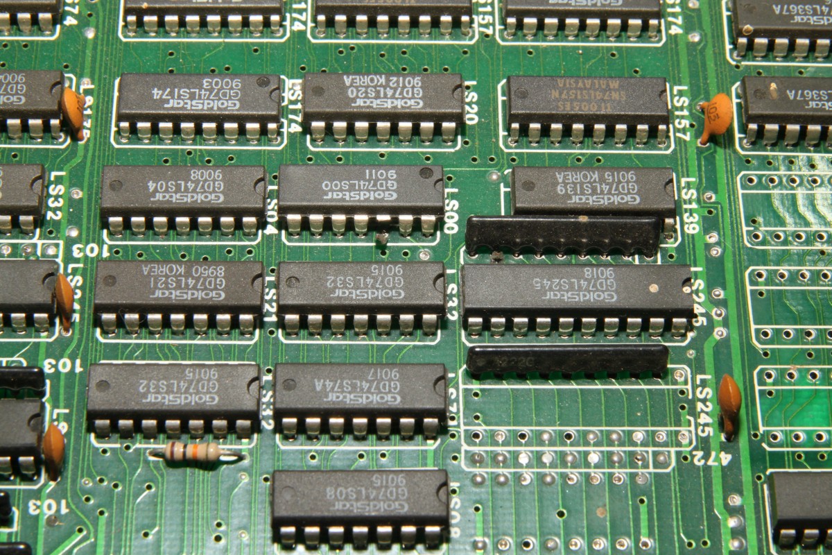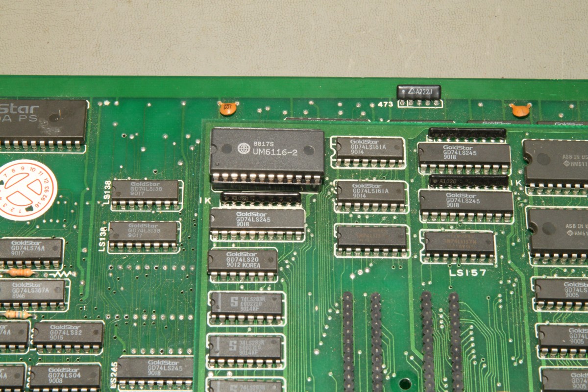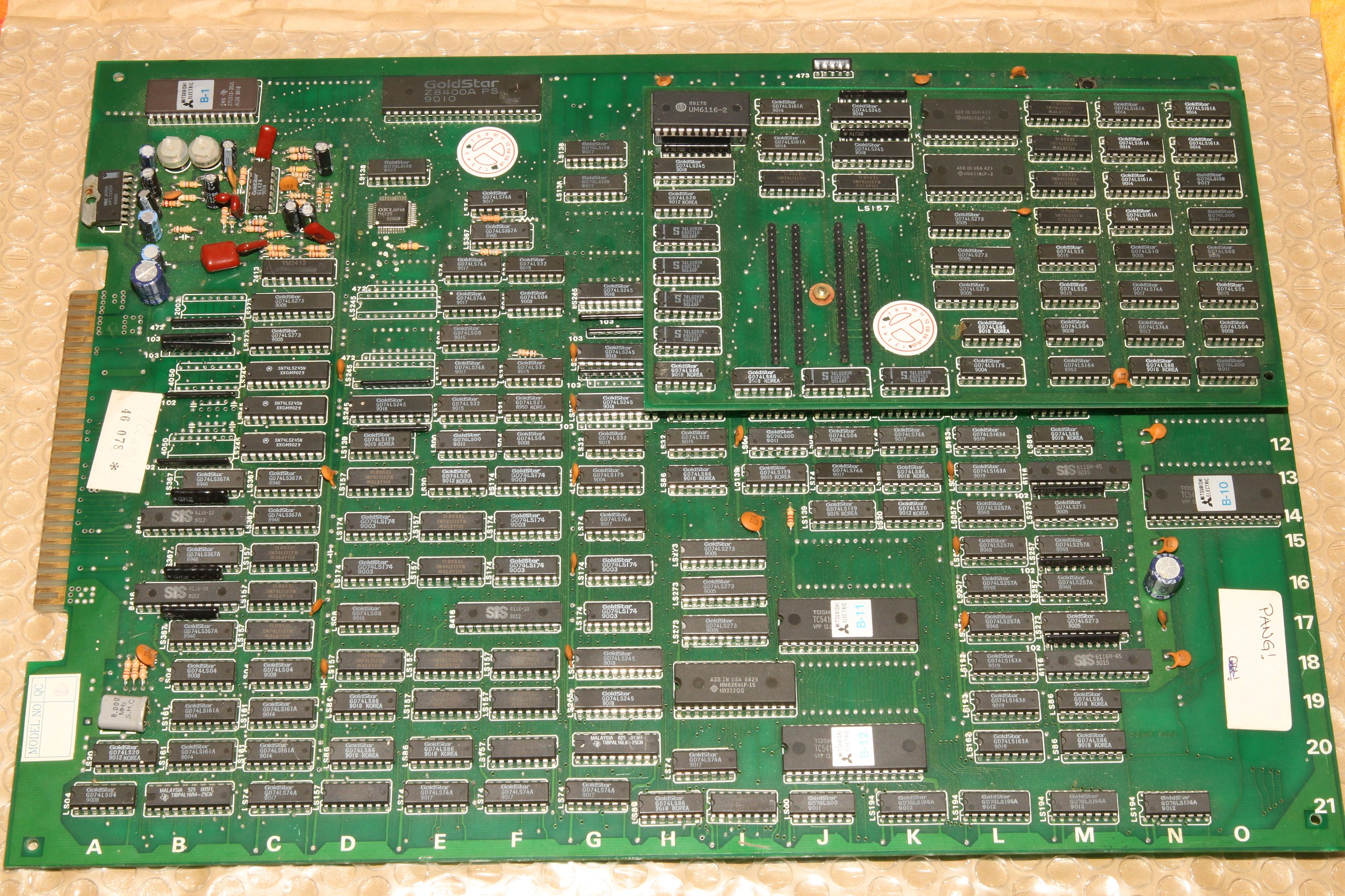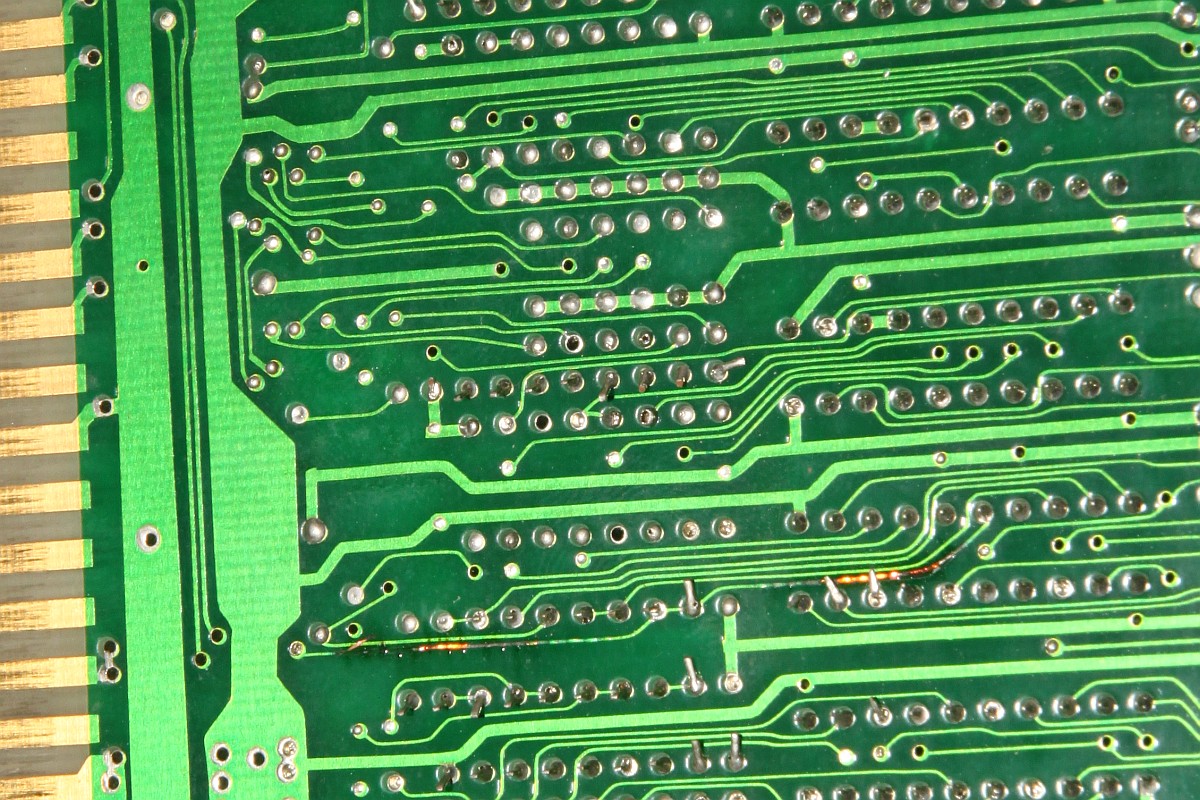 {Pang Bootleg} Zur Entspannung ein Pang Bootleg. Gleich beim Starten erscheint ein Credit und es reagiert nicht weiter. Die Eingangsbuffer sehen nicht gut aus, außerdem werden sie sackheiß... Unten drunter sieht es noch schlechter aus... wohl mal den JAMMA-Stecker verkehrt herum draufgesteckt... Die drei müssen raus: Nebenbei - auf dem Bootleg haben selbst die Bootlegger noch ganz schön rumgepfuscht - quick + dirty... Raus mit den Leichen: Houston - wir haben ein Bild. Ein schlechtes... Über den Testmodus - die Controls gehen jetzt ja wieder - kann man die Grafik anzeigen lassen. Das schafft stabile Verhältnisse zum Messen: Das RAM hier hat einen ganz schlappen Datenbus. Völlig abgerundete Flanken. Raus damit und ein Neues rein: Geht doch. Die Grafik ist nicht ganz 100%ig, ich schiebe das mal auf's Bootleg. Hier die geflickte Unterseite: Und die PCB in ihrer ganzen Bootleg-Pracht: |
