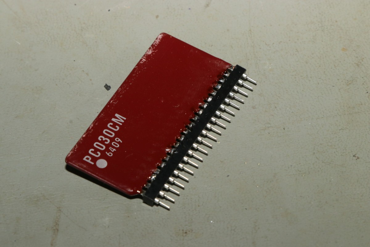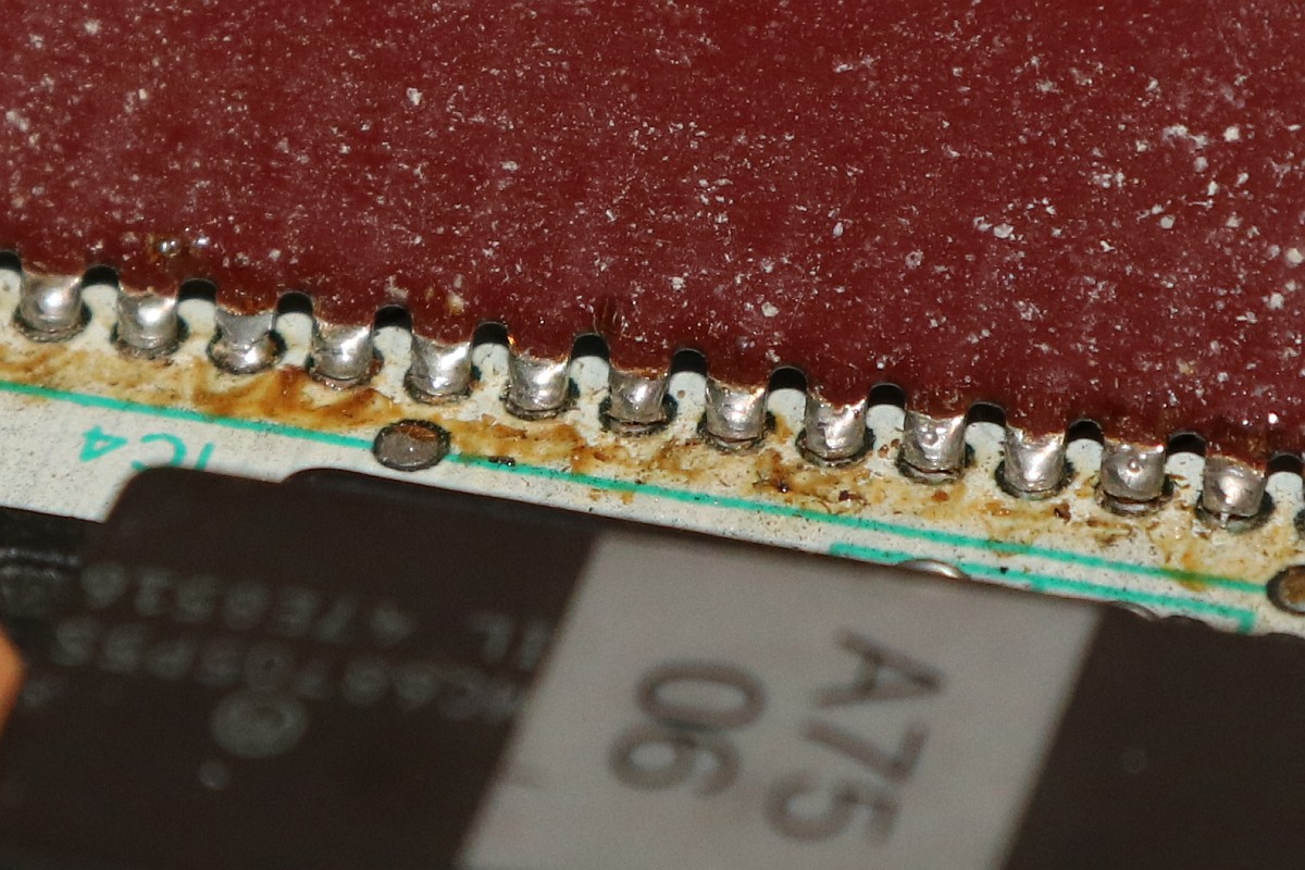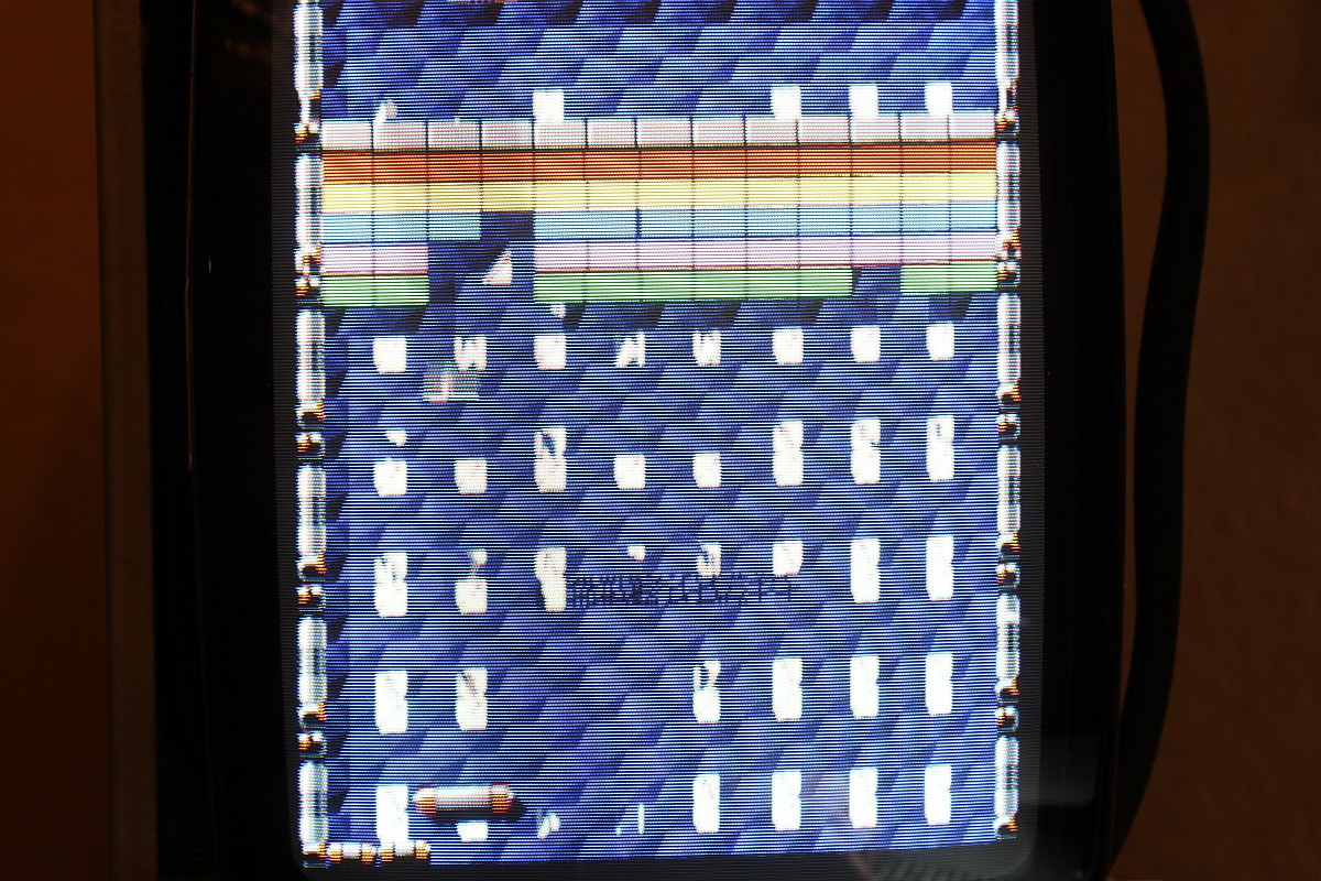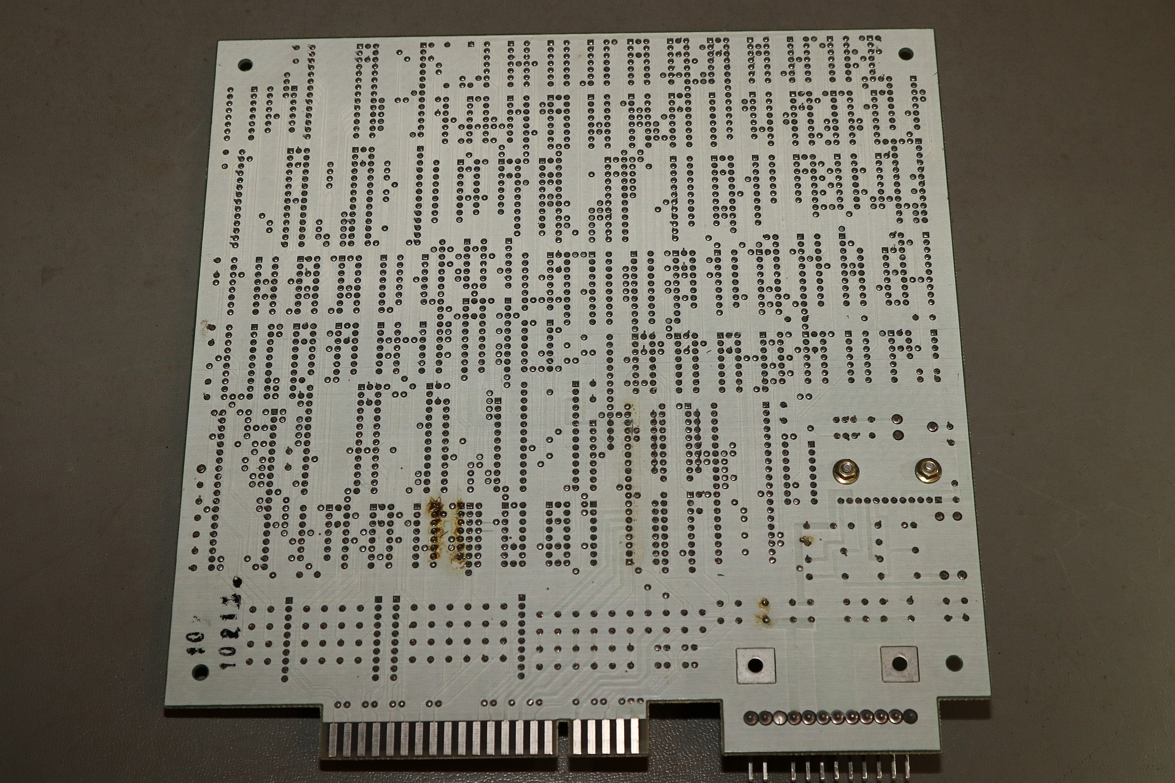 {Arkanoid im Original} vielen nicht bekannt: die Originale Taito Arkanoid-Platine ist eine Schönheit in Weiß! Was die Konstruktion nicht besser macht... Hier erst mal ein Blick auf eines der weithin bekannten Bootlegs: Das hier ist das seltenere Original, leider funktionsuntüchtig und nicht leicht zu reparieren... Die PCB-Bilder sind hoch auflösend und werden auf Klick ganz groß! Der Bildschirm begrüßt mich mit einem bekannten Fehler - ausgelöst mit großer Wahrscheinlichkeit von einer Teilnahmeverweigerung des bekannten Taito-Custom-Hybrid-Chips PC030CM. Der ist in so einigen Taito-Spielen verbaut, liest die Coin-Switches und steuert die Coin-Counter und Lockouts. Mittlerweile gibt es dazu sogar einen recht kostenintensiven Nachbau... ist nicht viel drin, aber dazu später! Nach Herumdrücken mit dem Tastkopf auf dem PC030CM lässt sich das Spiel sogar zum Starten bewegen, das Drama nimmt seinen Lauf! Das sieht jetzt grafisch mal gar nicht so gut aus... manche Sprites sind schlichtweg falsch. Gut, dass das Verhalten stark berührungsempfindlich ist. Da lässt sich der Fehler schnell eingrenzen: Adressbus A12 an den Sprite-GFX-EPROMs ist fritte... Da ist er... wer zum Teufel setzt 74LS298 ein - die hatte ich in meinem ganzen Arcade-Leben noch nie gebraucht, hab ich natürlich nicht da. Ein Blick in die Elektrobucht sagt mir, dass die Teile so teuer wie selten sind. Aber eine geduldige Suche führt mich zu 74298 ohne LS... die gibt es zeitweilig günstiger. Hier mal der entscheidende Schaltplanteil: Ich bin ein Magier - ich kann das Bild durch Fingeranlegen scheißig machen... ;-) Solange die TTLs noch nicht da sind, kann ich mich ja mal mit dem Hybridbaustein beschäftigen. Eigentlich macht der oft Probleme, weil er durch Biegung am Keramiksubstrat bricht... Der hier sieht eigentlich gut aus - zumindest bis zu den Pins. ...die sich mit der Platine teilweise nicht wirklich verbunden fühlen... Das Teil muss sauber raus! Von wegen Pins, der hat ja keine mehr... Das muss sauber gemacht werden, sonst sieht man nichts... Von unten sieht die Platine gut aus... Von oben fallen zu Allererst die schwarzen Ringe um die Vias auf, da fehlt wohl Kupfer... Jetzt merkt man, wie blöd es ist, eine Platine vollflächig weiß zu lackieren, man erkennt nicht, wo die Leiterbahnen langgehen. Der Glasfaserstift ist hier mein bester Freund: Also: die mechanische Belastung auf den Hybridbaustein hat vermutlich die oberen Lötaugen abgerissen und dabei die haarfeinen Leiterbahnen abgetrennt, da hift auch Lötgeschmodder nichts, da muss ich chirurgisch ran. Das ist hier mal der Blick durch das Mikroskop: Vias vorhanden, Restrings sind weg. Das wird was Längeres, bei dem viel Geduld und Fingerspitzengefühl gefragt ist - es geht ganz sicher weiter mit dieser Geschichte! {Reparatur} ...und so schnell... die TTLs sind da - danke, Kessler! Alt raus... ...und den neuen rein - ohne LS funktioniert das hier auch, die Teile sind etwas schneller und verbrauchen dafür etwas mehr Strom. Das spielt hier absolut keine Rolle! Der PC030CM erhält eine Luxus-Gehhilfe: ein 40poliger DIL-Sockel musste dafür sein Leben geben... Die Platine bekommt die zweite Hälfte, ich mag es lieber demontierbar, man weiß ja nie, ob der Hybride ganz in Ordnung ist! Die abgerissenen Leiterbahnen kann man prima auf der Unterseite flicken, das sieht sauber aus und hält vor Allem auch mechanisch! Lötbrücken auf der Oberseite wären sicher wieder demnächst abgerissen. Der Patient wird eingesteckt und die Platine bestromt... Tschacka - alles wieder gut... Coinup und Controls laufen auch einwandfrei! |