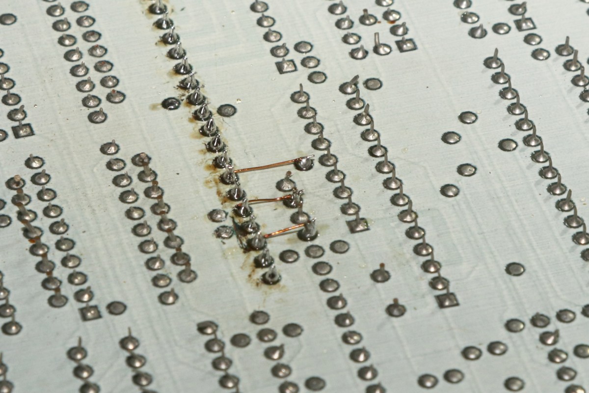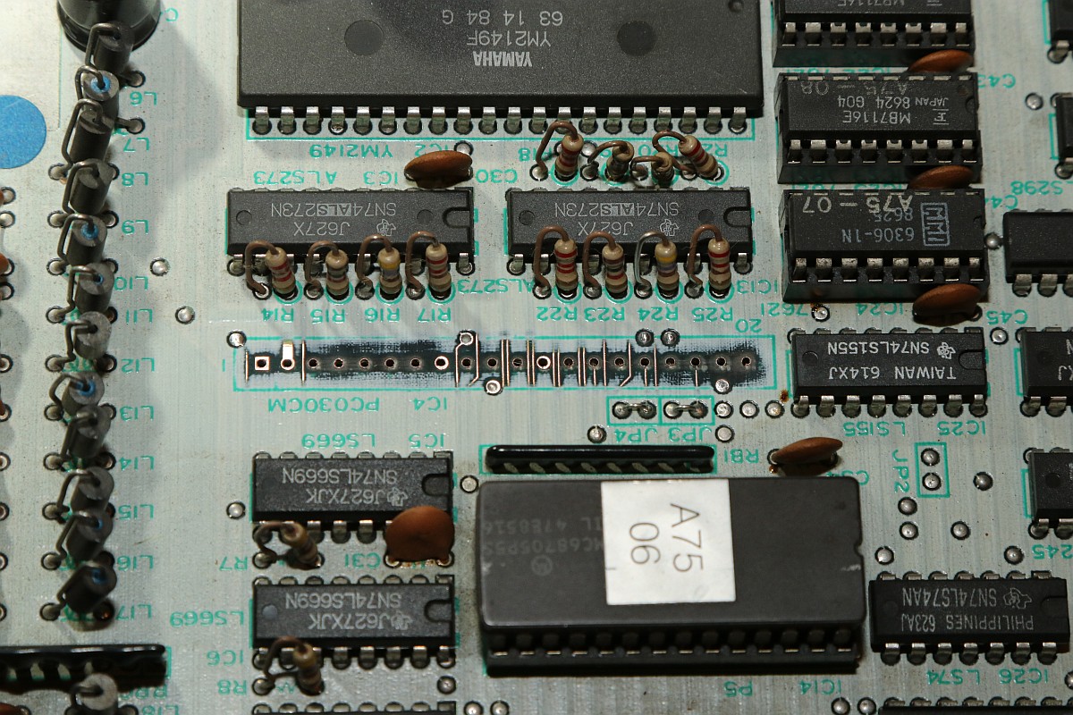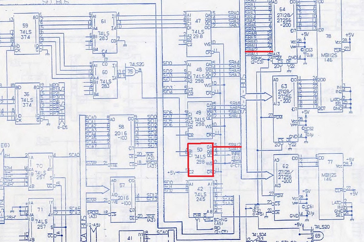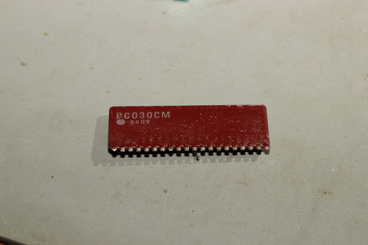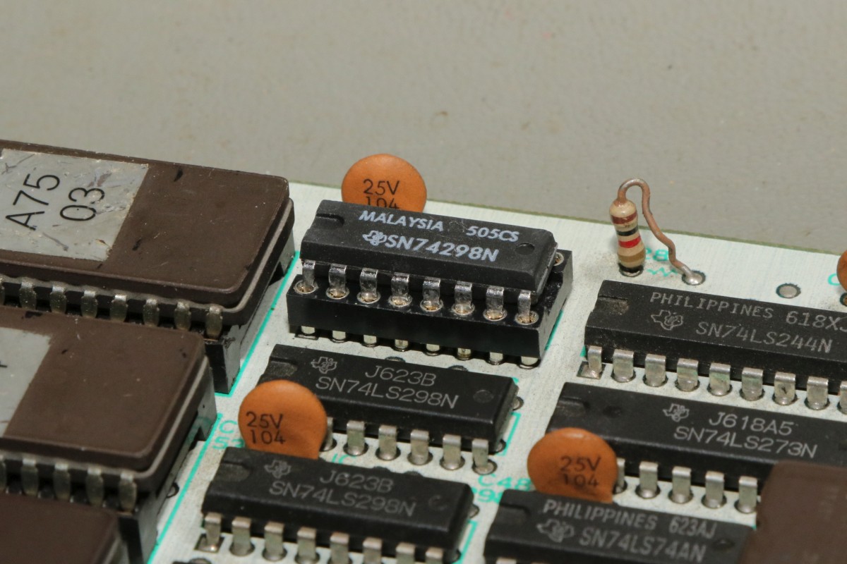 {Arkanoid im Original} vielen nicht bekannt: die Originale Taito Arkanoid-Platine ist eine Schönheit in Weiß! Was die Konstruktion nicht besser macht... Hier erst mal ein Blick auf eines der weithin bekannten Bootlegs: Das hier ist das seltenere Original, leider funktionsuntüchtig und nicht leicht zu reparieren... Die PCB-Bilder sind hoch auflösend und werden auf Klick ganz groß! Der Bildschirm begrüßt mich mit einem bekannten Fehler - ausgelöst mit großer Wahrscheinlichkeit von einer Teilnahmeverweigerung des bekannten Taito-Custom-Hybrid-Chips PC030CM. Der ist in so einigen Taito-Spielen verbaut, liest die Coin-Switches und steuert die Coin-Counter und Lockouts. Mittlerweile gibt es dazu sogar einen recht kostenintensiven Nachbau... ist nicht viel drin, aber dazu später! Nach Herumdrücken mit dem Tastkopf auf dem PC030CM lässt sich das Spiel sogar zum Starten bewegen, das Drama nimmt seinen Lauf! Das sieht jetzt grafisch mal gar nicht so gut aus... manche Sprites sind schlichtweg falsch. Gut, dass das Verhalten stark berührungsempfindlich ist. Da lässt sich der Fehler schnell eingrenzen: Adressbus A12 an den Sprite-GFX-EPROMs ist fritte... Da ist er... wer zum Teufel setzt 74LS298 ein - die hatte ich in meinem ganzen Arcade-Leben noch nie gebraucht, hab ich natürlich nicht da. Ein Blick in die Elektrobucht sagt mir, dass die Teile so teuer wie selten sind. Aber eine geduldige Suche führt mich zu 74298 ohne LS... die gibt es zeitweilig günstiger. Hier mal der entscheidende Schaltplanteil: Ich bin ein Magier - ich kann das Bild durch Fingeranlegen scheißig machen... ;-) Solange die TTLs noch nicht da sind, kann ich mich ja mal mit dem Hybridbaustein beschäftigen. Eigentlich macht der oft Probleme, weil er durch Biegung am Keramiksubstrat bricht... Der hier sieht eigentlich gut aus - zumindest bis zu den Pins. ...die sich mit der Platine teilweise nicht wirklich verbunden fühlen... Das Teil muss sauber raus! Von wegen Pins, der hat ja keine mehr... Das muss sauber gemacht werden, sonst sieht man nichts... Von unten sieht die Platine gut aus... Von oben fallen zu Allererst die schwarzen Ringe um die Vias auf, da fehlt wohl Kupfer... Jetzt merkt man, wie blöd es ist, eine Platine vollflächig weiß zu lackieren, man erkennt nicht, wo die Leiterbahnen langgehen. Der Glasfaserstift ist hier mein bester Freund: Also: die mechanische Belastung auf den Hybridbaustein hat vermutlich die oberen Lötaugen abgerissen und dabei die haarfeinen Leiterbahnen abgetrennt, da hift auch Lötgeschmodder nichts, da muss ich chirurgisch ran. Das ist hier mal der Blick durch das Mikroskop: Vias vorhanden, Restrings sind weg. Das wird was Längeres, bei dem viel Geduld und Fingerspitzengefühl gefragt ist - es geht ganz sicher weiter mit dieser Geschichte! {Reparatur} ...und so schnell... die TTLs sind da - danke, Kessler! Alt raus... ...und den neuen rein - ohne LS funktioniert das hier auch, die Teile sind etwas schneller und verbrauchen dafür etwas mehr Strom. Das spielt hier absolut keine Rolle! Der PC030CM erhält eine Luxus-Gehhilfe: ein 40poliger DIL-Sockel musste dafür sein Leben geben... Die Platine bekommt die zweite Hälfte, ich mag es lieber demontierbar, man weiß ja nie, ob der Hybride ganz in Ordnung ist! Die abgerissenen Leiterbahnen kann man prima auf der Unterseite flicken, das sieht sauber aus und hält vor Allem auch mechanisch! Lötbrücken auf der Oberseite wären sicher wieder demnächst abgerissen. Der Patient wird eingesteckt und die Platine bestromt... Tschacka - alles wieder gut... Coinup und Controls laufen auch einwandfrei! |