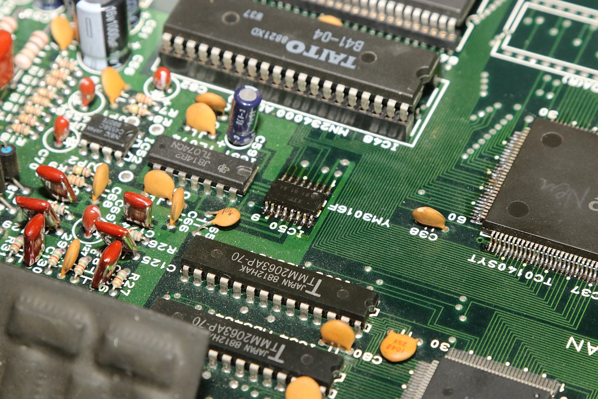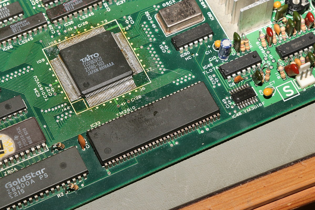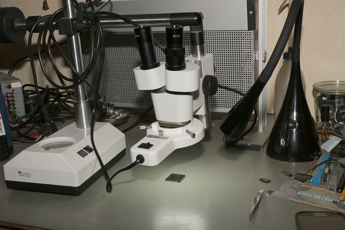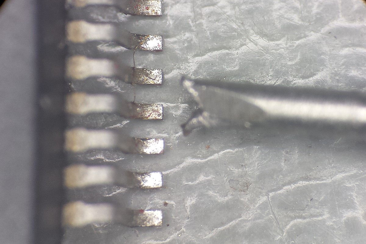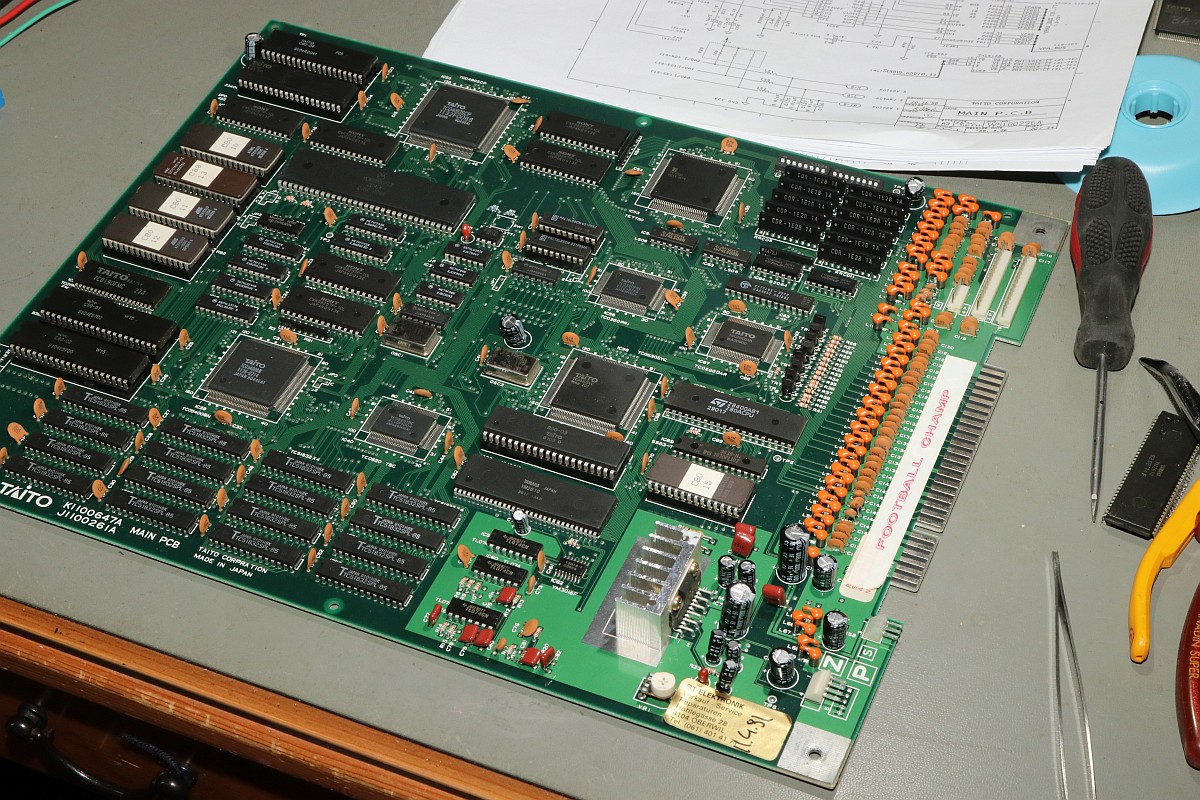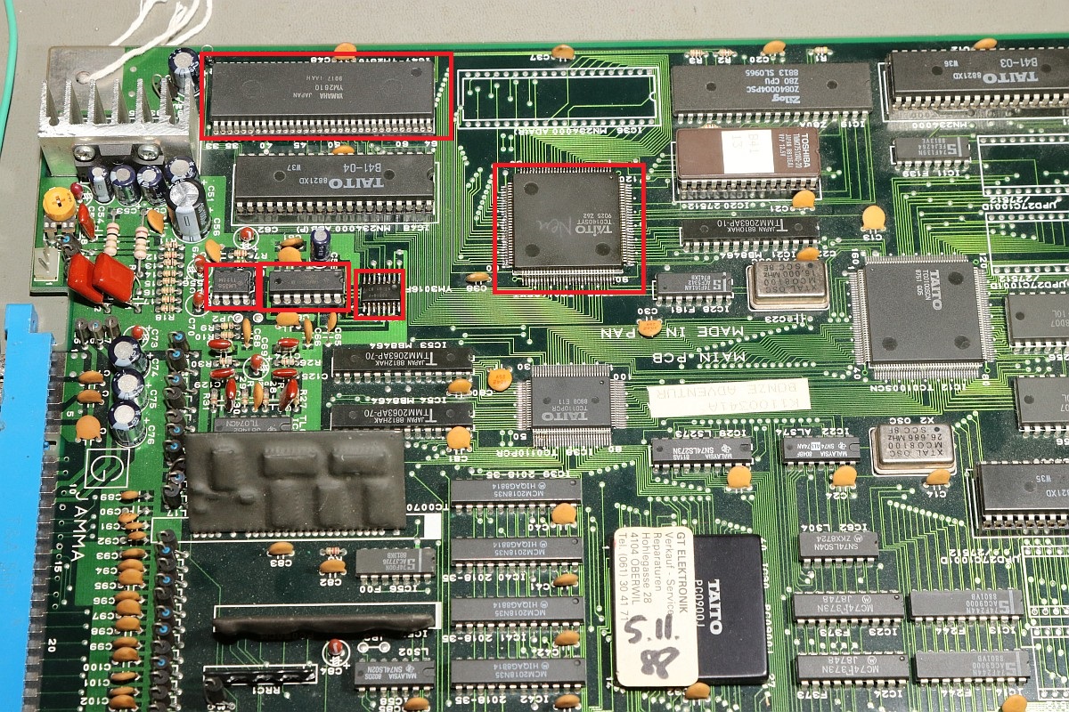 {Bonze Adventure - Tonlos} der Spieletitel klingt irgendwie nach einem reichen unsympatischen Sack... - na ja, ein kleines Dickerchen ist die Hauptperson schon... aber zurück zur Technik: das Spiel ist völlig tonlos und am Verstärker liegt es leider nicht... Wie bei vielen Spielen dieses Herstellers begeistert die Sound-Sektion durch den Einsatz eines gerne defekten Daten-/Adress-Multiplexer-Customs mit dem Namen TC0140SYT und einem nachfolgenden Soundchip YM2610... Der Custom ist am Ausgang tot. Wir benötigen einen Organspender: Der hat schon herhalten müssen - armes Kerlchen... Aber das benötigte Organ ist noch vorhanden: Vorsichtig rausoperiert... Unsägliche Lötversuche am Spender haben ihre Spuren hinterlassen - die Beinchen sind gut verbogen. Das Alter meiner Augen lässt sich sehr gut mit einem hochwertigen Stereomikroskop bekämpfen! Das muss gerichtet werden: Feines Uhrmacherwerkzeug ist von Nöten: Nur mal so zum Vergleich: ein 1/4W Metallfilmwiderstand in der bedrahteten Version... (das waren noch Zeiten...) Alten raus... ...Neuen rein. Das Ergebnis ist leider ernüchternd - es hat jetzt Aktivität auf den Bussen, das Sample-ROM wird angesprochen, aber der YM2610 ist weiterhin stumm. Der nächste Schritt ist offensichtlich... ;-) {Bonze Adventure - das Adventure geht weiter} Das Auslöten des Soundchips ist eine Aktion für sich. die extra-engen Pins verhindern einen Einsatz des Lötsaugers, es geht nur mit dem Heißluftfön. Sockel in diesem Pinabstand sind sehr schwer zu beschaffen. Natürlich habe ich sowas da. Upps... falsche Größe. Egal. Was nicht passt, wird passend gemacht! ;-) Der Custom-Spender dient auch als Soundchipspender - wenn man nicht auf das Platinenmaterial achten muss, dann fällt das Auslöten leichter. Einfach volle Kanne Heißluftfön und nach wenigen Minuten liegt das Spenderorgan auf dem Tisch. Jetzt noch putzen... ... und es ändert sich genau nichts. Mist. Zur Probe schlachte ich noch ein Fußballspiel - man weiß ja nie, in welchem Zustand sich solche Organspender befinden. Aber auch dieser Soundchip sagt keinen Ton. daran lag es wohl auch nicht. Trotz munterer Aktion auf allen messbaren Kanälen kommt aus dem Yamaha nichts raus. Ich bin mittlerweile ratlos und breche die Reparatur nach mindestens 6 Stunden Arbeit erfolglos ab. So kann es halt auch mal gehen in diesem Gewerbe. {Never give up! Never surrender!} Ich wäre nicht ich, wenn ich tatsächlich aufgeben würde! Jetzt, nachdem wieder Aktion auf dem ROM ist, gehe ich die komplette Soundkette durch - Spenderboards habe ich ja jetzt genug. Als Erstes ist der D/A-Wandler dran: Danach haben wir ein Audiosignal am Ausgang - doch die nachfolgenden Operationsverstärker bleiben stumm... Erst nachdem ich beide OP-AMPs getauscht hatte, kam der Sound astrein bist zum Leistungsverstärker - ich frage mich, wie das wohl kaputt gegangen sein mag... Immerhin war das Sample-ROM MN234000 einwandfrei lesbar und in Ordnung - es lässt sich als 27C400 auslesen! Oben habe ich mal die getauschten Bauteile markiert - viel Arbeit für etwas Ton... |