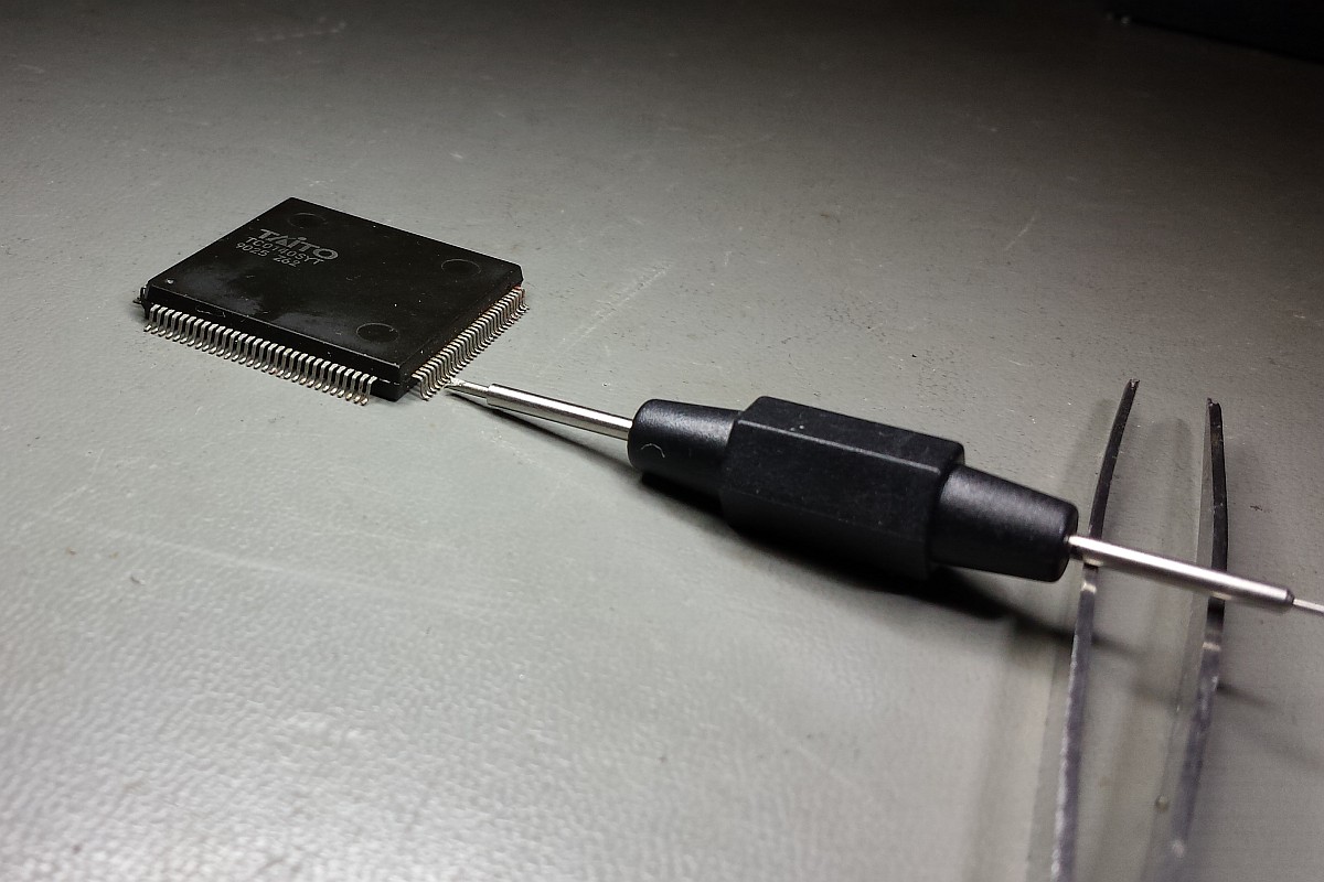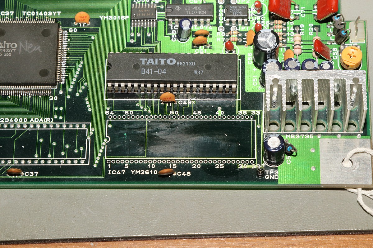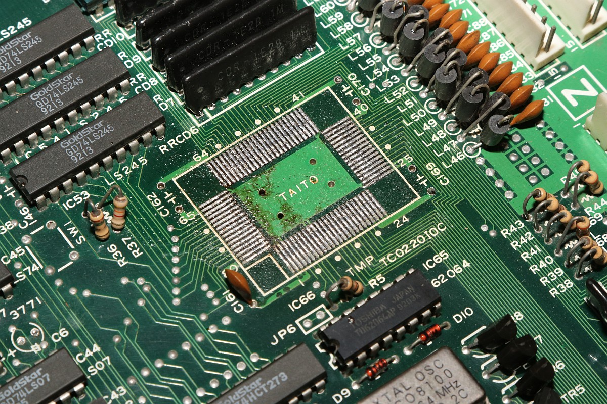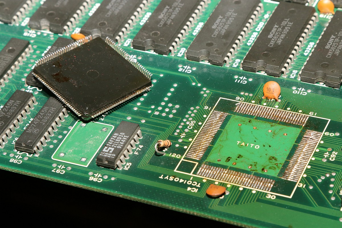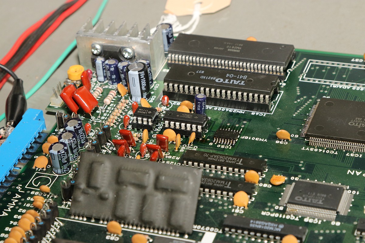 {Bonze Adventure - Tonlos} der Spieletitel klingt irgendwie nach einem reichen unsympatischen Sack... - na ja, ein kleines Dickerchen ist die Hauptperson schon... aber zurück zur Technik: das Spiel ist völlig tonlos und am Verstärker liegt es leider nicht... Wie bei vielen Spielen dieses Herstellers begeistert die Sound-Sektion durch den Einsatz eines gerne defekten Daten-/Adress-Multiplexer-Customs mit dem Namen TC0140SYT und einem nachfolgenden Soundchip YM2610... Der Custom ist am Ausgang tot. Wir benötigen einen Organspender: Der hat schon herhalten müssen - armes Kerlchen... Aber das benötigte Organ ist noch vorhanden: Vorsichtig rausoperiert... Unsägliche Lötversuche am Spender haben ihre Spuren hinterlassen - die Beinchen sind gut verbogen. Das Alter meiner Augen lässt sich sehr gut mit einem hochwertigen Stereomikroskop bekämpfen! Das muss gerichtet werden: Feines Uhrmacherwerkzeug ist von Nöten: Nur mal so zum Vergleich: ein 1/4W Metallfilmwiderstand in der bedrahteten Version... (das waren noch Zeiten...) Alten raus... ...Neuen rein. Das Ergebnis ist leider ernüchternd - es hat jetzt Aktivität auf den Bussen, das Sample-ROM wird angesprochen, aber der YM2610 ist weiterhin stumm. Der nächste Schritt ist offensichtlich... ;-) {Bonze Adventure - das Adventure geht weiter} Das Auslöten des Soundchips ist eine Aktion für sich. die extra-engen Pins verhindern einen Einsatz des Lötsaugers, es geht nur mit dem Heißluftfön. Sockel in diesem Pinabstand sind sehr schwer zu beschaffen. Natürlich habe ich sowas da. Upps... falsche Größe. Egal. Was nicht passt, wird passend gemacht! ;-) Der Custom-Spender dient auch als Soundchipspender - wenn man nicht auf das Platinenmaterial achten muss, dann fällt das Auslöten leichter. Einfach volle Kanne Heißluftfön und nach wenigen Minuten liegt das Spenderorgan auf dem Tisch. Jetzt noch putzen... ... und es ändert sich genau nichts. Mist. Zur Probe schlachte ich noch ein Fußballspiel - man weiß ja nie, in welchem Zustand sich solche Organspender befinden. Aber auch dieser Soundchip sagt keinen Ton. daran lag es wohl auch nicht. Trotz munterer Aktion auf allen messbaren Kanälen kommt aus dem Yamaha nichts raus. Ich bin mittlerweile ratlos und breche die Reparatur nach mindestens 6 Stunden Arbeit erfolglos ab. So kann es halt auch mal gehen in diesem Gewerbe. {Never give up! Never surrender!} Ich wäre nicht ich, wenn ich tatsächlich aufgeben würde! Jetzt, nachdem wieder Aktion auf dem ROM ist, gehe ich die komplette Soundkette durch - Spenderboards habe ich ja jetzt genug. Als Erstes ist der D/A-Wandler dran: Danach haben wir ein Audiosignal am Ausgang - doch die nachfolgenden Operationsverstärker bleiben stumm... Erst nachdem ich beide OP-AMPs getauscht hatte, kam der Sound astrein bist zum Leistungsverstärker - ich frage mich, wie das wohl kaputt gegangen sein mag... Immerhin war das Sample-ROM MN234000 einwandfrei lesbar und in Ordnung - es lässt sich als 27C400 auslesen! Oben habe ich mal die getauschten Bauteile markiert - viel Arbeit für etwas Ton... |