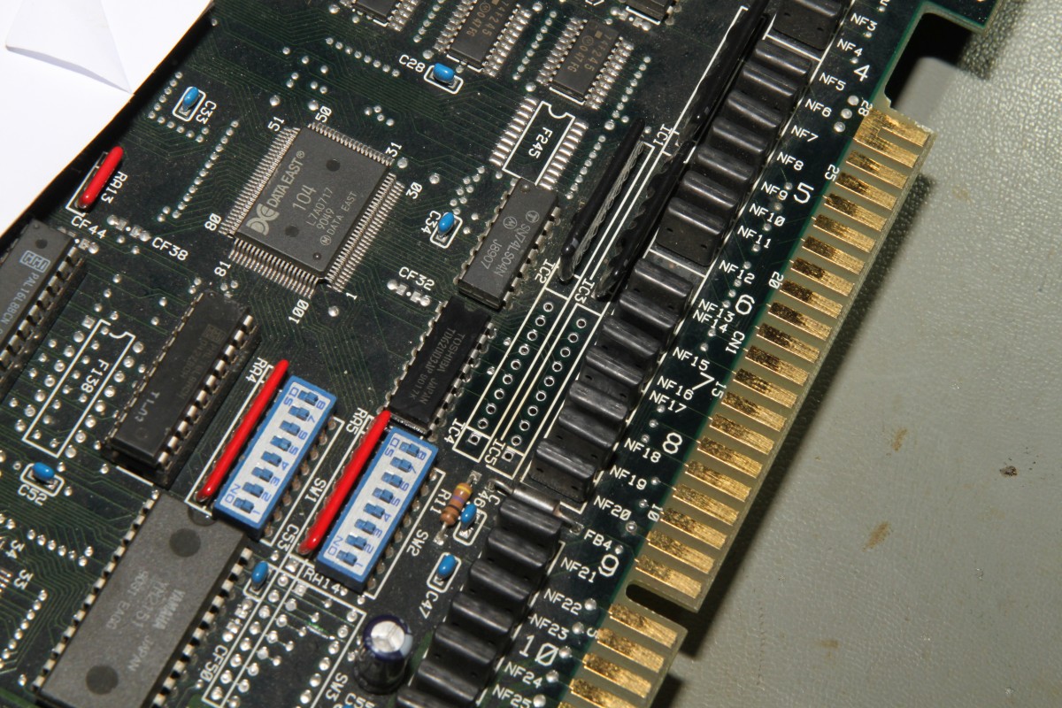 {Data East Caveman Ninja} Mal wieder eine Reparatur, bei der eindeutig ist, warum sie nötig wurde. Caveman Ninja von Data East - ein wüstes Custom-Grab. Angeblich funktionieren Button 1 und Button 2 nur gemeinsam, also der Caveman springt immer beim Schießen... Die elektronische Inspektion ergibt ein Signal bei beiden Knöpfen, egal, was man drückt... Die optische Inspektion ergibt Kohlenstoff und Ruß, wo er nicht hingehört. Das passiert immer genau dann, wenn man bei diesen PCBs den JAMMA-Stecker verkehrt herum aufsteckt! Dan ballern die 12V für den Audio-Amp auf die Button-Kanäle... Meist reißt es dann den Custom 104 mit, der blockiert zuweilen dann auch den CPU-Datenbus... Erstmal die Leiche ausgelötet - Ersatz hab ich leider keinen. Bei den funktionierenden kommt aber auch blos Low raus, wenn man den Eingang gegen Masse brückt... Vermutlich ein Pullup mit Filter, ggf. mit Transistor - Egal... Ich probiere einfach mal die einfache Variante: 100 Ohm als Strombegrenzung Richtung 104 und einen 10k Pullup am Eingang. Versuch macht kluch! Und was soll ich sagen? Es funktioniert! {DATA EAST RCDM-I107} Weil ich immer alles genau wissen will: Heißluftfön auf 220°C, feiner Uhrmacherschraubendreher und der Lack geht prima ab! Von beiden Seiten... Die SMD Teile unter dem Mikroskop - Kennung A5 ist unmissverständlich... Duale schnelle Schutzdiode - alles was hier über 5,6V ist, fließt gegen +5V ab... Da kommt bei 12V ganz schön was an Strom raus... Das ist der Schaltplan - ich lag als gar nicht so falsch. Funktioniert natürlich auch ohne Kondensatoren und Schutzdioden. |