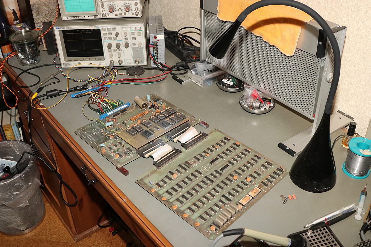 {Galaxian} Keine Reparatur ist wie die Andere - und heute habe ich eine Galaxian auf dem Tisch, die auch nicht ist, wie viele andere: Hier das ROM-Board mit der Besonderheit 2708-EPROMs - das heißt in der Konsequenz drei Versorgungsspannungen: 5V, 12V und -5V... Diese müssen separat zugeführt werden - ein wenig unpraktisch! Dafür gestaltet sich der Laboraufbau servicefreundlich - wenn man genug Platz auf dem Tisch hat. Der Kunde meinte, er hätte RAM Fehler 2, das kann ich nicht bestätigen. Geht doch, oder? Die Sprites der angreifenden Schiffe sehen etwas komisch aus: Yepp. Da ist was faul an der Sprite-Adressierung... Das Adressbus-Latch ist teilweise stuck-high - da könnte die Huckepack-Lösung helfen... War ja klar... ein Signetics "SA". Prone to fail! So muss Galaxian: Wie jedem sofort ersichtlich ist, hier befand sich der Fehler. Wo auch sonst? ;-) Und ja, ich habe natürlich nicht das Huckepack-IC drin gelassen, sondern einen fachmännischen Austausch vorgenommen!!! |