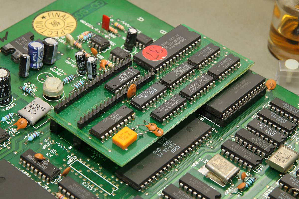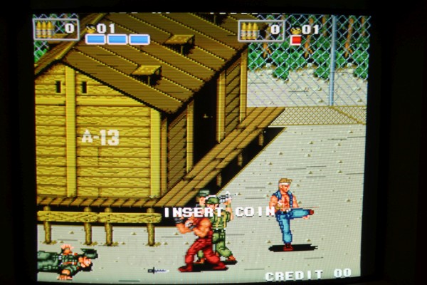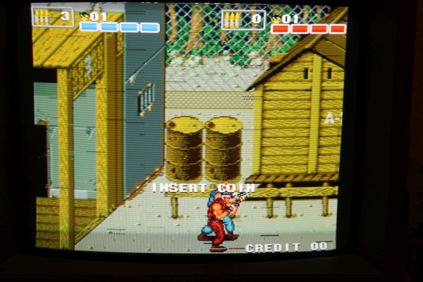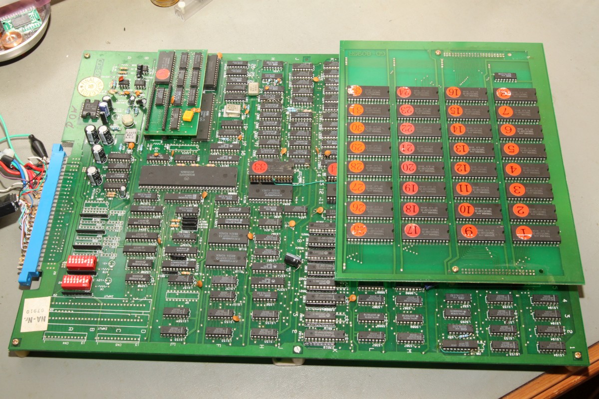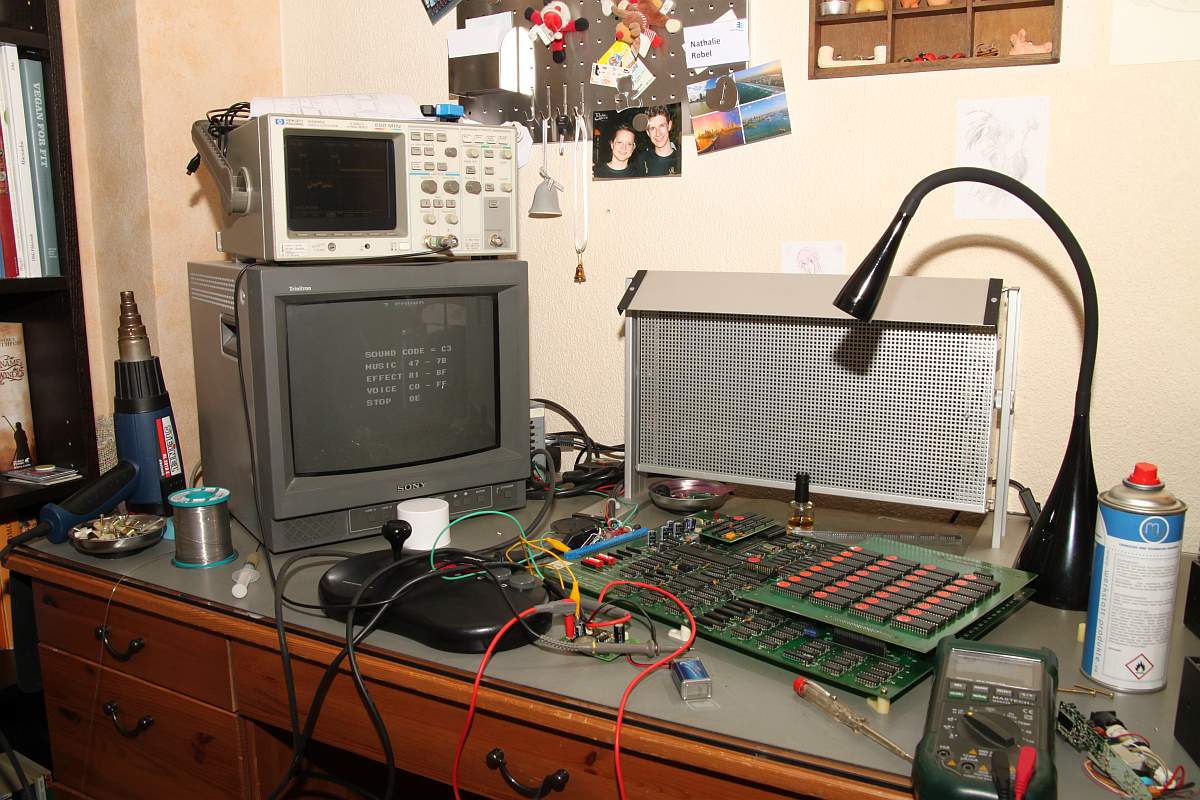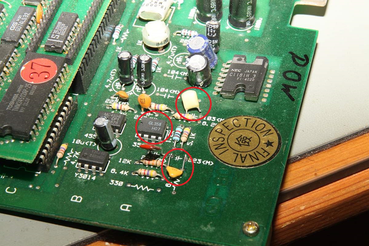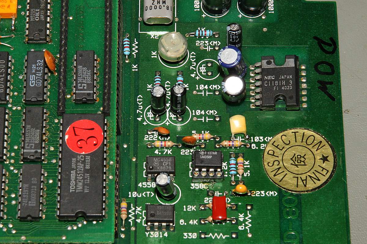 {P.O.W Bootleg} Ebenfalls zur Reparatur zugelaufen: ein Prisoners of War (P.O.W) Bootleg - nicht hübsch, aber immerhin Bild und Ton... die PCB: Putzige Streifen, gleichmäßig über's Bild verteilt - sie bewegen sich, treten sporadisch auf... Wenn ich die Versorgungsspannung von 5,3V auf 4,9V runterdrehe, sind die Streifen fast völlig weg... Die Sprite-Artefakte werde ich ignorieren, sowas ist kaum zu finden und lohnt bei dem Bootleg auch nicht wirklich. Mit 4.8-4,9V tut es ja ganz ordentlich. Aber die Soundprobleme sind heftiger. Es kracht und scheppert, dass sich die Lautsprechermembranen biegen... Gut, dass man bei POW alle Soundcodes im Testbetrieb durchnudeln kann - Musik läuft völlig unauffällig, nur die Samples klingen grauenhaft. Einer davon scheint eine Fehlprogrammierung zu sein - das scheint wohl einer einen Vorzeichenwechsel übersehen zu haben. Das EPROM auf der Tochterplatine ist leider eingelötet, typisch Bootleg - aber daran liegt es nicht, alle Samples klingen mies... Der OKI M5205 macht die ganze Arbeit - der Output sieht gut aus... (bis auf den einen Sprung). Analyse mit Oszi und Audio-Probe... Na super: Ein Kondensator ganz abgerissen, einer am Beinchen ab und das Beste: der Dual OpAmp ist defekt... Daran lag es. |