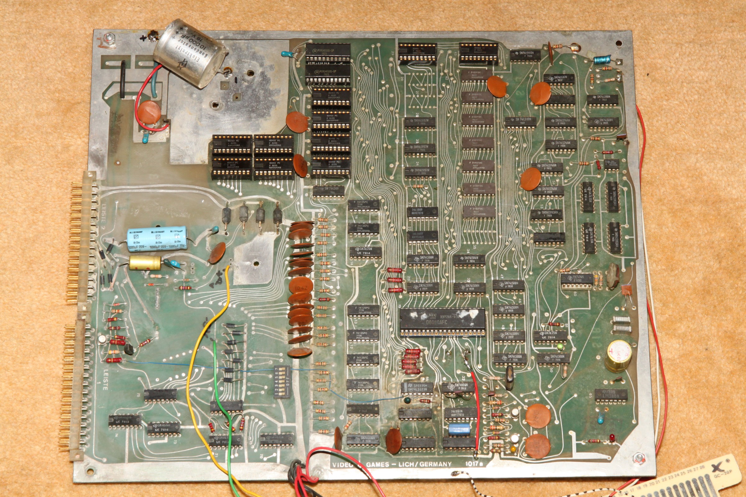 {Lich - eine unbekannte PCB} Von einem ehemaligen Foristo einfach so zugeschickt bekommen: eine Video Games Lich PCB unbekannter Bauart (PCB 1017a) - PROG-RAM: 2xMCM145101 (µPD5101) - CPU: 8080 - Video RAM: 7x2102 1kx1 - Die ROMs sind bipolare PROMs... F93453 = 82S137 (1kx4) - GFX: 29+43 - PRG: 2H+3L / 4H+5L / 76H+78L / 77H+79L. Ein völlig irrer Quarztakt: 20.79 MHz... Anschlüsse über Steckerleisten, Video in S/W... cool alt. Bauteile Codes zwischen 1978 und 1980... Beim Messen schon gleich mal eine Leiterbahn verglüht - egal, sowas hält mich nicht auf... Ein schönes Monster - eigentlich ist nicht viel drauf. Auflösung 2400px... auf Klick! Die Programm-ROMs: Da alle ROMs unbeschriftet waren, hab ich sie erst mal markiert - sonst geht hinterher gar nix mehr... Die IC-Nummern stehen aud der Platine, ganz klein... Eines der Probleme bei 8080-Systemen ist das unsägliche Verhalten bei Reset... wenn da was nicht stimmt, dreht die CPU hohl und macht irgendwas, nur nicht das Richtige. Zwischenzeitlich konnte ich dann sogar mal ein rudimentäres Programmverhalten rauskitzeln... scheint kein spannendes Spiel zu sein.... Die ROMs sind schon mal gedumpt und an MAME geschickt... vielleicht können die Jungs was damit anfangen! Dazu muss ich mir den Aufbau der PCB genau zu Gemüte führen - ohne Schaltplan nicht ganz trivial. Hier die Signalkette DIP-Schalter -> Buffer -> CPU: Hier das dazu gehörige Enable-Signal... Das MAME Team hat die ROMs zum Laufen gebracht: es handelt sich um Video 21, von dem bisher nur ein Satz Flyer bekannt war: Die Emulation hat geschafft, was mir bis jetzt noch nicht gelungen ist: das Spiel läuft! {LICH VIDEO 21 - ROMs} Wen es interessiert: hier sind die ausgelesenen bipolaren PROMs mit Grafik- und Programmcode:
